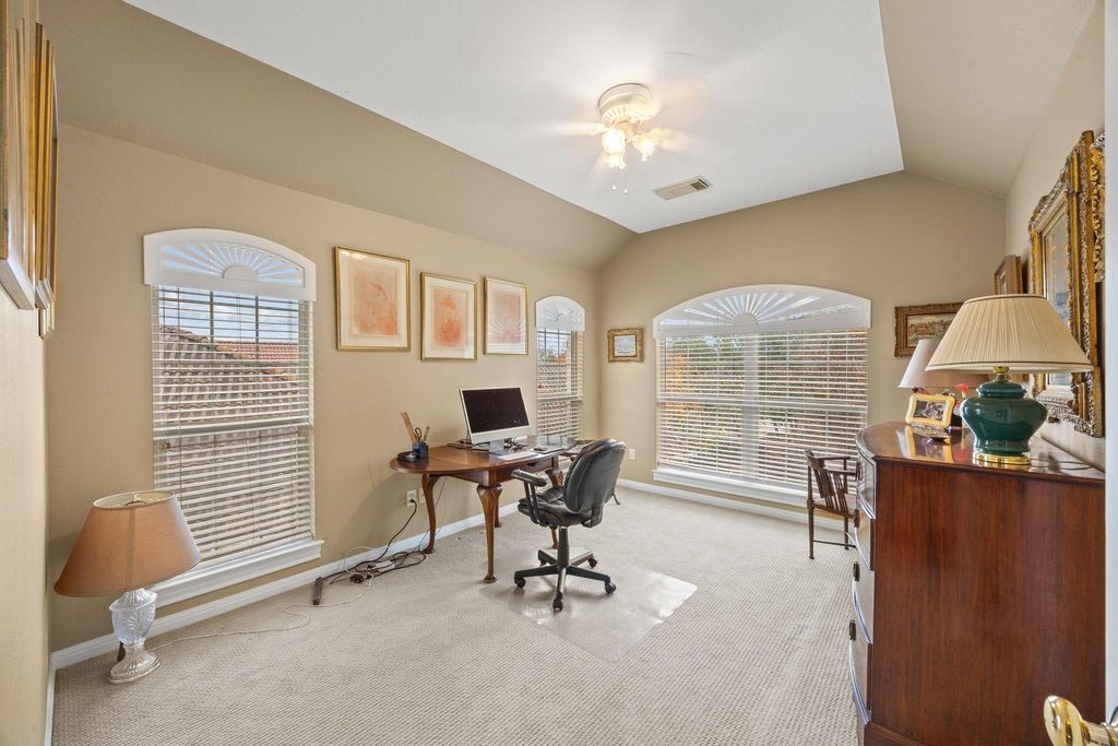 Welcome to this beautifully appointed two-story stand-alone condo in The Greens, a coveted enclave tucked inside the gated Hills of Lakeway community. Designed for easy living and minimal maintenance, this home offers the ideal lock-and-leave lifestyle without compromising on style or comfort. As part of the Hills of Lakeway community, a mandatory Hills Country Club membership of $150 per month provides access to exceptional amenities and an elevated lifestyle. Step inside and you're immediately greeted by a graceful stairway and an elegant dining room lined with a full wall of custom built-ins"”the perfect setting for hosting dinner parties or showcasing treasured pieces. Just off the entry, a dedicated office, with a closet and full bathroom adjacent, provides a quiet retreat for working from home, but its generous size also allows it to function seamlessly as a fourth bedroom if desired. The heart of the home is the open kitchen and living area, where abundant natural light highlights the thoughtful layout. The kitchen flows effortlessly into the living space, creating an inviting environment for everyday living and entertaining. From here, enjoy easy access to the backyard, complete with a covered patio ideal for morning coffee, weekend grilling, or relaxing in the shade. The primary suite is a true escape, offering a spacious layout, a double vanity, and a large walk-in closet outfitted with custom drawers and shelving"”a beautifully tailored space designed to keep everything organized. Upstairs, two additional bedrooms share a well-appointed bath, providing comfort and privacy for family or guests. Perfectly positioned within this private, gated community, and close to neighborhood amenities, 205 The Hills Drive delivers both ease and elegance"”lock, leave, and love where you live.