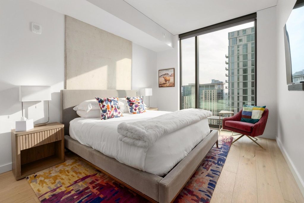 Experience elevated living at The Modern Austin Residences in this stunning, fully furnished 2-bedroom, 2-bathroom unit with immaculate finishes throughout. Floor-to-ceiling windows and a private balcony showcase beautiful views of Lady Bird Lake and offer a front row seat to the vibrant Rainey Street skyline. The heart of the open floor plan is the modern kitchen equipped with exquisite wood cabinetry, an oversized island with seating, and striking quartzite countertops and backsplash. High-end stainless-steel appliances include a Sub-Zero refrigerator, a Wolf oven and microwave, and a Bosch dishwasher. The primary suite is a serene retreat featuring a luxurious bathroom with dual sinks, custom cabinetry, and an impressive wet room with a soaking tub and walk-in shower surrounded by beautiful tile accents. A walk-in closet with custom built-ins maximizes storage and functionality. Customizations extend to the second bedroom's closet and the pantry with more built-in storage. Additional comforts include a whole-home Sonos AV system, an Electrolux washer and dryer, and electric solar shades in every room, with blackout shades in the primary bedroom. Residents enjoy resort-style amenities, including a pool and spa, concierge services, fitness center, dog run, business center, indoor and outdoor lounges, guest suites, grills, kitchen facilities, and a speakeasy on the 35th floor. A dedicated parking space in the secured garage completes this remarkable offering. Set in one of Austin's most coveted locations, this residence places you moments from downtown dining, shopping, and entertainment with effortless access to the Hike-and-Bike Trail for lakeside recreation.