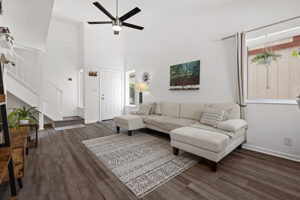 Renovated two-bedroom condo for sale in North Austin, a short drive from both The Domain and Walnut Creek Park, with easy access to I-35 and US 183. This bright home offers a comfortable layout with thoughtful updates throughout and lots of windows. Downstairs features high ceilings and an open floorplan, new LVP flooring installed last year, along with a renovated kitchen consisting of new cabinetry, backsplash, and countertops. All appliances were replaced a several years ago. A half bath downstairs is perfect for when company comes over. Upstairs, the primary bedroom includes a walk-in closet with direct access to the full bathroom, with the secondary bedroom being just down the hall. One of the standout features, unique to this unit, is the 160-square-foot enclosed sunroom with a portable AC unit. It opens to a private, fenced backyard with a garden and patio, the ideal place to hang out after a long day. The home also includes a two-car garage and is located a short walk from the community pool. The HOA fees cover water, sewer, front yard lawn maintenance, as well as the community pool maintenance. Please see attached docs for list of updates. If you're looking for a condo in a central location with great outdoor space and solid updates, check this one out!