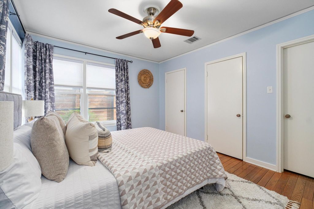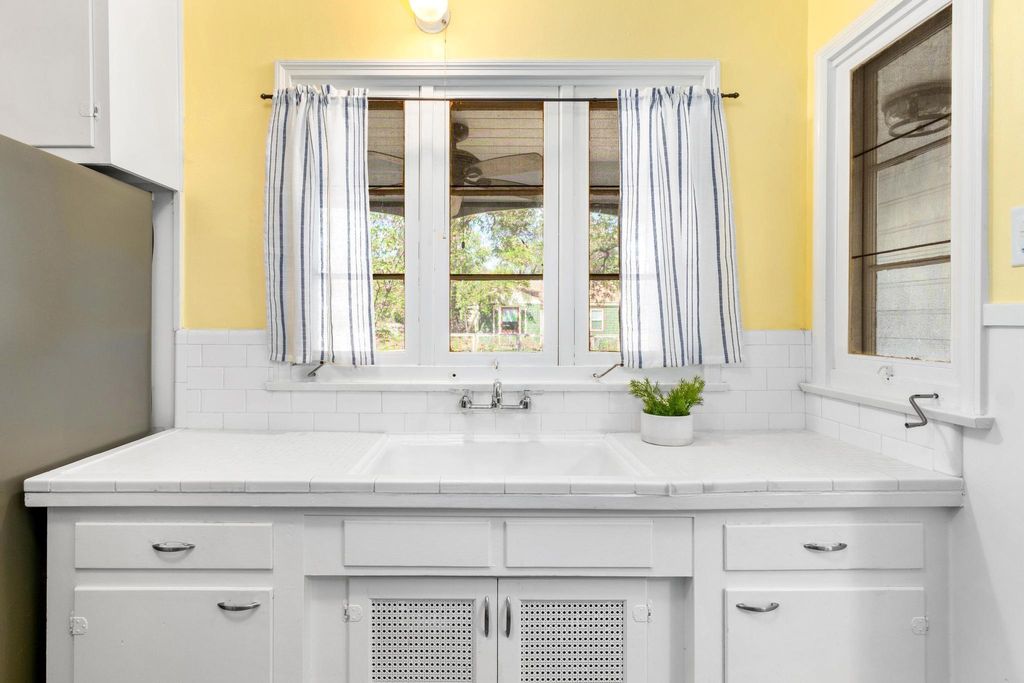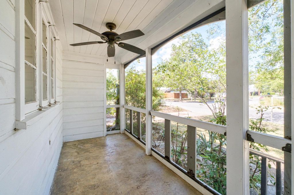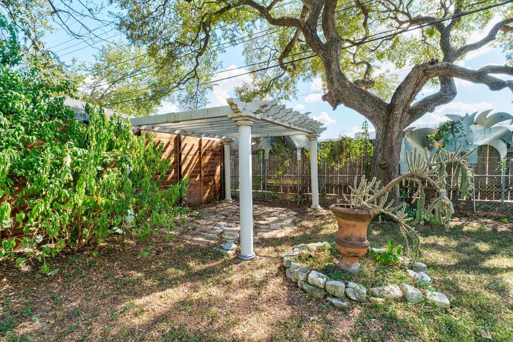 Classic 1940s bungalow with charming architectural details including picture rail molding, built-in shelving, telephone niche, fireplace surround, and tile bathroom floors. The interior features two bedrooms and two full bathrooms, plus a generous flex room, indoor laundry room, and solid hardwood floors. Outside you'll find extra space in the detached 1-car garage, workshop, and shed, along with an in-ground irrigation system. The roof and many major appliances have been replaced within the last several years: 30-year architectural shingle roof (both main house and garage) and tankless water heater 2022; dishwasher, washer, & dryer 2023; fridge 2024; range 2025. Fridge and washer/dryer convey! Convenient central Austin location is approximately 2.5 miles to UT campus and 3 miles to downtown, with multiple bus stops within a half mile. Walk Score of 83/100 (considered "very walkable" and "very bikeable") on walkscore.com, with a variety of dining and entertainment options less than a mile away including Jo's Coffee, Allday Pizza, Hyde Park Bar & Grill, In-n-Out Burger, Lazarus Brewing Co., and Quack's 43rd Street Bakery.