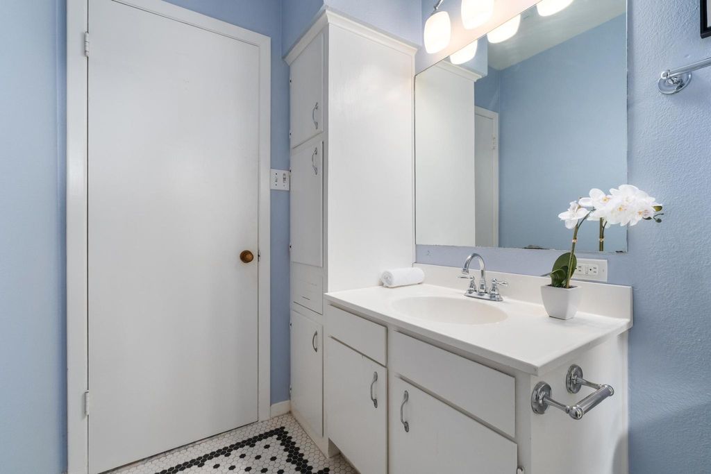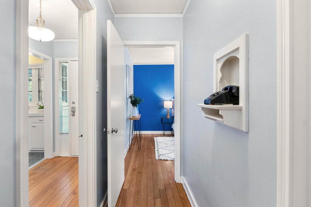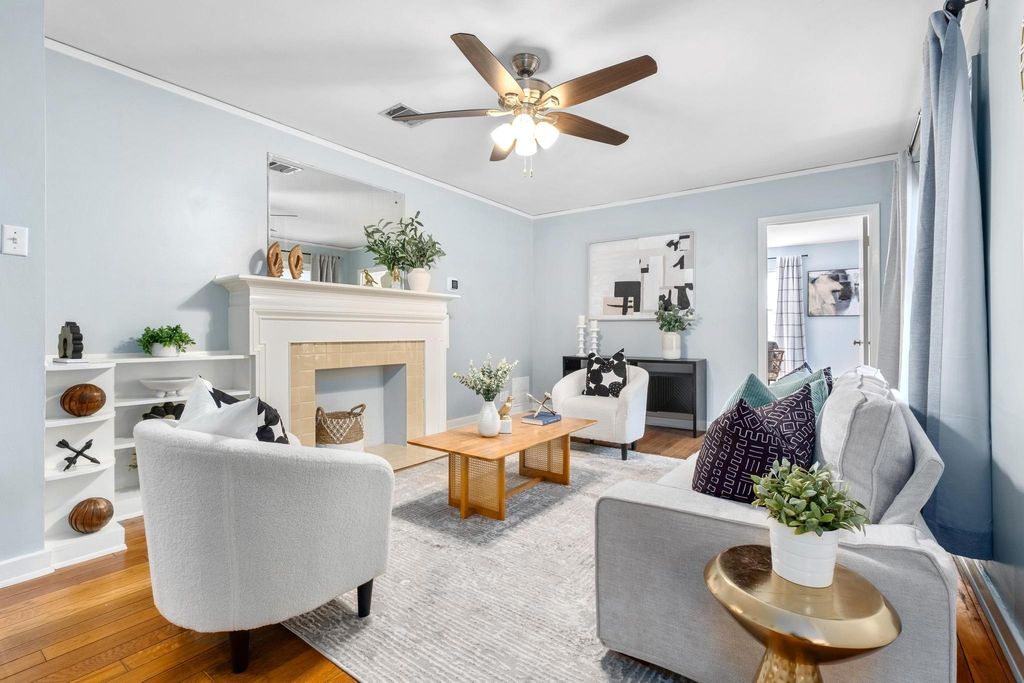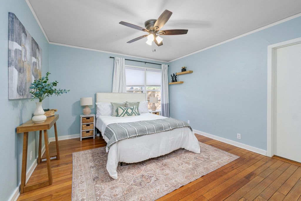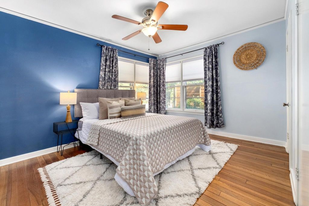 Classic 1940s bungalow with charming architectural details including picture rail molding, built-in shelving, telephone niche, fireplace surround, and tile bathroom floors. The interior features two bedrooms and two full bathrooms, plus a generous flex room, indoor laundry room, and solid hardwood floors. Outside you'll find extra space in the detached 1-car garage, workshop, and shed, along with an in-ground irrigation system. The roof and many major appliances have been replaced within the last several years: 30-year architectural shingle roof (both main house and garage) and tankless water heater 2022; dishwasher, washer, & dryer 2023; fridge 2024; range 2025. Fridge and washer/dryer convey! Convenient central Austin location is approximately 2.5 miles to UT campus and 3 miles to downtown, with multiple bus stops within a half mile. Walk Score of 83/100 (considered "very walkable" and "very bikeable") on walkscore.com, with a variety of dining and entertainment options less than a mile away including Jo's Coffee, Allday Pizza, Hyde Park Bar & Grill, In-n-Out Burger, Lazarus Brewing Co., and Quack's 43rd Street Bakery.