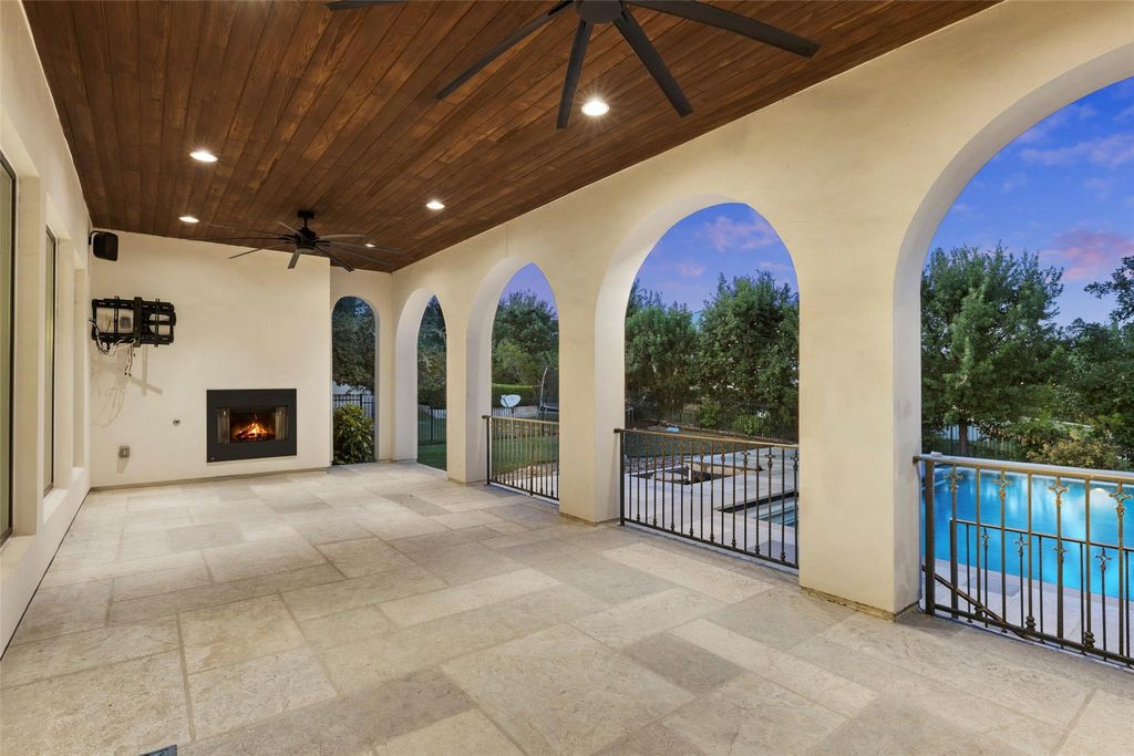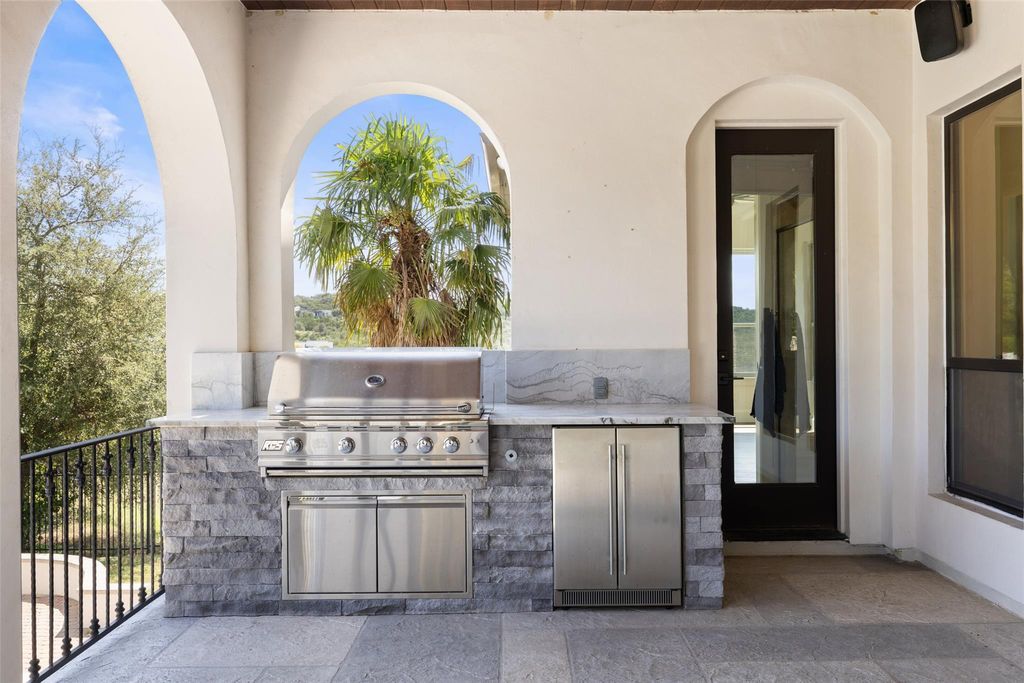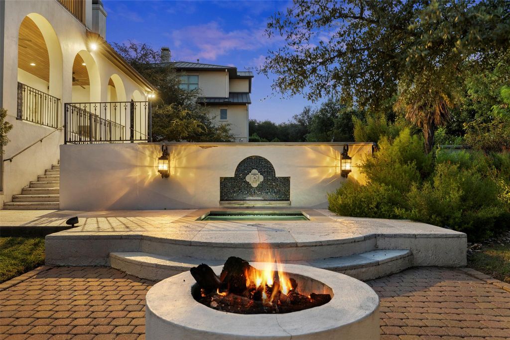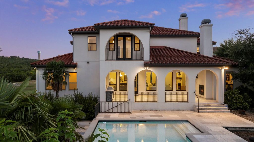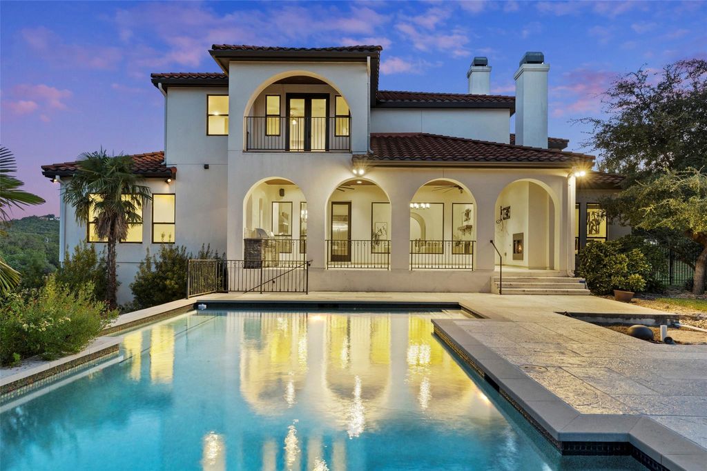 Located in the prestigious Serene Hills community of Lakeway, this 5-bedroom, 5.5 Bath home combines luxury with Hill Country tranquility while offering easy access to top-rated schools, scenic trails, and the dining, shopping, and entertainment of Lakeway and nearby Bee Cave. Set at the end of a quiet cul-de-sac, the home welcomes you with soaring ceilings, elegant archways, a curved staircase, and abundant natural light flowing into the private office, formal dining room, and open-concept living and kitchen. The updated kitchen features a large island with bar seating, a Viking gas range, stainless steel appliances, granite countertops, a walk-in pantry, and a breakfast nook, while the living room boasts wood floors, beamed ceilings, and a cozy fireplace. The main-floor primary suite provides a private retreat with a spacious walk-in closet and spa-like bath with dual vanities, soaking tub, and walk-in shower, complemented by a second bedroom perfect for guests. Upstairs, a second living area with a wet bar, home theater, balcony, and Texas basement creates the ultimate entertainment hub, joined by three additional bedrooms, one with a versatile bonus room for a study, playroom, craft space, or yoga studio. The backyard is a true oasis with a covered patio, outdoor kitchen, fireplace, spa, sparkling pool, and fire pit, all set against the stunning backdrop of Serene Hills.
