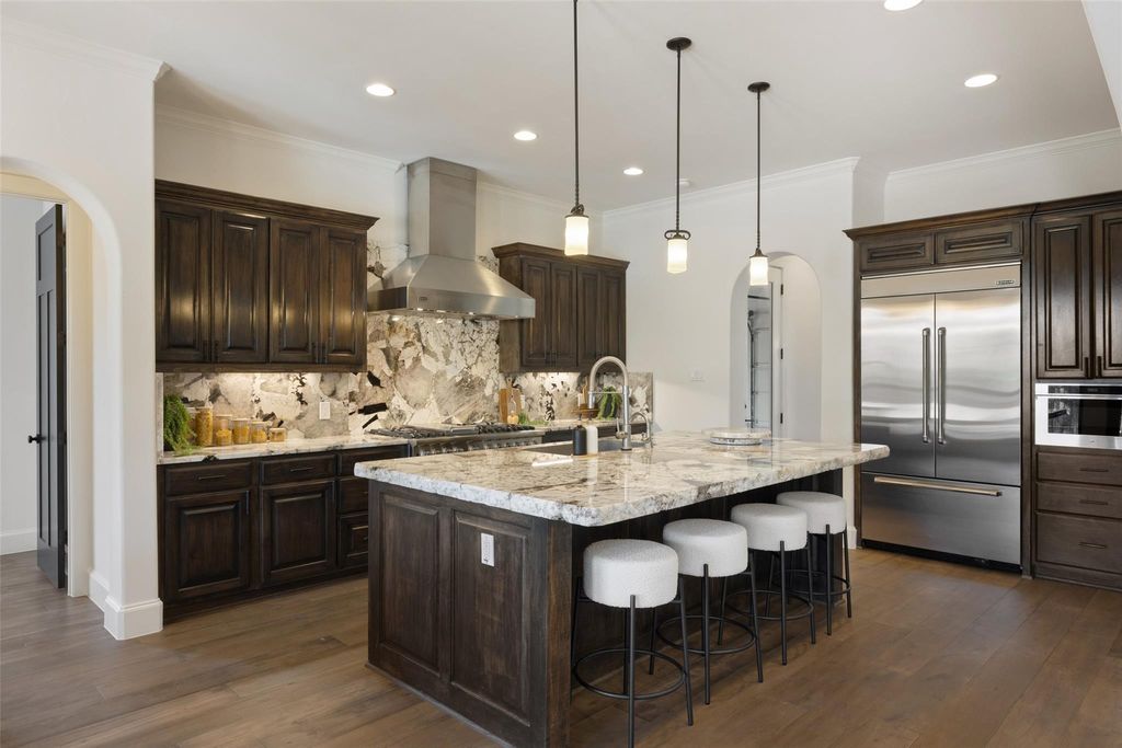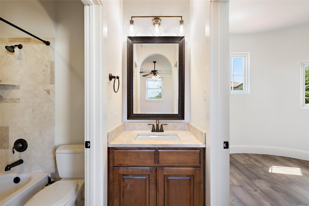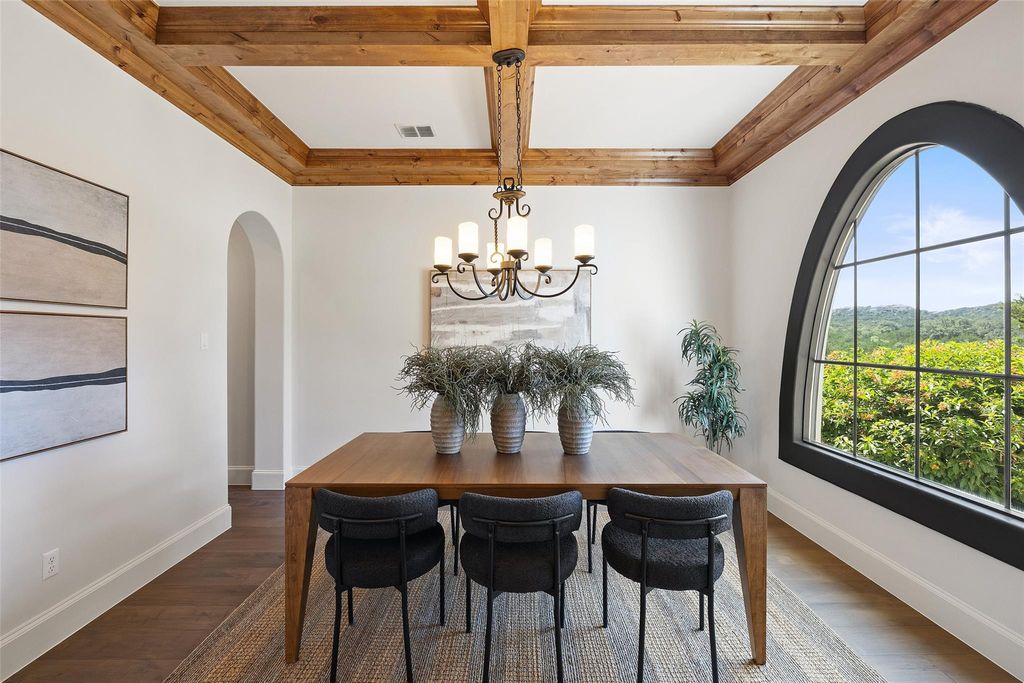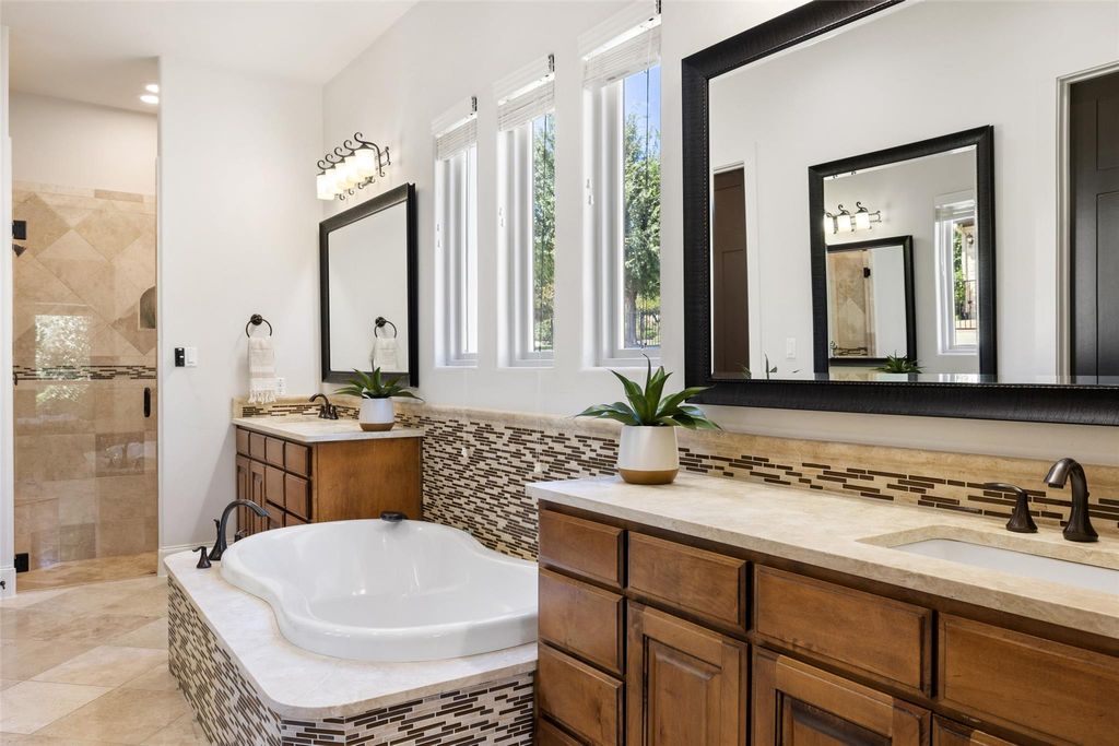 Located in the prestigious Serene Hills community of Lakeway, this 5-bedroom, 5.5 Bath home combines luxury with Hill Country tranquility while offering easy access to top-rated schools, scenic trails, and the dining, shopping, and entertainment of Lakeway and nearby Bee Cave. Set at the end of a quiet cul-de-sac, the home welcomes you with soaring ceilings, elegant archways, a curved staircase, and abundant natural light flowing into the private office, formal dining room, and open-concept living and kitchen. The updated kitchen features a large island with bar seating, a Viking gas range, stainless steel appliances, granite countertops, a walk-in pantry, and a breakfast nook, while the living room boasts wood floors, beamed ceilings, and a cozy fireplace. The main-floor primary suite provides a private retreat with a spacious walk-in closet and spa-like bath with dual vanities, soaking tub, and walk-in shower, complemented by a second bedroom perfect for guests. Upstairs, a second living area with a wet bar, home theater, balcony, and Texas basement creates the ultimate entertainment hub, joined by three additional bedrooms, one with a versatile bonus room for a study, playroom, craft space, or yoga studio. The backyard is a true oasis with a covered patio, outdoor kitchen, fireplace, spa, sparkling pool, and fire pit, all set against the stunning backdrop of Serene Hills.