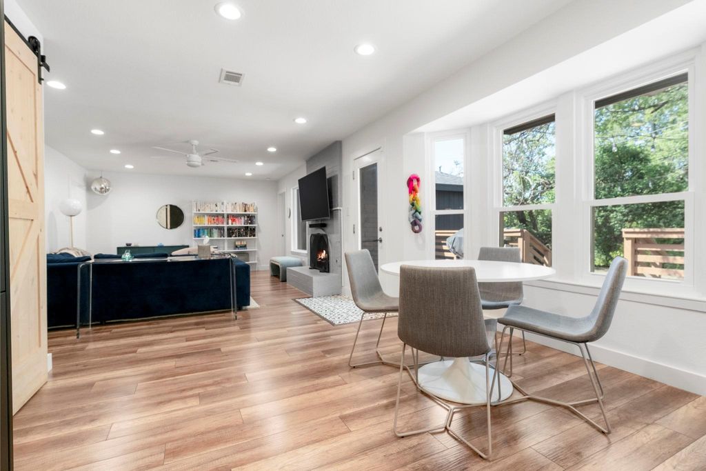 Bright, beautifully remodeled University Hills home on a large lot with mature heritage trees. This 3 bedroom, 2 bath home features an open floor plan with a spacious family room, breakfast area, and kitchen that overlooks a nice deck in the back and expansive private backyard. A large front office/living/dining area with oversized windows, recessed lighting throughout, and also a 2-car garage with storage room add both function and flexibility. Recent updates include fresh interior and exterior paint, updated counter top and sink in kitchen with stainless appliances, double sink added in the primary bath, new bay windows, added attic insulation, outdoor lighting, and pest prevention services. True privacy in bedrooms-walls are thick and you can't hear a peep from one bedroom to the other or from the outside. Quiet and private yet close to everything"”just 5 minutes to Mueller and 15 minutes to downtown, the Domain, East Austin, and the Triangle. With plenty of space for entertaining, true privacy in bedrooms, and a backyard that backs to a creek with wildlife, this home blends comfort, convenience, and charm.
