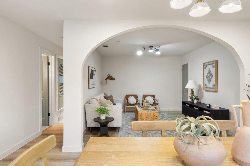 Welcome to this beautifully remodeled single-story home that blends modern design with everyday comfort. Featuring two spacious bedrooms and designer finishes throughout, this move-in-ready residence showcases luxury vinyl plank (LVP) flooring, new windows, and new interior and exterior doors for a fresh, contemporary feel. The inviting living room is highlighted by an elegant arched doorway, adding architectural charm and a seamless flow through the home. The primary bedroom offers a private en-suite bathroom, thoughtfully updated with designer tile selections and stylish fixtures. Enjoy the convenience of an in-home, separate laundry room, providing added functionality and storage. Step outside to a private backyard with a brand-new fence, perfect for relaxing, entertaining, or creating your own outdoor retreat.