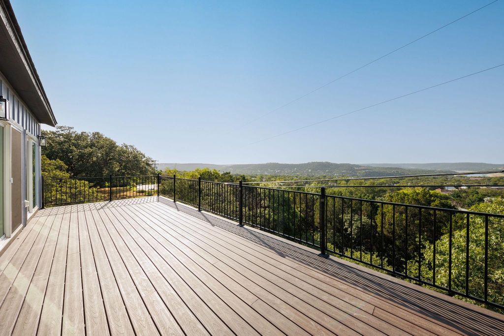 Wonderful and unique home with breathtaking view of Hill Country and Lake Travis from the kitchen, the dining area, the living room, and the jumbo balcony! Modern design with two master suites (one up, one down), kitchen open to living, recessed lighting, 5 bedrooms, an office, and 3.5 bathrooms. Hard flooring throughout. Lots of trees, fabulous landscaping opportunities. A gem in fast-growing Jonestown!