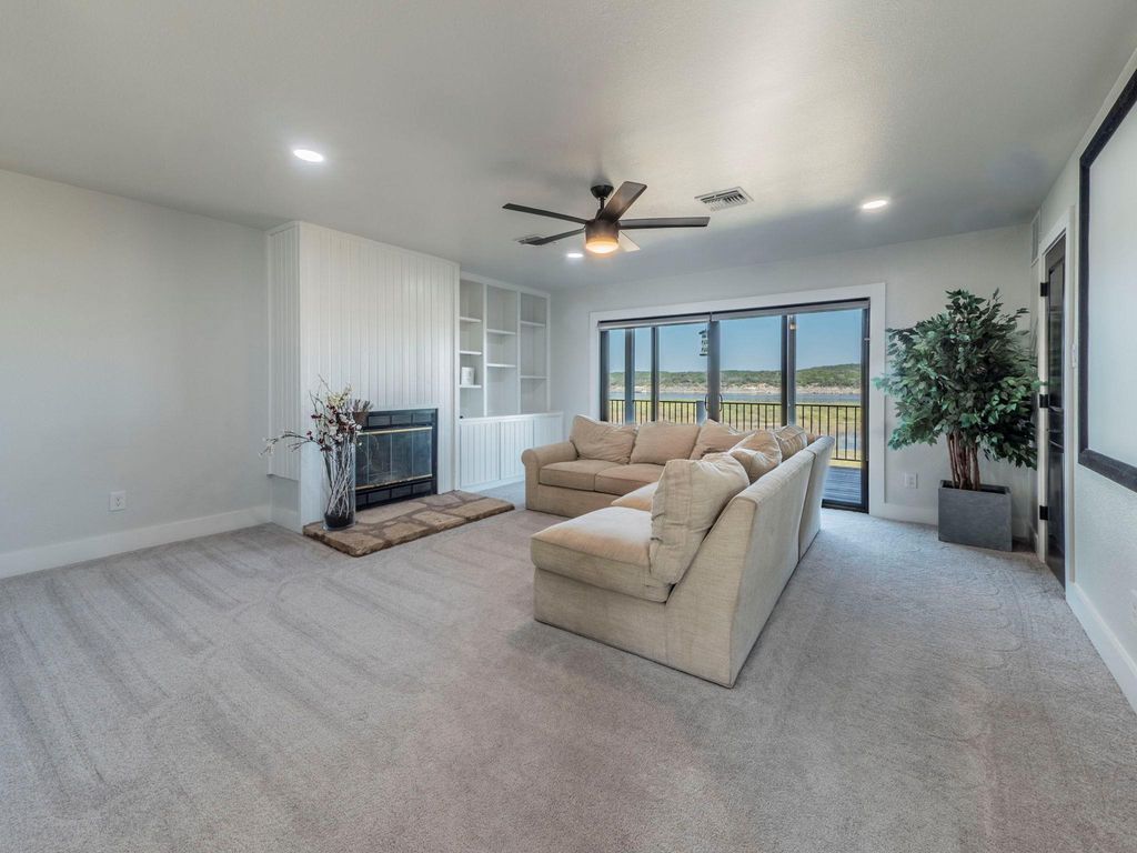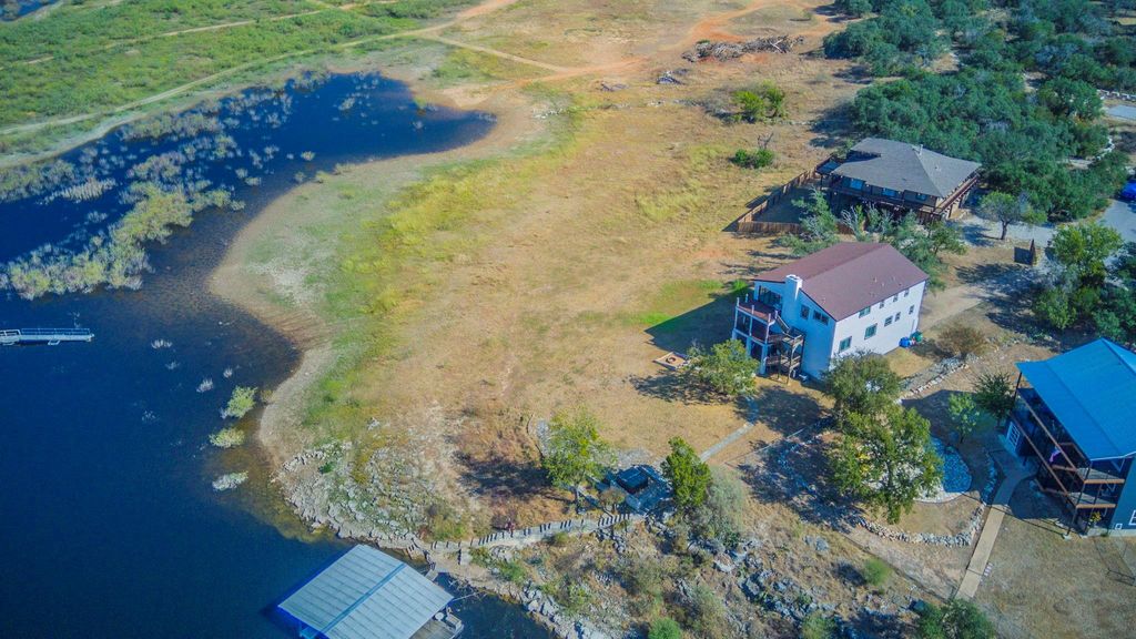Discover your deepwater lakefront home located in this private and secluded cul-de-sac in Lago Vista, TX. The 4,087 sq. ft. residence boasts five spacious bedrooms and three luxurious bathrooms, with additional half baths perfect for accommodating family and guests. The open floor plan is designed to maximize comfort and functionality. The modern kitchen offers sleek countertops, a beverage & wine fridge, ice maker, over sized island, and ample cabinetry, making it a focal point for entertaining. Enjoy breathtaking views from the oversized windows in the dining area and cozy up in the inviting living room, complete with a fireplace for those cooler Texas evenings. This home also has an additional living room along with it's own dedicated fireplace. The home features an extra deep 2 car garage with a lockable storage area and full epoxy floor. The home also offers 2 seperate laundry connection locstions. The large bedrooms offer plenty of space and abundant natural light, providing a serene escape for relaxation. Each bathroom is a statement of sophistication with contemporary fixtures and premium materials. Step outside to a generous yard, ideal for playing or hosting gatherings with friends and family. The large covered balconies on all levels offer picturesque vistas overlooking the lake, the hill country, and across the lake the beautiful Pace Bend Park, were you'll never have development. Cozy up in the cool evenings to the built in limestone fire pit, or relax in the hot tub perched just above the deep water cove. The home comes with a large floating dock with 2 boat slips and lifts, storage locker, and PWC lift. Located in a family-friendly community renowned for its excellent schools. The neighborhood provides a peaceful retreat whether you're lounging on the expansive decks or exploring the beautiful outdoors nearby, this property offers everything. The currrent lake level is 670 ft msl on 10-22, which leaves approx. 40 ft of water beneath the dock.