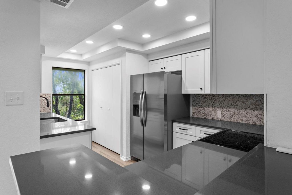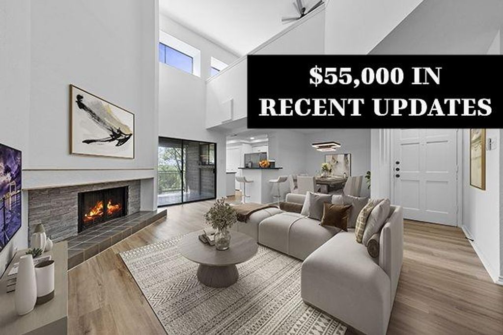 Step into this modern, refreshed, elegant, and inviting 2BR, 2BA condo with luxury finishes throughout and a sun-drenched living area framed by a sweeping wall of windows and cozy fireplace. A chef's-ready kitchen was recently modernized with white shaker cabinets, Frigidaire appliances, sleek gray quartz countertops, and designer backsplash. Two newly remodeled baths feature light gray shaker vanities, white quartz countertops and new fixtures. Clean, low-maintenance luxury vinyl plank flooring throughout (no carpet!!), all electric. Savor sweeping hill-country views from the large, covered private patio that's a perfect for morning coffee or evening relaxing. The primary bedroom is conveniently located on the main level, and the second bedroom is upstairs, both with their own bathrooms and spacious closets. Assigned covered parking with storage and a seamless no-stairs entry for added convenience. Relax or entertain at the community pool set within serene and beautifully maintained surroundings. Nestled in the upscale Northwest Hills neighborhood, this condo puts you moments from major roadways and offers effortless access to The Arboretum, The Domain and downtown Austin. Superb schools are a bonus ... Hill Elementary, Murchison Middle and Anderson High are nearby, and well-rated.