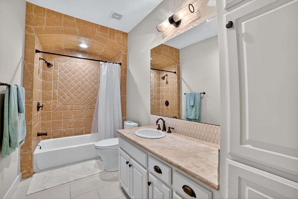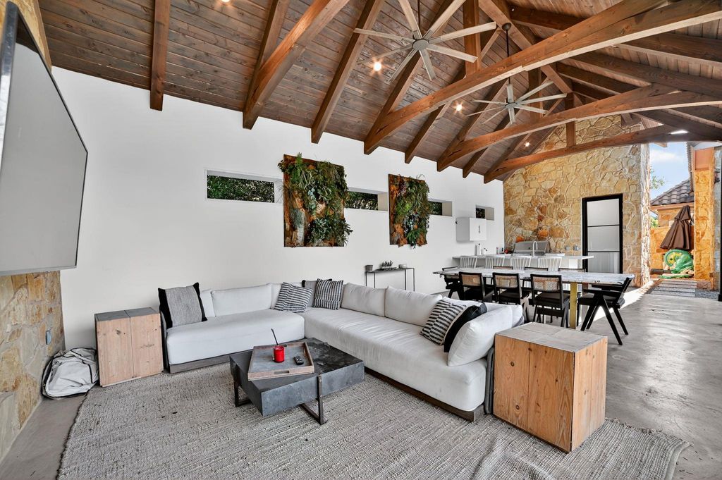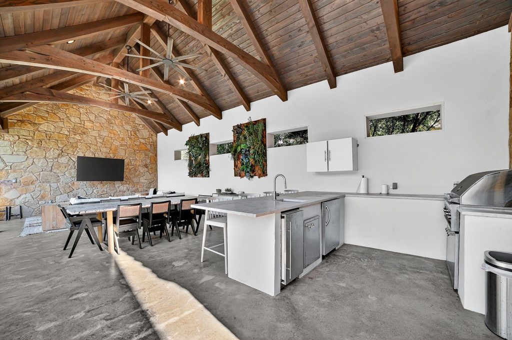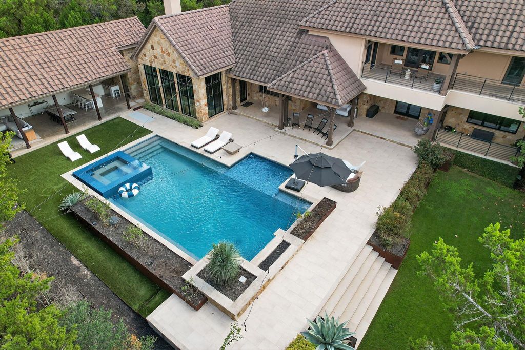 Secluded within Barton Creek's prestigious Calera neighborhood, this 5-bedroom, 6-bath residence spans 5,603 square feet of thoughtfully designed living space. The main level showcases a serene primary suite with a fireplace and sitting area, an executive office, and a welcoming guest suite with a private bath. The open-concept kitchen is tailored for both daily living and entertaining, featuring a built-in refrigerator, Wolf range, espresso machine, and butler's pantry with a bar area nearby. A formal den off the dining room, anchored by a dual-sided fireplace, provides an elegant setting for quiet conversation or evening gatherings. Upstairs, three additional bedrooms surround a generous den"”ideal for a lounge or play space. The primary suite's spa-inspired bathroom includes dual vanities, a soaking tub, and an expansive walk-in closet designed for organization and calm. Beyond the glass doors lies an outdoor retreat crafted for relaxation and connection. A sparkling pool with a cascading waterfall, hot tub, and an extensive pavilion with vaulted beams, an outdoor kitchen, dining area, and full bath create a seamless extension of the home. A manicured lawn adds the finishing touch for recreation or quiet reflection. The property includes a three-car garage and social membership to Barton Creek Country Club, offering access to premier dining, golf, and wellness amenities"”just minutes from the Omni Barton Creek Resort.