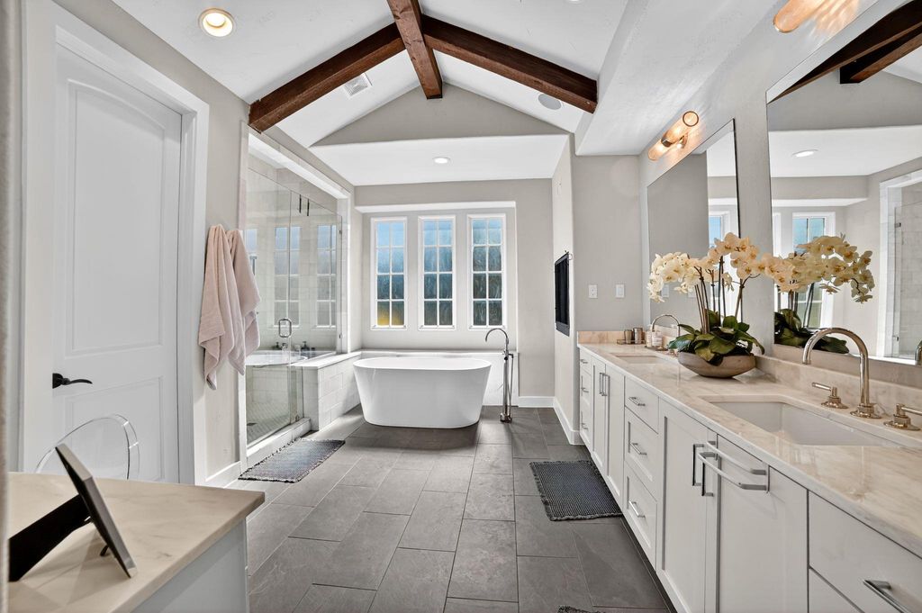 INTERIOR | Beamed Ceilings, Bookcases, Breakfast Bar, Ceiling Fan(s), Crown Molding, Entrance Foyer, High Ceilings, Open Floorplan, Pantry, Recessed Lighting, Soaking Tub, Stone Counters, Walk-In Closet(s), Wet Bar |