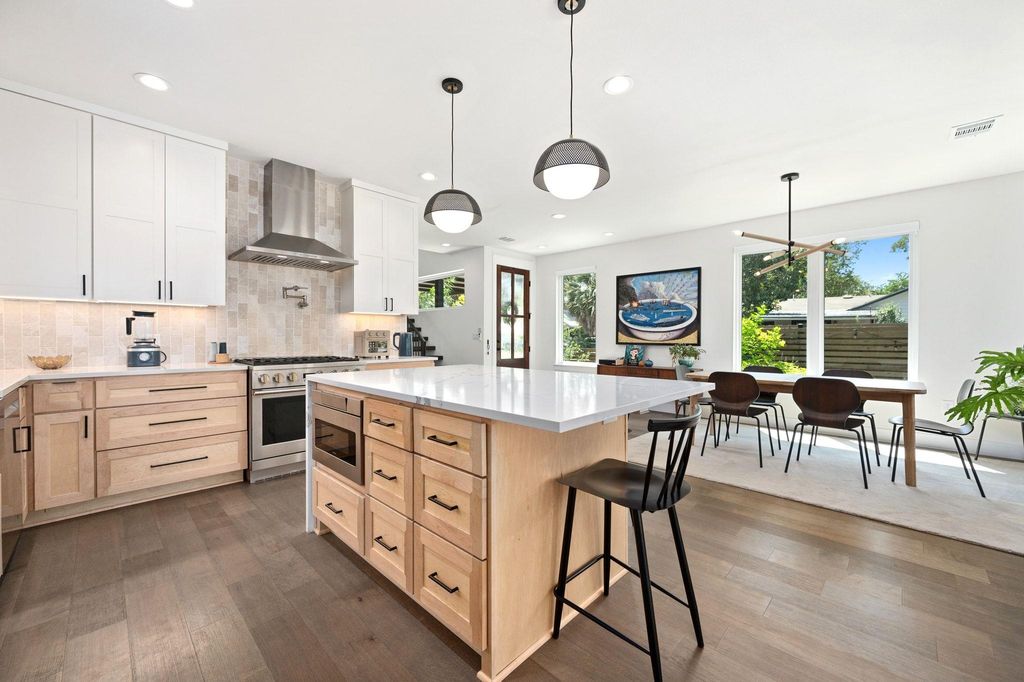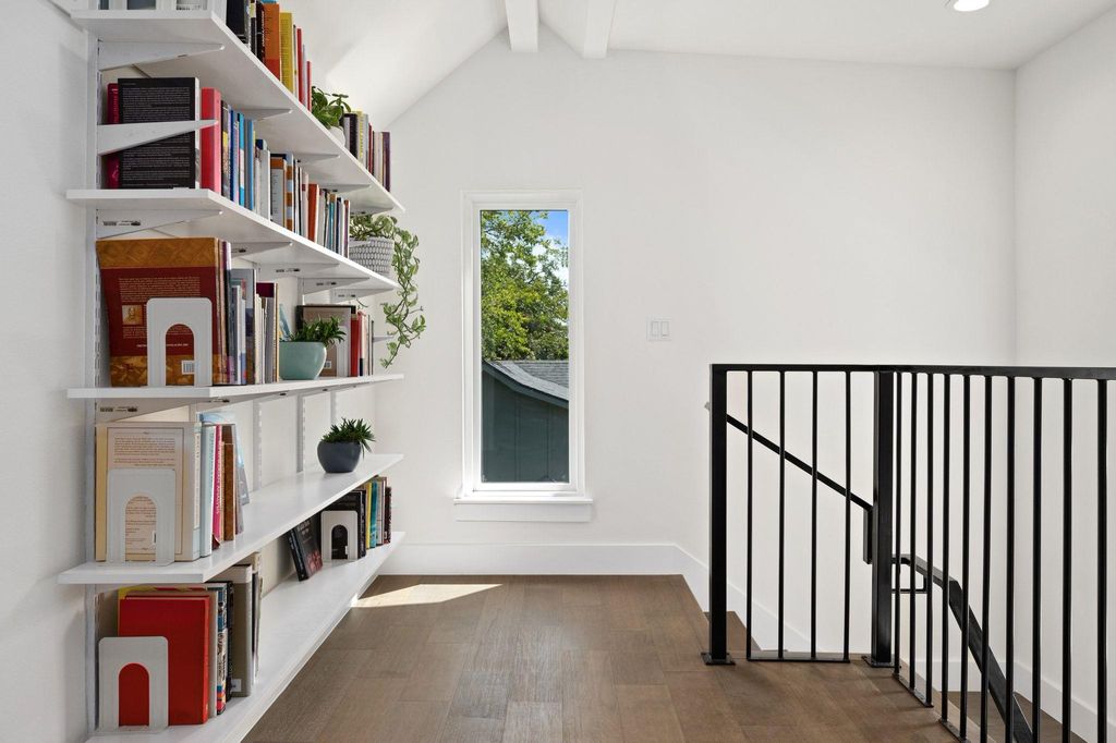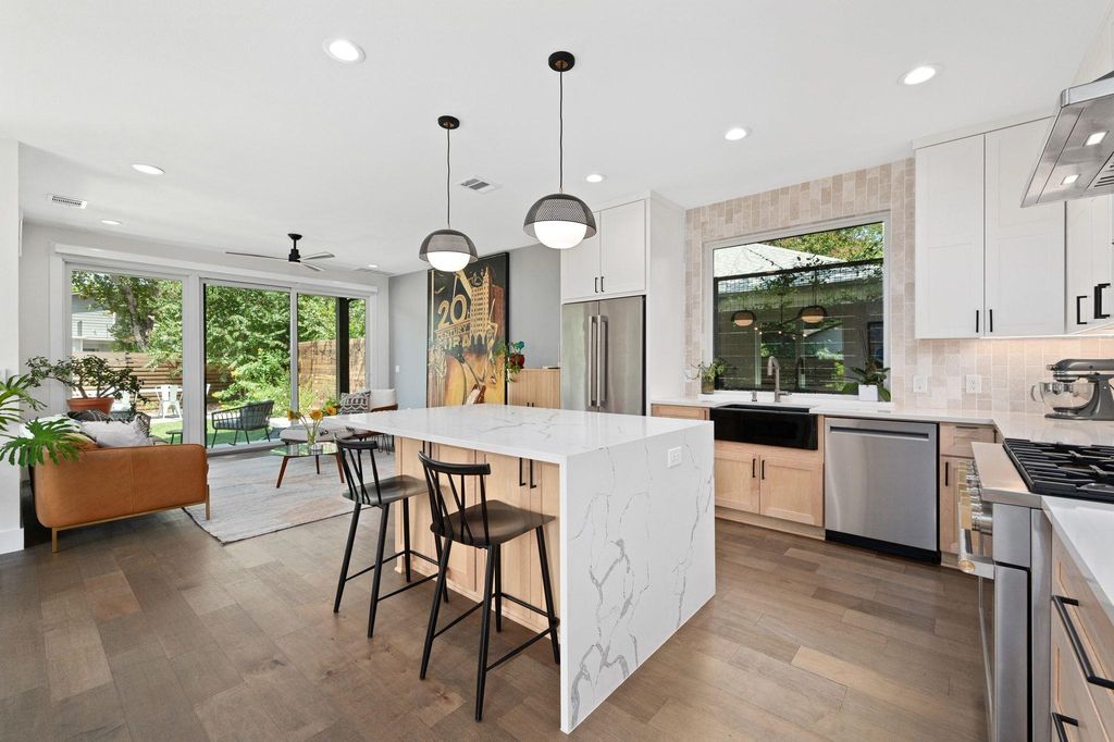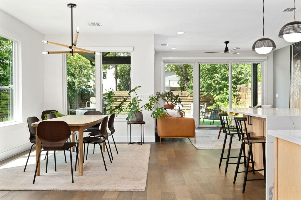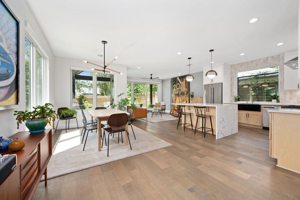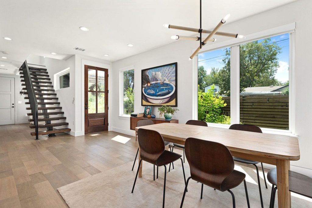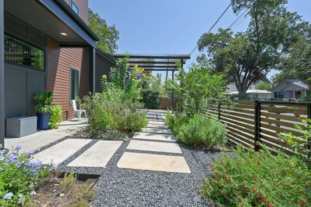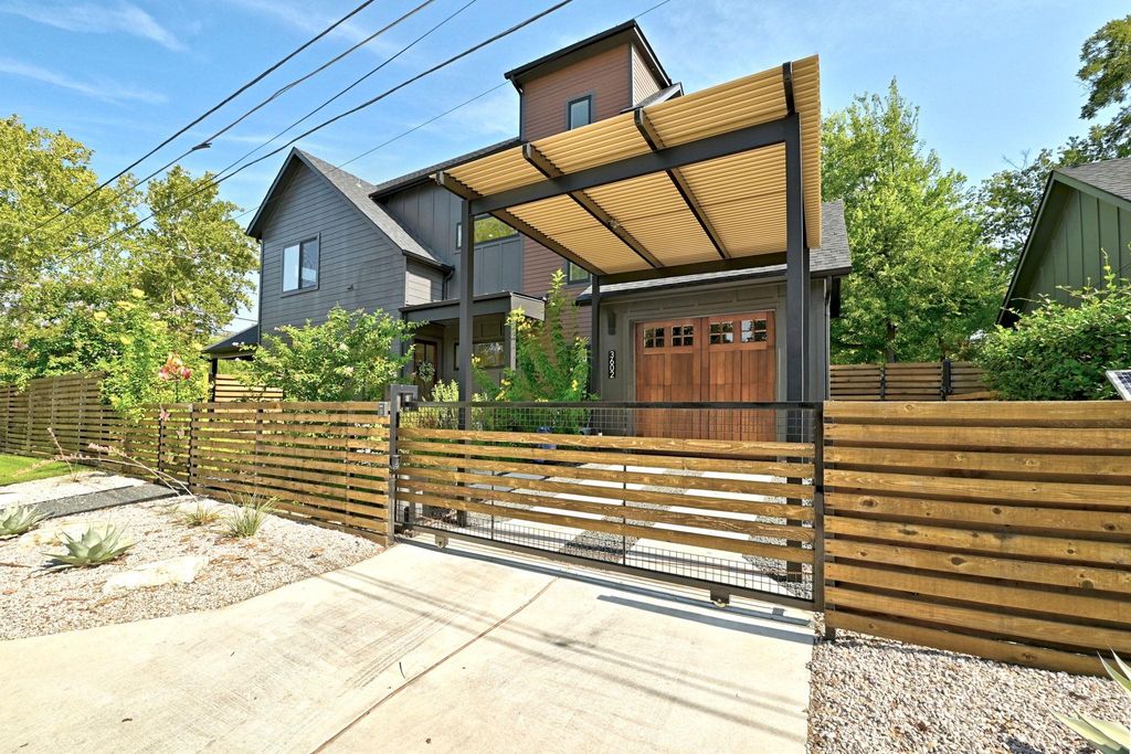 Don't miss this peaceful oasis, 2 yr old, 4BR/3BA, modern home in a quiet, established, mature-treed neighborhood, experiencing a wide array of residential/commercial/retail improvements. Exterior features large breathtaking, low maintenance, native landscape attracting butterflies & hummingbirds, limestone pavers, garden dining area, shed, & wrap around covered porch with built in gas grill & sink for morning coffee & evening dinner. Enter the home to find an open floor plan with luxurious engineered wood floor, modern light fixtures & streaming natural light via walls of windows with automated roller shades that open to the enticing garden. Kitchen boasts Jennair stainless steel appliances, 6 burner gas range with pot filler, an expanse of Kent-Moore shaker cabinets & dovetailed drawers, farmhouse sink, 3cm quartz counter & waterfall island. Down the hall, there's a bedroom with 2 large windows & a designer's full bath. An entry shoe bench leads to a garage with an epoxy floor, EV charger, giant attic storage with foam insulation, while the outside parking offers a motorized louver carport & solar electric gate. Up the floating staircase leads to a hallway with bookcase & chair, proceeding on to a laundry closet & onward to primary & 3rd bedrooms both with modern full baths with walk-in showers & floating cabinets, while the primary adds a large walk-in closet. 3rd floor offers a fun giant 4th bedroom or bonus/office room with endless configuration options. The home's 3 AC systems, tankless water heater, foam insulation at all walls/ceilings & energy efficient windows provide maximum comfort, quiet & utility savings. Location provides walking access to an array of restaurants, bars, retail, recreation, gym, & offices, such as Springdale General, Austin Bouldering Project as well as a short trip in any direction to the vastness of burgeoning East Austin opportunities. Truly a wonderful place to call home. For walkthrough dollhouse video 3602thompson.com