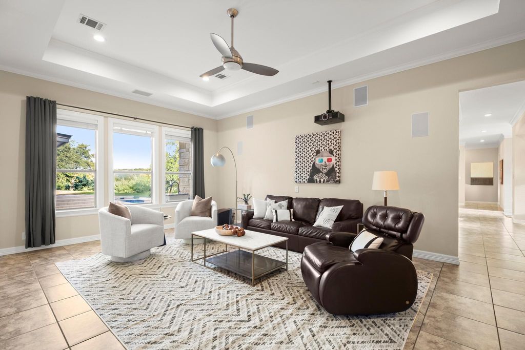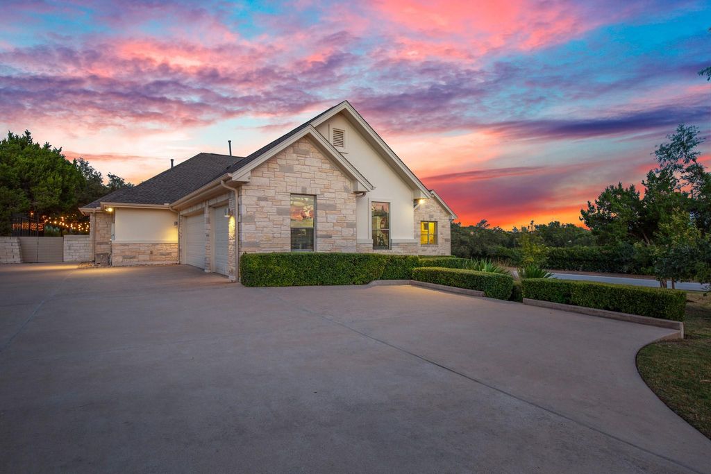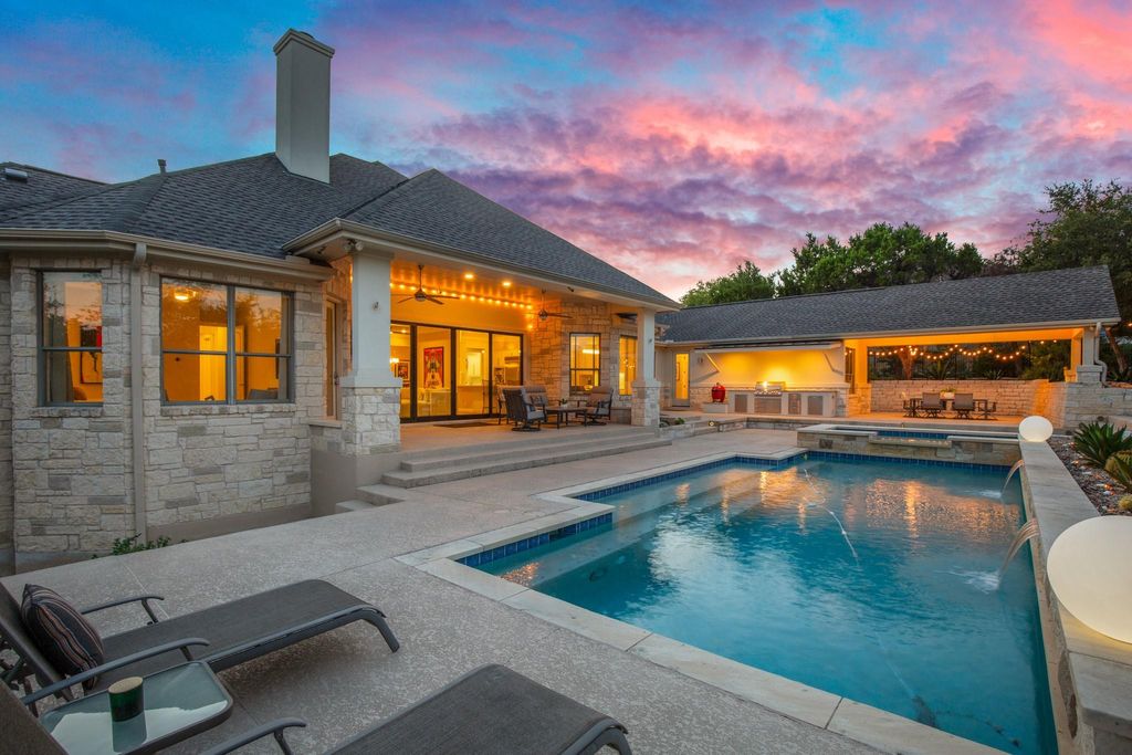 Tucked along a quiet cul-de-sac in the highly desirable Westminster Glen Estates, this stunning single-story home combines Hill Country serenity with refined modern living. All this just minutes from Four Points, Lake Austin, and top-rated schools in Leander ISD (River Place Elementary, Four Points Middle, and Vandegrift High). Inside, an inviting open floor plan showcases 10-foot ceilings, 8-foot doors, and abundant natural light. A 16-foot sliding glass wall, added during the home's 2018 renovation, seamlessly connects indoor and outdoor living spaces. The gourmet kitchen is a chef's dream, featuring a Kitchenaid 8-burner commercial cooktop, dual full-size dishwashers, warming drawer, prep sink, and a generous walk-in pantry. The layout flows easily into spacious living and dining areas designed for both family gatherings and relaxed everyday living. With five bedrooms, each offering a walk-in closet, plus a dedicated office and a media room with ceiling-mounted projector, there's space for everyone to work, play, and unwind. The primary suite features an expansive custom closet and tranquil views of the surrounding oaks. One bedroom, currently being used as a second office, includes custom built-ins for maximum flexibility. The utility room includes laundry, a wine fridge, second full-size refrigerator, built-in hampers, and abundant storage and counter space. The home has gigabit Ethernet wiring throughout for music, ideal for remote work, media streaming, and smart home convenience. The spacious 3-car garage includes a Tesla EV charger. Home also has a new fiberglass shingle roof (2025) with transferable warranty. Step outside to enjoy the two covered patios, an outdoor kitchen with granite countertops, built-in gas grill, Komado Joe smoker, stainless storage cabinets, movable garden sink, and wood-burning fire pit"”all surrounded by professionally landscaped grounds, soft landscape lighting and a heated salt-water pool and spa.
