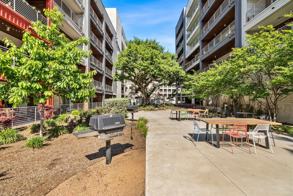 Move in Ready Top Floor Unit on South Congress! Full Appliance Package offered along with solid flooring throughout. Sleek kitchen open to dining and living areas with a wall of windows for abundant natural light. Four Hands island for storage, prep area and entertaining space. Spacious South Facing patio overlooking tranquil Oak Garden. Custom closet storage in primary suite, owner's bath complete with dual vanity, walk-in shower, and dual medicine cabinet mirrors for extra convenient storage. The guest bedroom features additional built in storage above the closet. Two reserved parking spaces in secure garage are included and within steps of the elevator. A rooftop amenity deck offers gym, yoga retreat, ample seating area and coworking space. Steps to the Yard's restaurants, brewery, distlillery, wine tasting room, and coffee shop! Short commute to downtown and easy access to Soco, S Lamar, Barton Springs, Zilker Park, and ABIA.