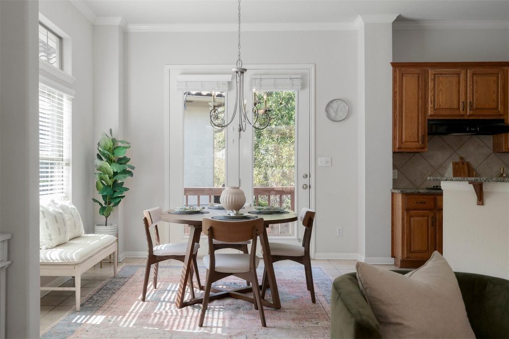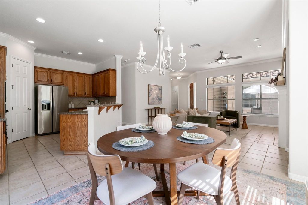 Tucked inside the gates of one of Circle C's most private sections, this home backs to a stretch of greenbelt so thick with trees it feels like your own slice of Hill Country. The courtyard out front is fully gated; a quiet spot for morning coffee or a place to drop the day before heading inside. The front door opens into a living room made for unwinding, anchored by a fireplace and framed by arched niches. Sunlight spills through the wall of windows, filling the room and drawing your eyes straight out to the tree shaded front yard. Tile floors run through the main areas, keeping everything cool and easy to maintain, while the layout flows naturally into the dining and kitchen spaces. The dining area feels effortlessly inviting with its chandelier and doors that open to the back deck. It's the kind of setup that makes dinners linger a little longer. In the kitchen, a wraparound breakfast bar creates a natural hangout spot. Granite countertops, a gas cooktop, built-in oven and microwave, and plenty of cabinetry mean you'll never run out of space. The primary suite sits at the back, with windows framing greenbelt views you'll never get tired of. The ensuite bath delivers everything you need: dual vanities, a soaking tub, separate shower, and a generous walk-in closet. Two additional bedrooms round out the layout, one with its own full bath, perfect for guests or an in-law suite. Out back, the deck stretches across the rear of the home, elevated just enough to catch the breeze and watch the trees sway. The built-in bench makes it easy to settle in for a glass of wine or a good book, and the xeriscaped yard below keeps weekends free for something better than mowing. Living here means more than a pretty home! It's access to miles of trails, multiple parks, playgrounds, and resort-style pools. Top-rated schools, H-E-B, Alamo Drafthouse, and favorite local restaurants are all just minutes away, with MoPac ready to take you downtown. This is Circle C living at its best!