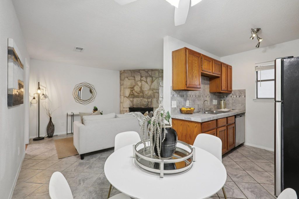 Located at 4307 S 1st ST 106, Austin, TX 78745, this condominium offers an inviting home that is ready to move in. Clean and cozy one-bedroom condo on the first floor of a quiet complex with only 18 units. The living room provides a warm, welcoming atmosphere, centered around a fireplace that promises cozy evenings and serves as a focal point for relaxation. The kitchen features shaker-style cabinets and a backsplash, creating a stylish, functional space where culinary creativity can flourish. The bedroom provides a private retreat, complete with an ensuite bathroom for added convenience and comfort. Enjoy the outdoors on the patio, extending your living space and providing a spot to unwind in the residential area. This condominium also features an open floor plan that enhances the sense of space and creates an inviting atmosphere. Appliances include a dishwasher, microwave, stove, and refrigerator. This Austin condominium offers a blend of comfort and convenience, making it a perfect place to call home. On-site maintenance man. Live like a local on South 1st Street with easy access to restaurants, grocery stores, and 0.4 miles to St. David's, South Austin Medical complex, and 0.4 miles to HWY 71. Short commute to the airport and downtown.