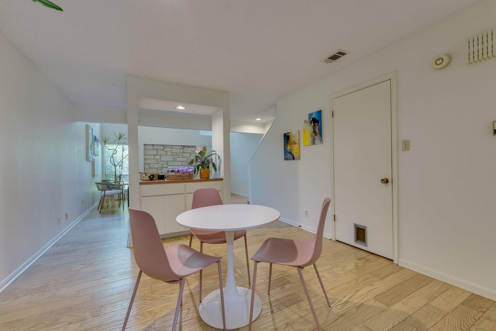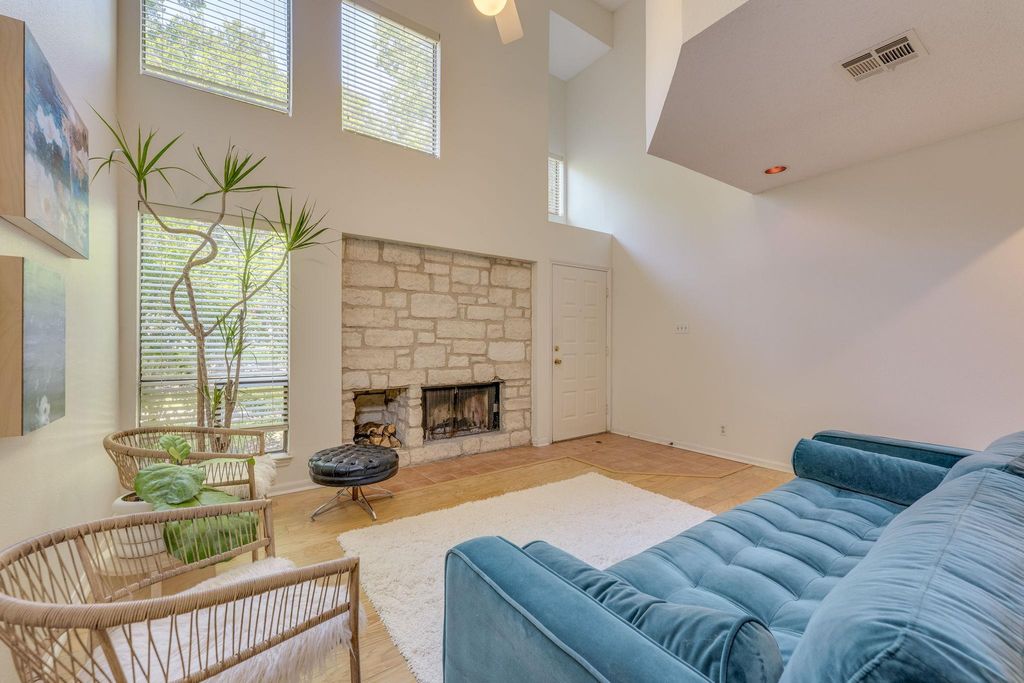 Price improvement! Looking for an architecturally unique condo in North Austin? With high ceilings, gorgeous stone fireplace, and a loft bedroom, this unit is full of aesthetic possibility. Nestled in a quiet, tucked-away complex with easy access to Arboretum and central Austin. Sparkling pool is just a steps away. Lofted primary bedroom has a study/sitting area, two closets, and its own bathroom vanity. Upstairs full bath is shared between two bedrooms with a half bath downstairs. Private back patio is just waiting for an outdoor sofa and all your plants.