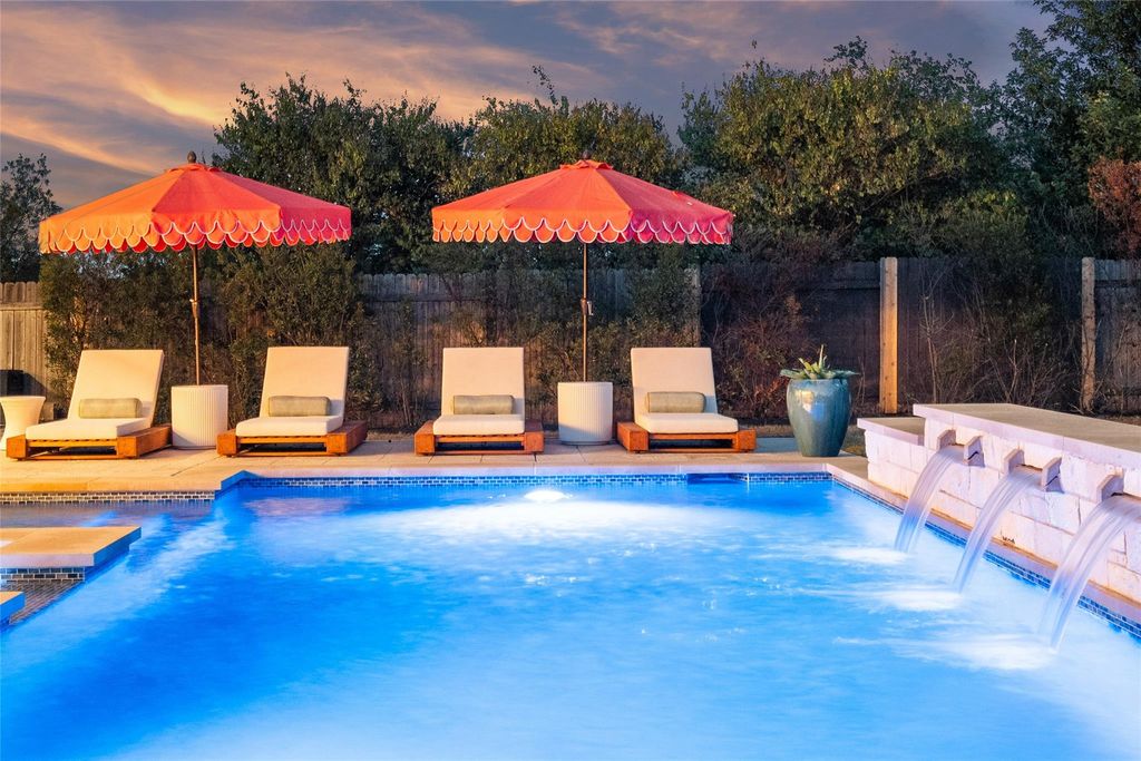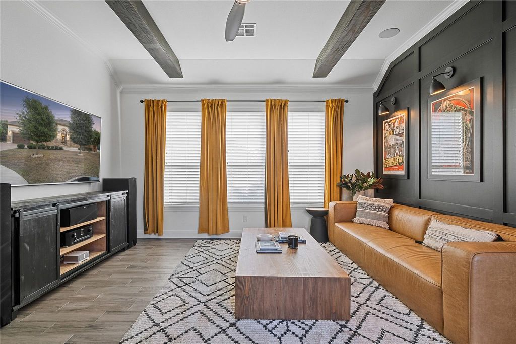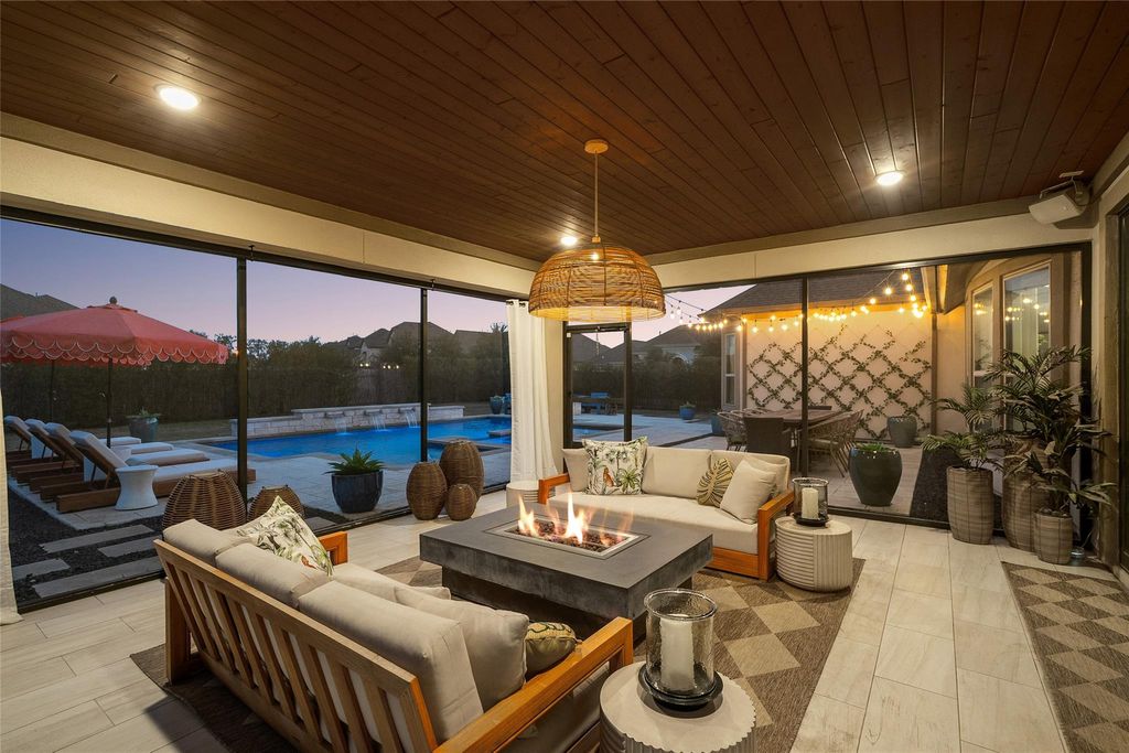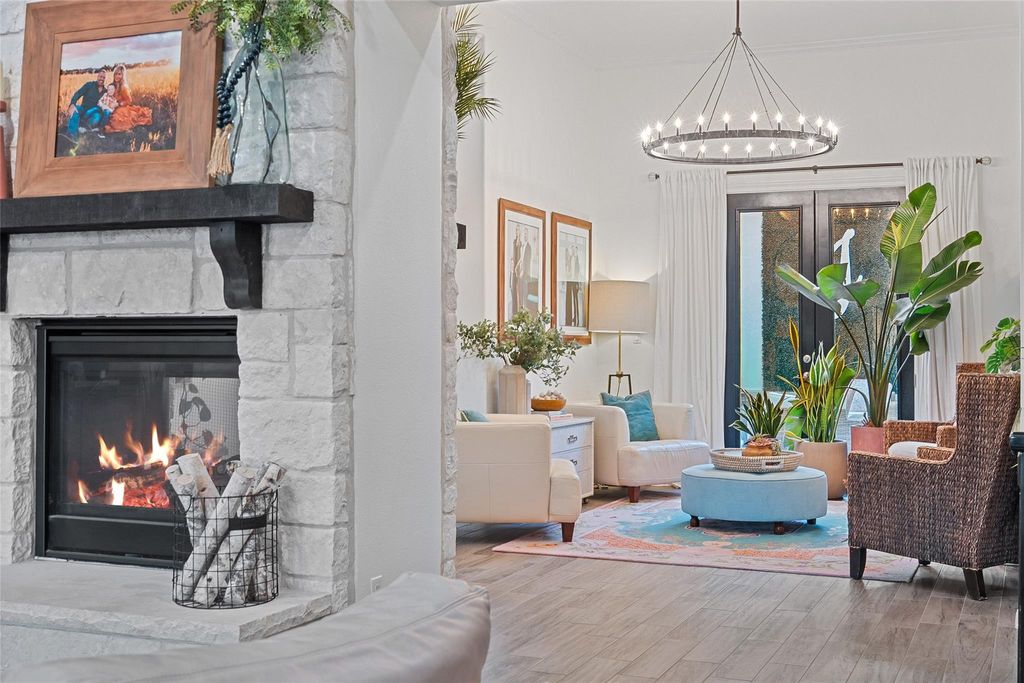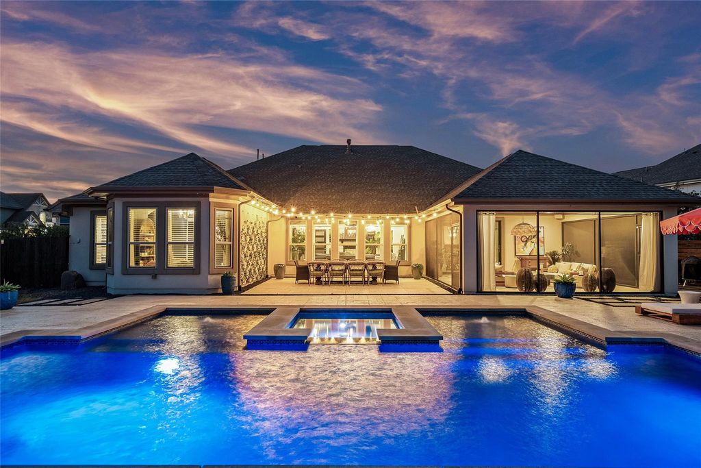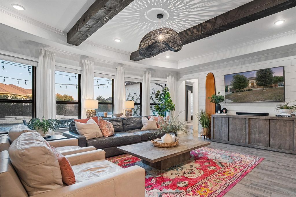 A welcoming courtyard entry sets the stage for this beautifully designed residence in the highly desirable Crystal Falls community. Inside, curated details and custom finishes create an elevated yet comfortable atmosphere. Wood beam and tray ceilings, custom barn doors, designer lighting, and thoughtfully placed accent walls bring warmth and sophistication throughout. The open-concept kitchen features a capped island and upgraded vent hood, blending seamlessly with the family room, which is anchored by a striking double-sided fireplace shared with the dining area. A private office and separate game room add versatility, offering spaces for both productivity and leisure. Retreat outdoors to an entertainer's dream: an expansive screened-in patio with built-in speakers overlooking a heated pool and spa with waterfalls, a tanning ledge, and a wood-burning firepit. This resort-style setting is perfect for year-round relaxation, family gatherings, or evenings under the stars. Designed for both function and comfort, the home offers wood-look tile flooring throughout the main living areas, kitchen, primary suite, and office, while plush carpet provides added quiet in the secondary bedrooms. Positioned on a private corner lot within a quiet cul-de-sac, this single-story home balances elegance and privacy with everyday convenience. Just minutes from schools, parks, and walking trails, residents also enjoy access to Crystal Falls amenities including pools, sports courts, and playgrounds. A rare opportunity to experience refined living in one of Leander's most sought-after communities.