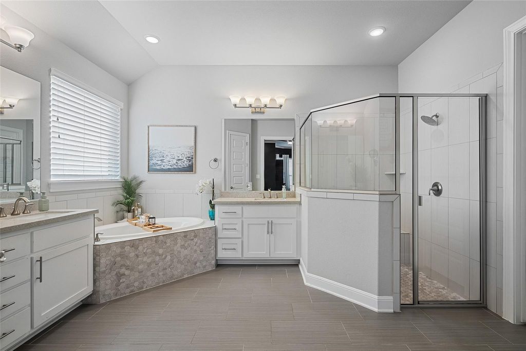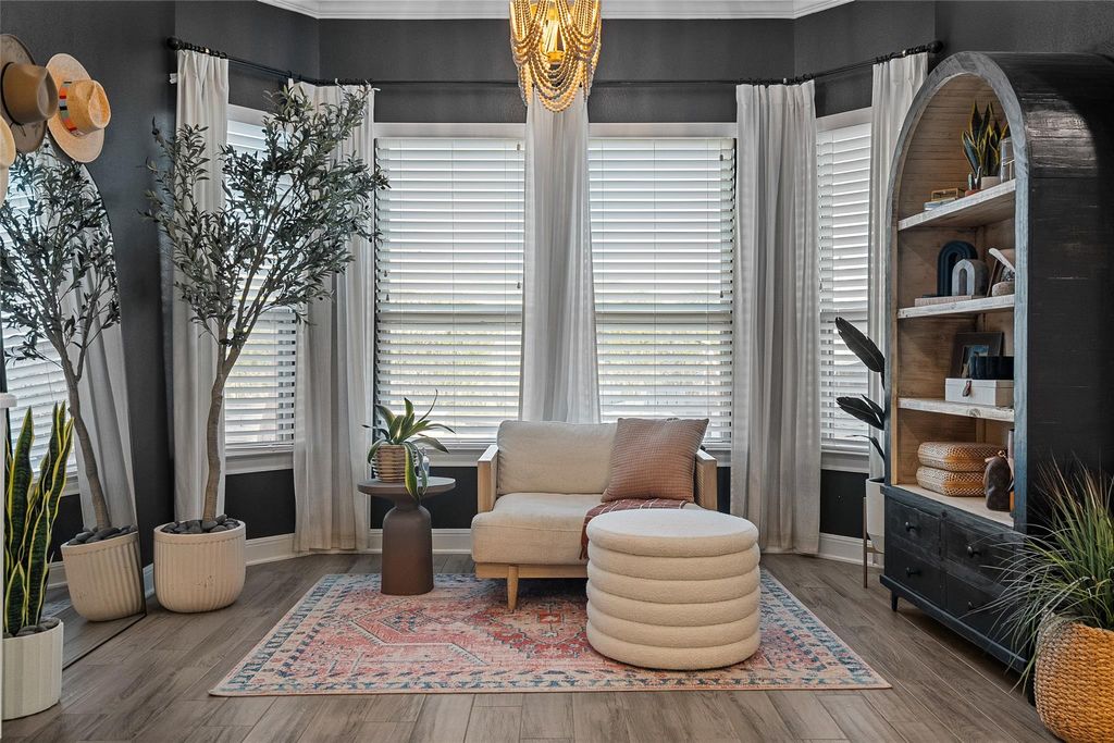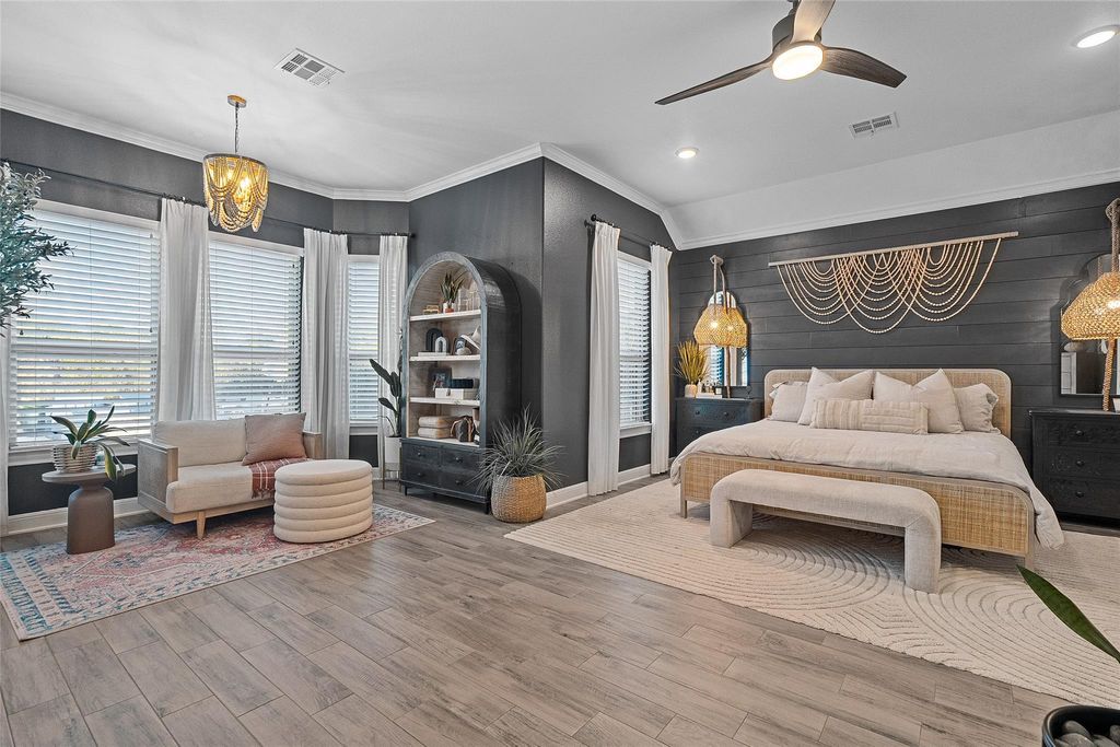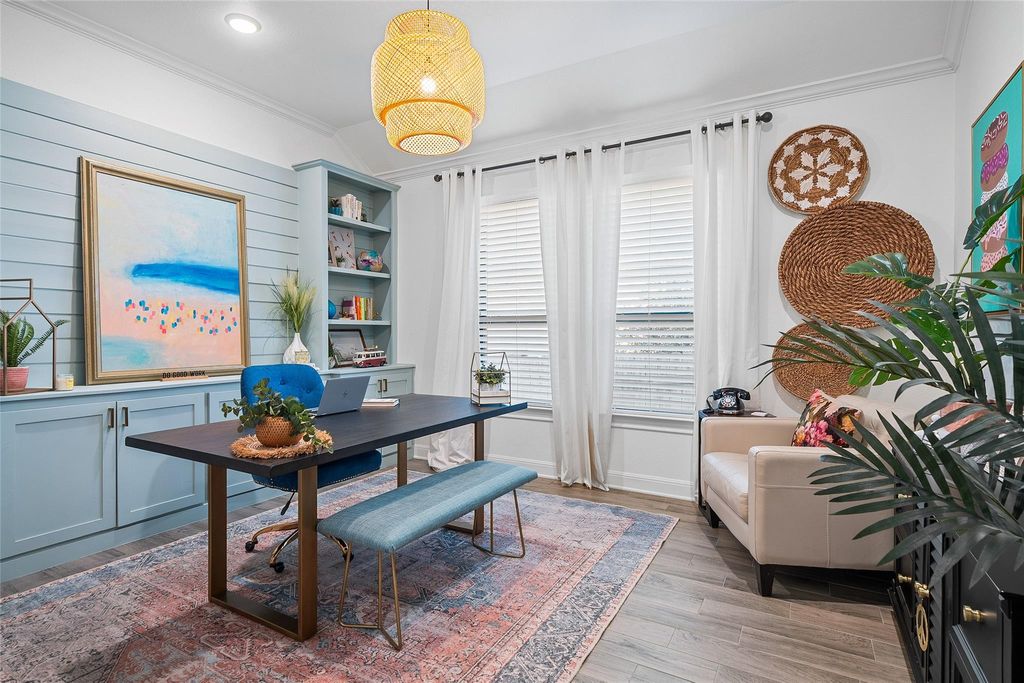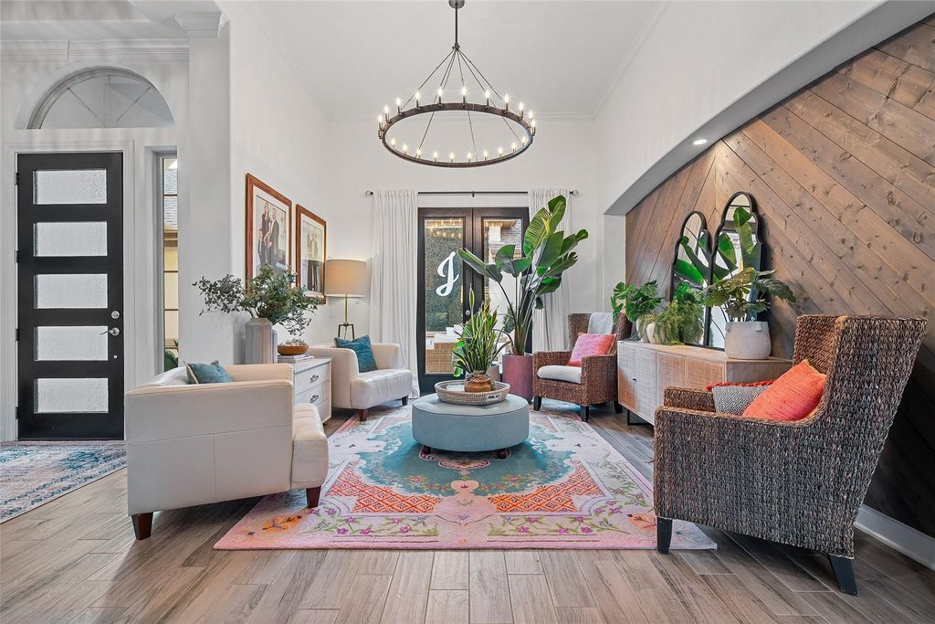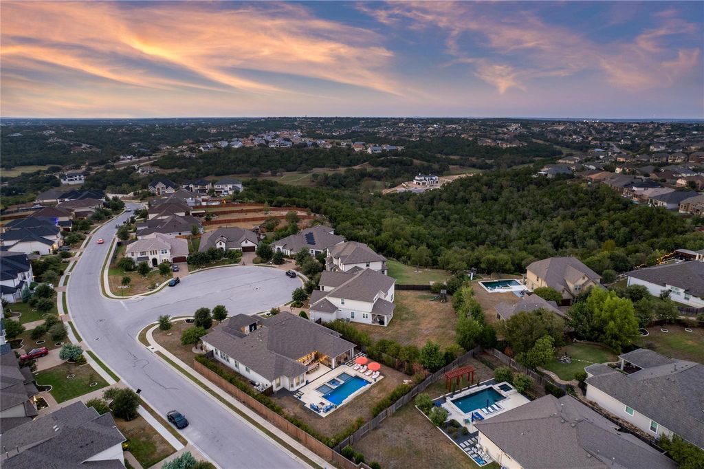 A welcoming courtyard entry sets the stage for this beautifully designed residence in the highly desirable Crystal Falls community. Inside, curated details and custom finishes create an elevated yet comfortable atmosphere. Wood beam and tray ceilings, custom barn doors, designer lighting, and thoughtfully placed accent walls bring warmth and sophistication throughout. The open-concept kitchen features a capped island and upgraded vent hood, blending seamlessly with the family room, which is anchored by a striking double-sided fireplace shared with the dining area. A private office and separate game room add versatility, offering spaces for both productivity and leisure. Retreat outdoors to an entertainer's dream: an expansive screened-in patio with built-in speakers overlooking a heated pool and spa with waterfalls, a tanning ledge, and a wood-burning firepit. This resort-style setting is perfect for year-round relaxation, family gatherings, or evenings under the stars. Designed for both function and comfort, the home offers wood-look tile flooring throughout the main living areas, kitchen, primary suite, and office, while plush carpet provides added quiet in the secondary bedrooms. Positioned on a private corner lot within a quiet cul-de-sac, this single-story home balances elegance and privacy with everyday convenience. Just minutes from schools, parks, and walking trails, residents also enjoy access to Crystal Falls amenities including pools, sports courts, and playgrounds. A rare opportunity to experience refined living in one of Leander's most sought-after communities.