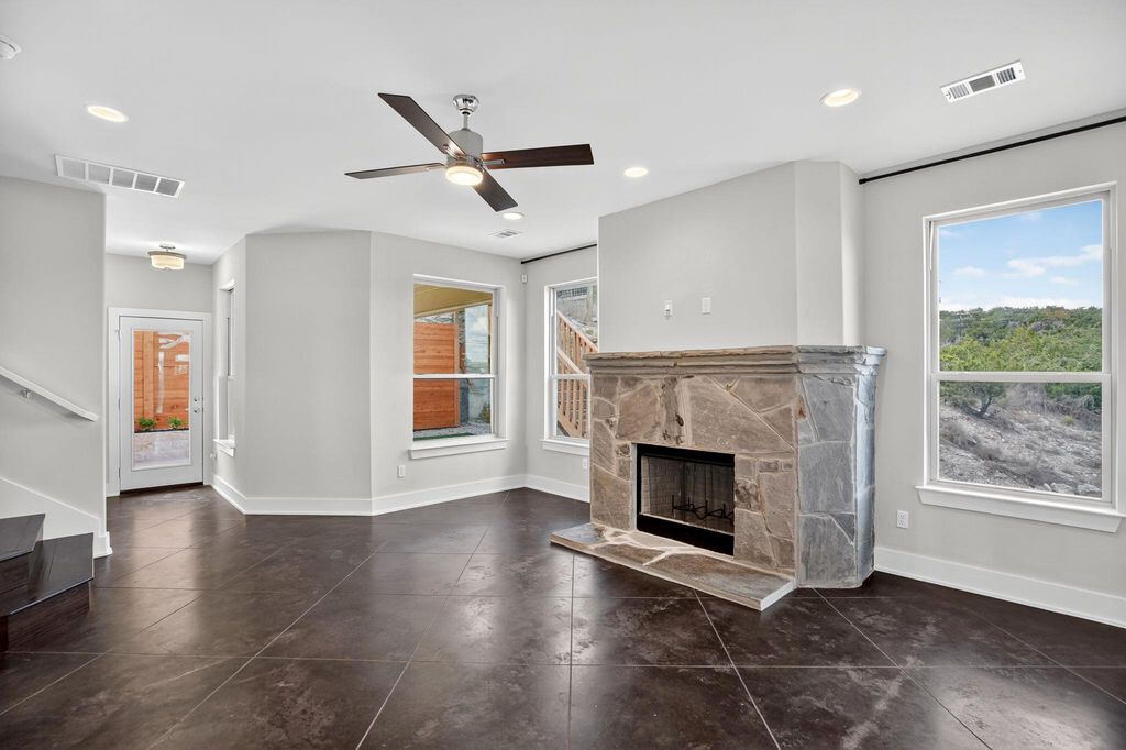 This beautifully designed home sits on a scenic view lot and offers a smart, energy-efficient floor plan that feels much larger than its actual square footage. The interior features stained and scored concrete floors on the main level and rich hardwood flooring upstairs. The kitchen and bathrooms are finished with sleek quartz countertops and custom, hand-built cabinets crafted on-site. A wood-burning fireplace with custom rockwork and a stone mantel adds warmth and charm to the main living area. Additional highlights include stainless steel appliances, an alarm system package, Cat 5 and coax central wiring panel, and flat screen TV hookups in all living areas and bedrooms. The home is built with upgraded spray foam insulation, a climate-controlled attic, premium tilt-out windows, and high-efficiency TRANE A/C heat pump systems. There is no HOA, but homeowners have the option to join the Lake Park Association for just $125 per year. Enjoy fishing, kayaking, and much more! Built by one of the area's top custom home builders, this home offers outstanding quality, comfort, and design. Don't miss this opportunity"”come take a tour today!