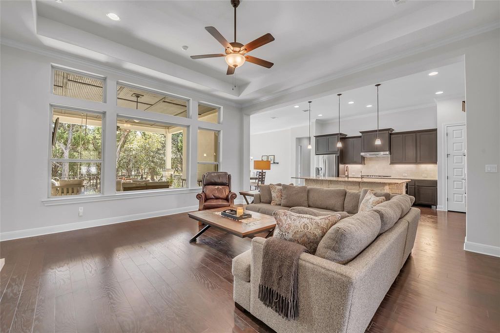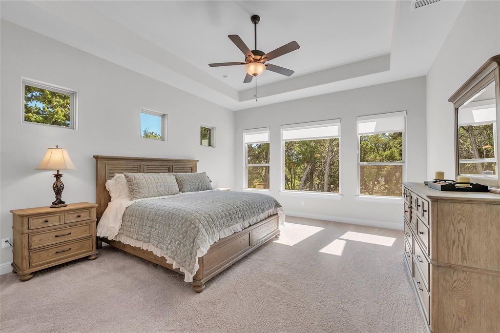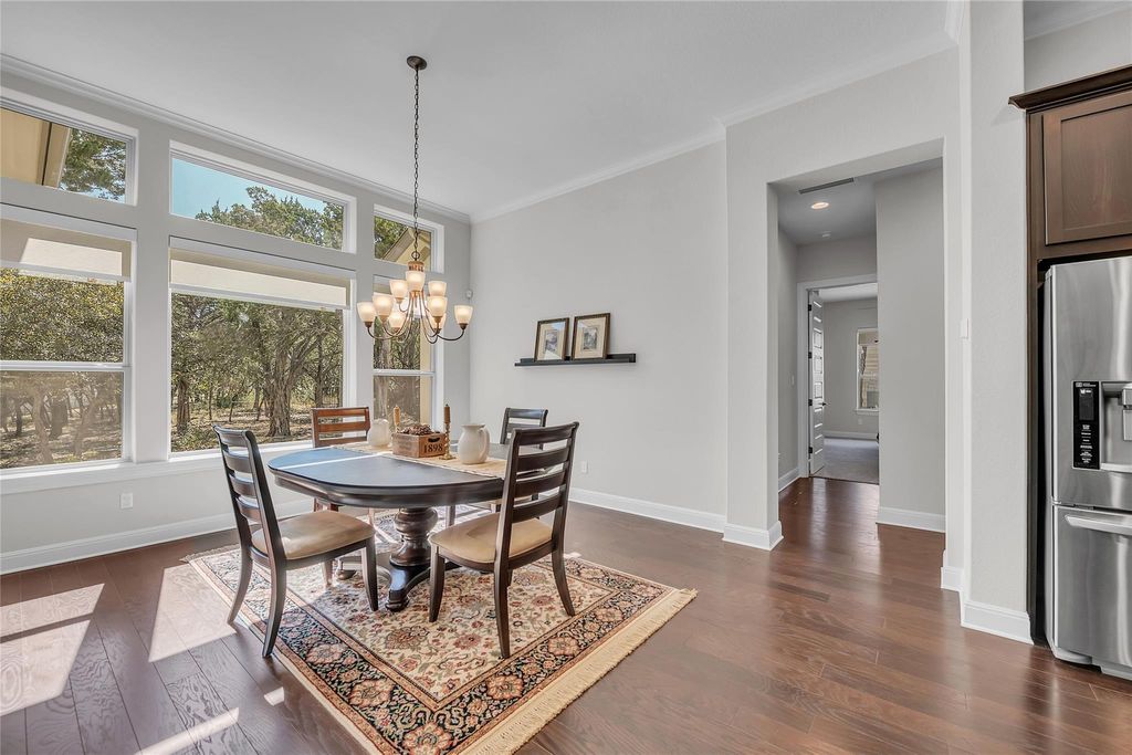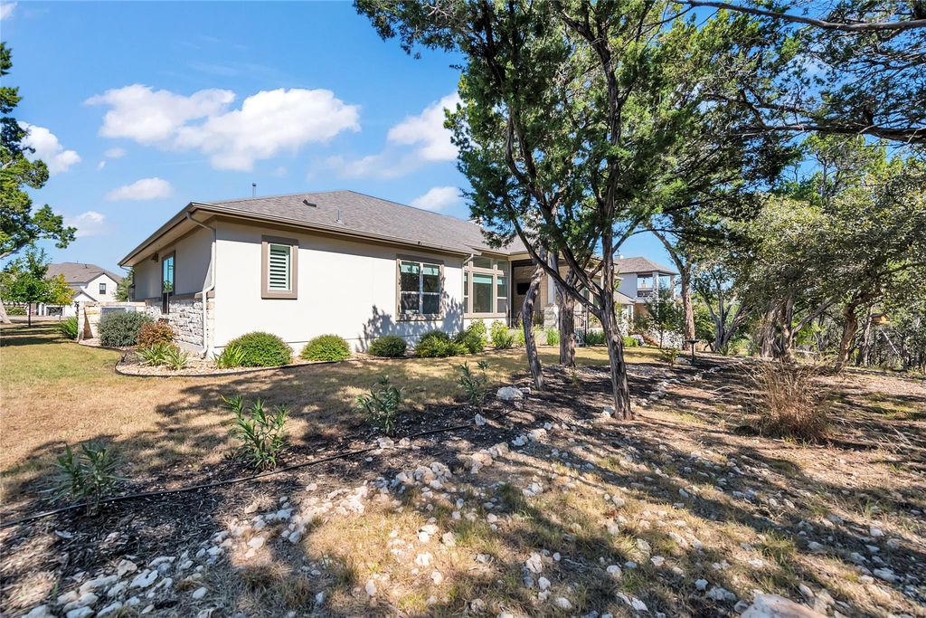 Located in one of the most desirable areas of The Hollows, this Giddens-built home offers 3,019 square feet on a wooded two-thirds acre lot that backs to a nature trail with an easy walk to the lake, dock, and kayaks. The property provides a rare combination of privacy, space, and access to resort-style amenities. A custom iron entry door opens to an impressive foyer with tall ceilings and an open-concept design connecting the kitchen, dining, and family rooms. The chef's kitchen features custom cabinetry, granite countertops, stainless steel appliances, and a large island perfect for entertaining. The main living areas include scraped hardwood floors and abundant natural light from large windows overlooking the wooded lot. The primary suite offers a spacious bedroom and a spa bath with a separate tub and shower. A secondary bedroom includes a private ensuite bath, with two additional bedrooms connected by a Jack-and-Jill bath. A dedicated office provides flexibility for work or study. The covered back patio features a wood ceiling, stone fireplace, and is wired for TV, creating an ideal outdoor living space with peaceful Hill Country views. Located within Lago Vista ISD, this property combines the serenity of lakeside living with convenient access to community amenities, walking trails, and Lake Travis. Features: 4 bedrooms | 3.5 baths | Office | 3,019 sq. ft. Giddens-built home on 0.66-acre wooded lot Open concept kitchen, dining, and family room Hardwood floors in main living areas Primary suite with spa bath Covered patio with stone fireplace and TV wiring Easy walk to lake, dock, and kayaks Lago Vista ISD Buyer to verify all listing information including measurements, schools, and HOA details.