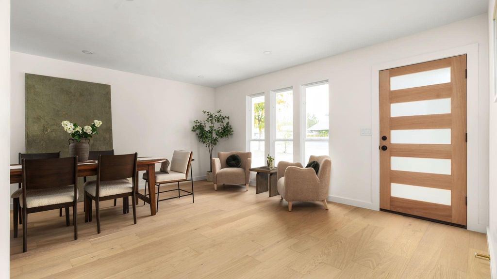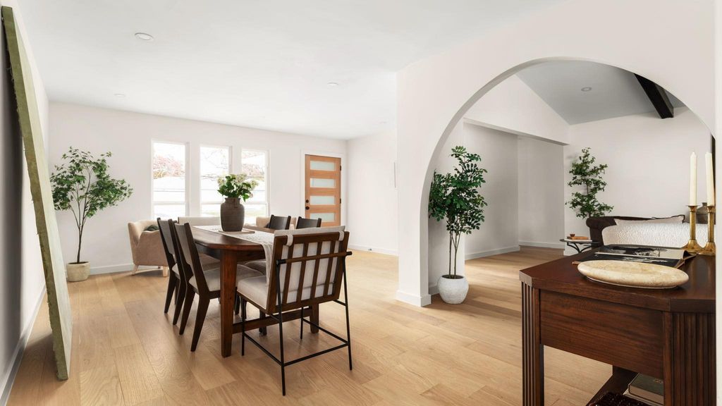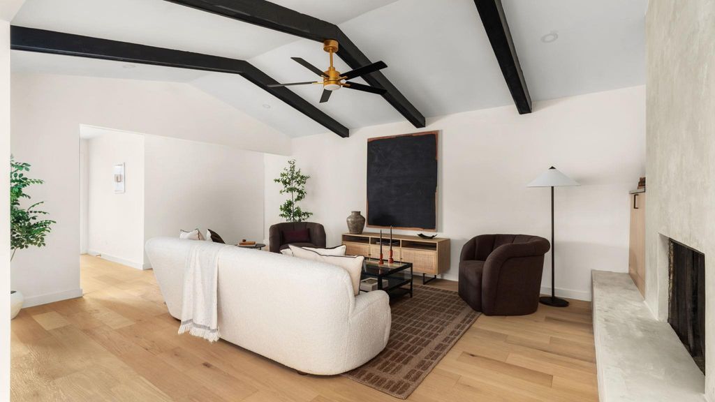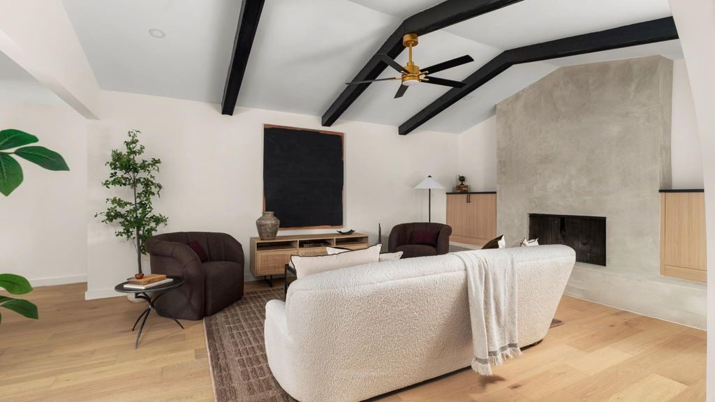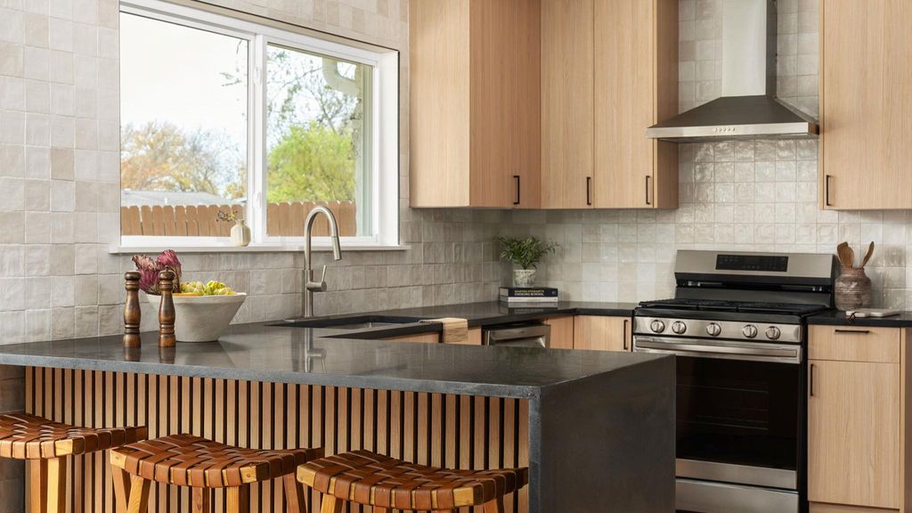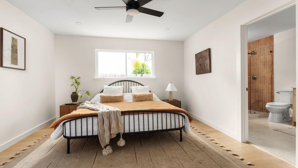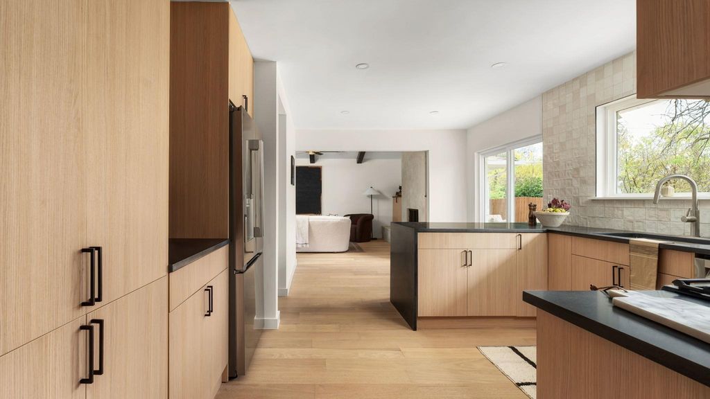 Mid-century modern restoration in the heart of University Hills! :: Open and bright living area accented by vaulted beamed ceiling, an arched open walk space and modern stucco fireplace. :: Stunning kitchen showcases new white oak cabinets, quartz countertops, and a cozy breakfast bar. :: Spacious primary with ensuite bathroom features designer tile and vanities and spa-like shower with dual shower heads. :: Upgrades include PVC underground plumbing systems & drainage, all new water lines, new windows and water heater. :: Wonderful cosy and relaxing backyard with new deck. :: Walking distance to beautiful parks such as Dottie Jordan Neighborhood Park, Little Walnut Creek Greenbelt, and minutes to Mueller Area + H-E-B!