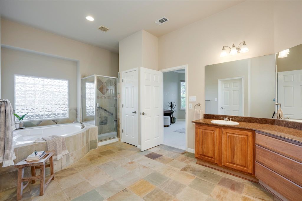 INTERIOR | Bookcases, Breakfast Bar, Ceiling Fan(s), Crown Molding, Double Vanity, Eat-in Kitchen, Entrance Foyer, Granite Counters, High Speed Internet, Kitchen Island, Low Flow Plumbing Fixtures, Master Downstairs, Open Floorplan, Pantry, Recessed Lighting, Smart Thermostat, Soaking Tub, Storage, Walk-In Closet(s) |
