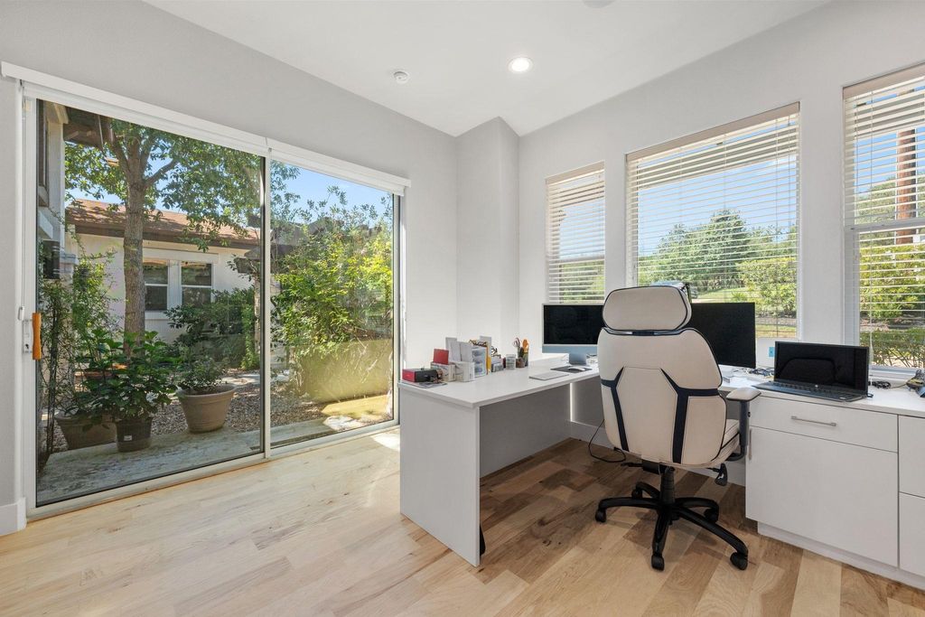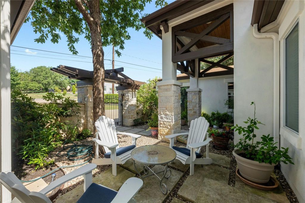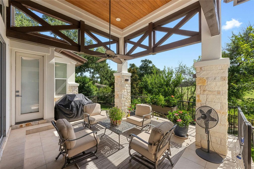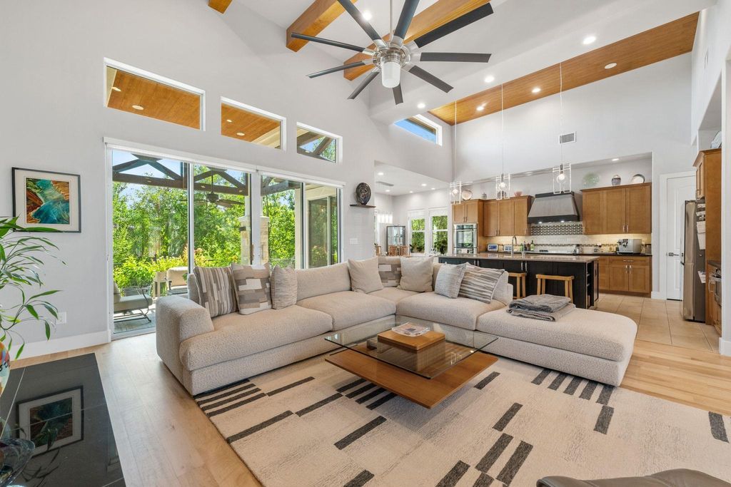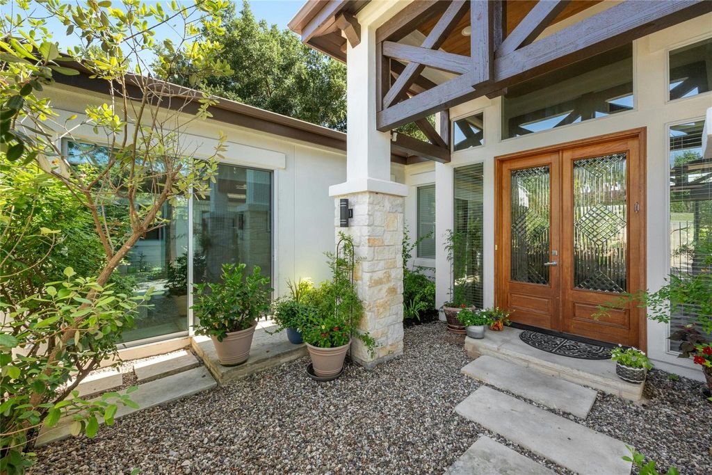This exceptional one-story contemporary home, designed by a noted Bend, Oregon architect, perfectly blends modern elegance with everyday comfort. Offering 3 spacious bedrooms, 3 full baths, and a dedicated office easily convertible to a 4th bedroom, the home features soaring 17-foot ceilings and expansive windows that flood the interiors with natural light. The thoughtfully designed layout includes a third bedroom with its own full ensuite bath and wet bar, making it an ideal second master or private guest suite. A gated courtyard framed by mature trees creates a warm and welcoming entry, while oversized sliding doors connect the indoor living spaces to the serene outdoor retreat. The oversized 2-car garage"”with EV hookup and a back bay for a third vehicle or golf cart"”adds convenience and flexibility. Situated on the 9th hole of the Live Oak Golf Course, the property enjoys stunning views, privacy, no HOA, and low taxes. Within walking distance are the Lakeway Airpark, tennis courts, and a 64-acre lakefront park with trails, kayaking, pickleball and more. Families benefit from the highly acclaimed Lake Travis ISD, and golfers can enjoy both championship and casual courses nearby. This architect-designed residence offers a rare opportunity to own a private sanctuary in one of Lakeway's most desirable locations.