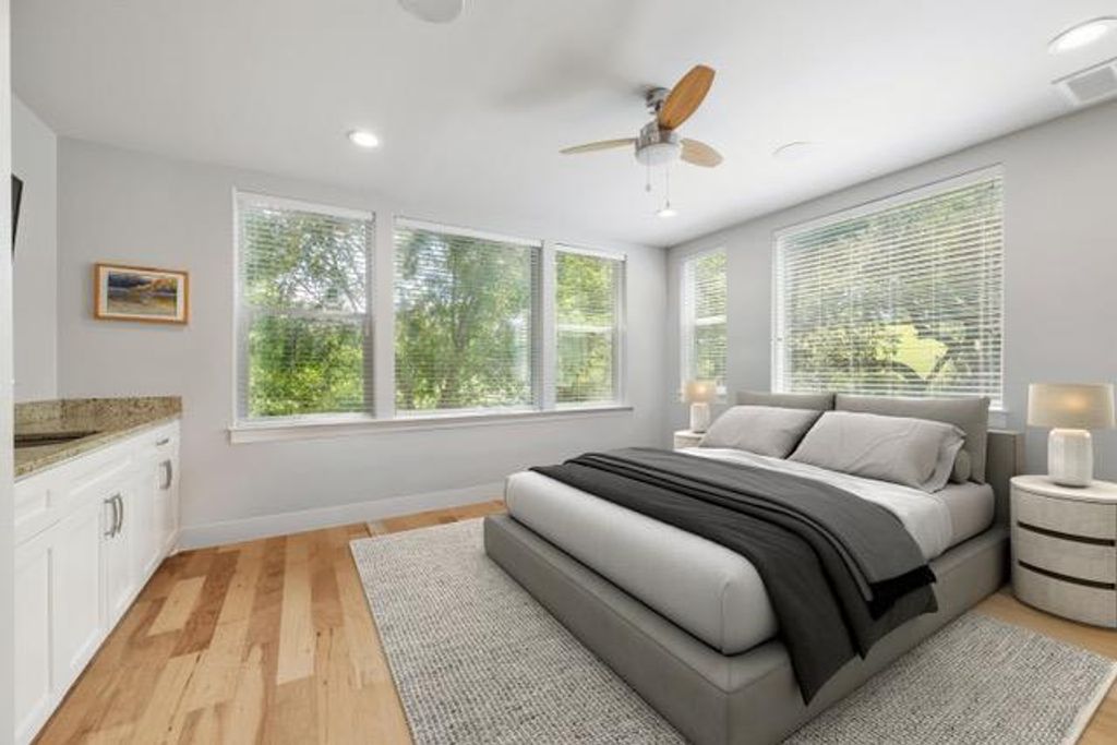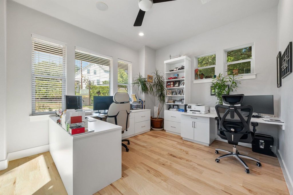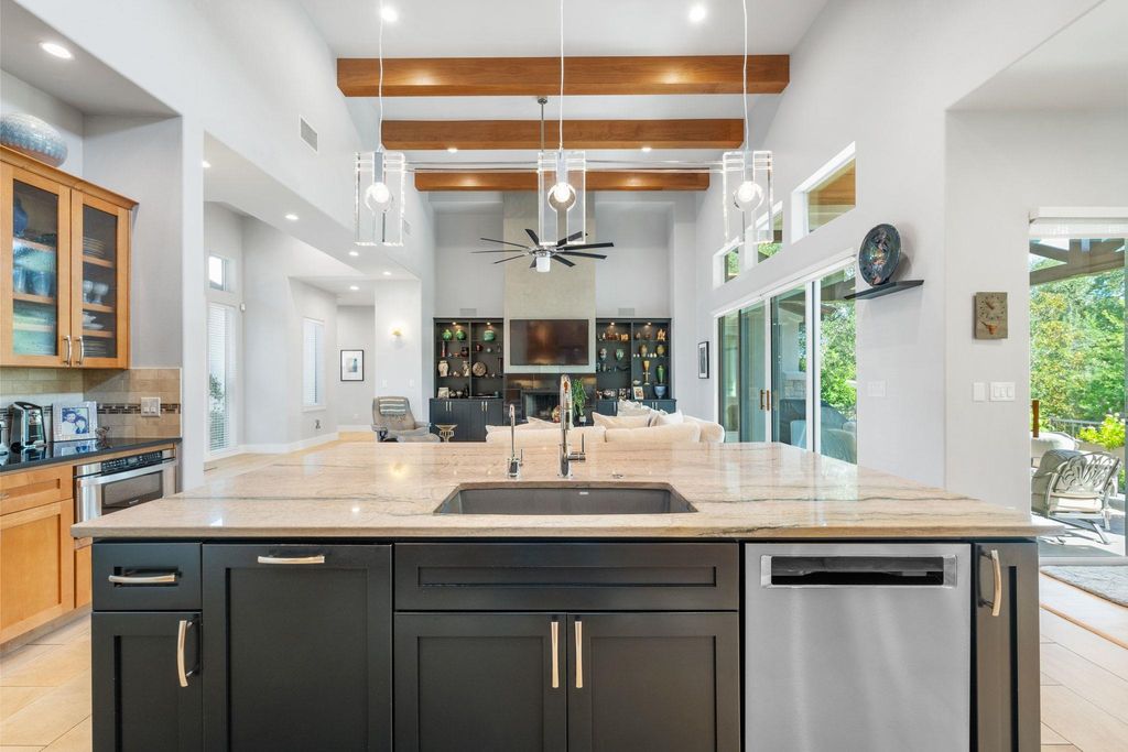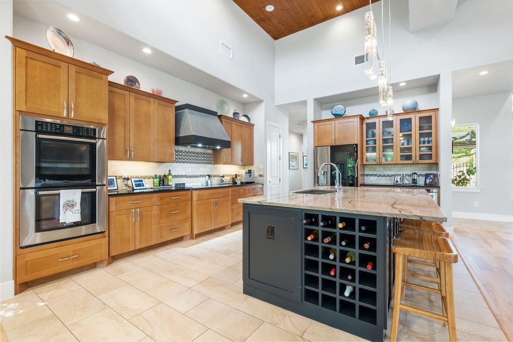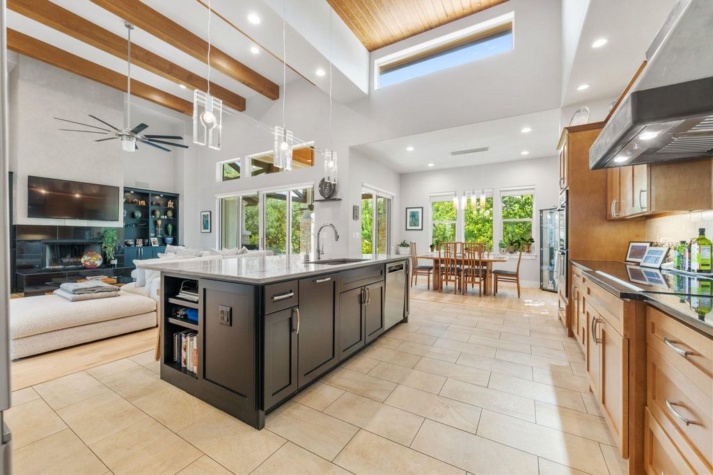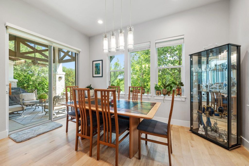 This exceptional one-story contemporary home, designed by a noted Bend, Oregon architect, perfectly blends modern elegance with everyday comfort. Offering 3 spacious bedrooms, 3 full baths, and a dedicated office easily convertible to a 4th bedroom, the home features soaring 17-foot ceilings and expansive windows that flood the interiors with natural light. The thoughtfully designed layout includes a third bedroom with its own full ensuite bath and wet bar, making it an ideal second master or private guest suite. A gated courtyard framed by mature trees creates a warm and welcoming entry, while oversized sliding doors connect the indoor living spaces to the serene outdoor retreat. The oversized 2-car garage"”with EV hookup and a back bay for a third vehicle or golf cart"”adds convenience and flexibility. Situated on the 9th hole of the Live Oak Golf Course, the property enjoys stunning views, privacy, no HOA, and low taxes. Within walking distance are the Lakeway Airpark, tennis courts, and a 64-acre lakefront park with trails, kayaking, pickleball and more. Families benefit from the highly acclaimed Lake Travis ISD, and golfers can enjoy both championship and casual courses nearby. This architect-designed residence offers a rare opportunity to own a private sanctuary in one of Lakeway's most desirable locations.