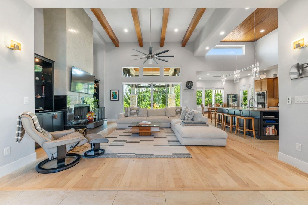 INTERIOR | Beamed Ceilings, Ceiling Fan(s), Double Vanity, Eat-in Kitchen, Granite Counters, High Ceilings, High Speed Internet, Kitchen Island, Master Downstairs, Open Floorplan, Pantry, Recessed Lighting, Smart Home, Storage, Walk-In Closet(s), Wired for Sound |