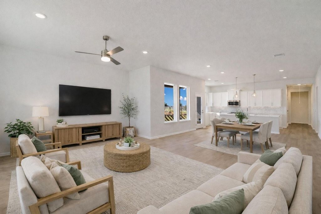 Move-in-Ready! The Essential floor plan by Newmark Homes is designed to impress"”and it won't stay on the market for long! This thoughtfully crafted one-story home features 3 bedrooms, 2.5 bathrooms, a private study, a spacious 2-car garage, and an open-concept layout that seamlessly connects the large family room and gourmet kitchen. Inside, you'll find stunning designer upgrades, including Silestone countertops, premium stainless steel appliances, light-toned luxury vinyl plank flooring, crisp white cabinetry, and LED accent lighting that adds a modern touch to the kitchen. Enjoy relaxing or entertaining on the extended covered patio, perfect for creating lasting memories in the vibrant Easton Park community.
