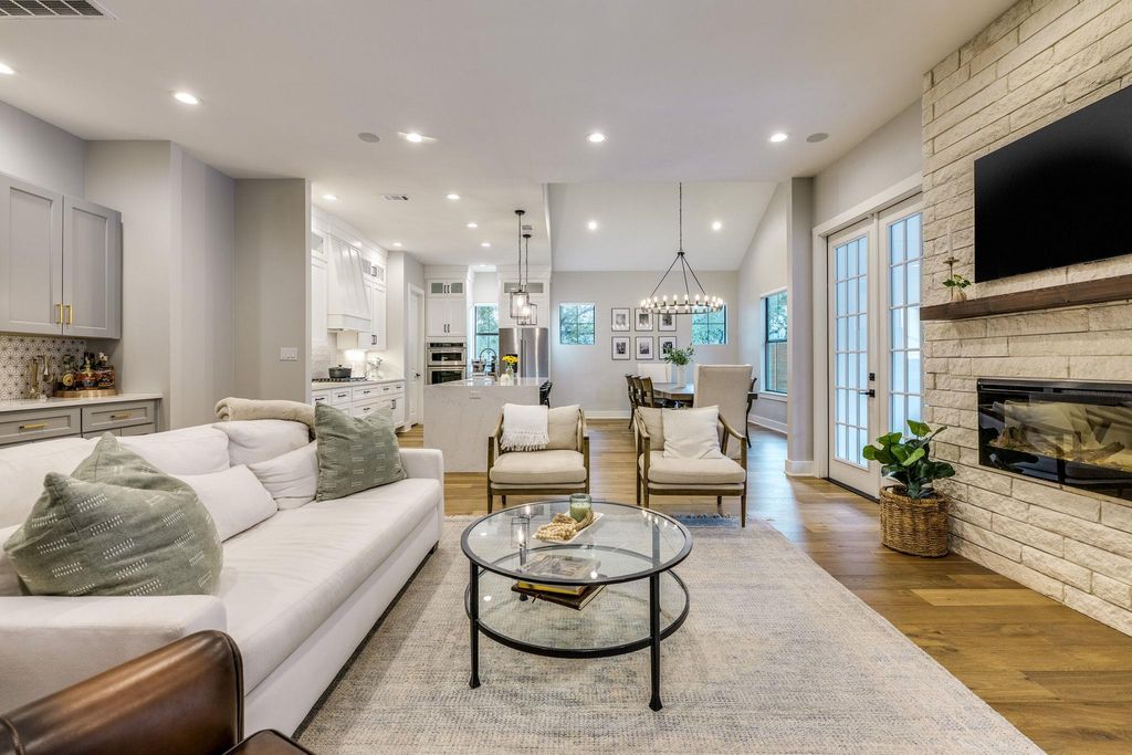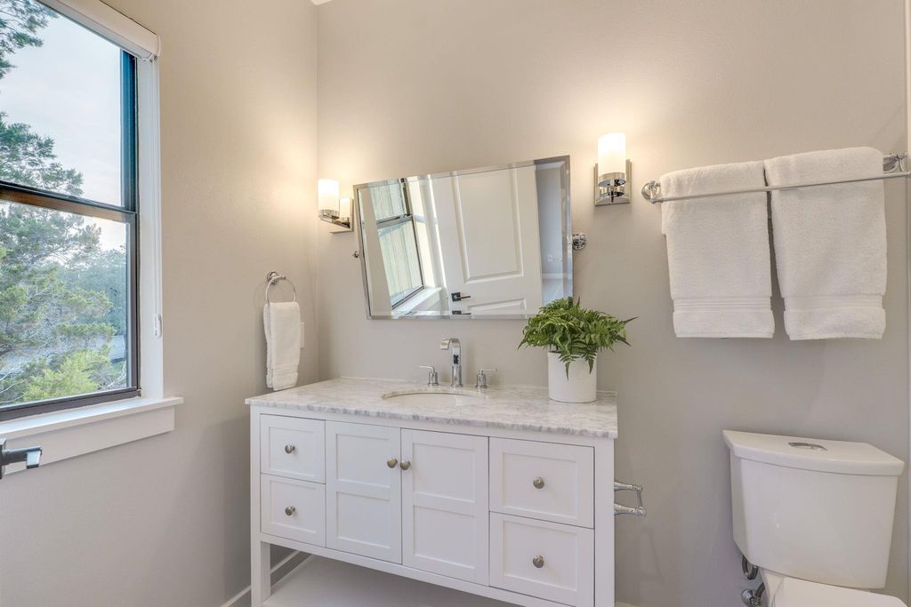 Tucked behind a private gate and nestled beneath mature oaks, this stunning home + casita sits on an expansive .67-acre lot just steps from Lake Travis. With a combined 3,742 sqft, 5 BD and 4.5 BA, the property offers a spacious and flexible layout that works beautifully for everyday living, guests, or even rental potential. Designed with modern taste and thoughtful finishings, it feels like a serene retreat while still being close to everything Austin has to offer. The main house features an open concept space that blends the kitchen, living and dining. Just beyond, tucked under the shade of mature trees, there's a stylish casita complete with a bedroom, full bath and a kitchenette. It's the perfect setup for guests or a potential short-term rental. From the moment you walk in, you're welcomed by warm wood floors, high ceilings, gorgeous display windows and recessed lighting that carries an inviting energy throughout. The kitchen is stunning with its oversized quartz waterfall island, tons of cabinet space and under-cabinet lighting for a touch of luxury. The impressive primary suite is a dream, with vaulted ceilings, an exposed beam, perfectly placed windows, an equally impressive ensuite and a massive walk-in closet"”complete with its own washer and dryer. A guest bath and private office round out the main level. Upstairs, you'll find 3 BD, 2 BA, a generous living/game room and another laundry room"”Yes, this home has 2, laundry rooms! Step outside into a peaceful backyard that feels like your own little escape. Walking distance to Lake Travis, you're never far from outdoor adventure. Chickens are welcome and you can launch your boat, explore nearby trails, or head into downtown, just 16 miles away.