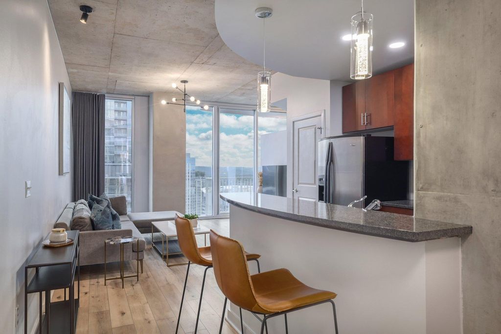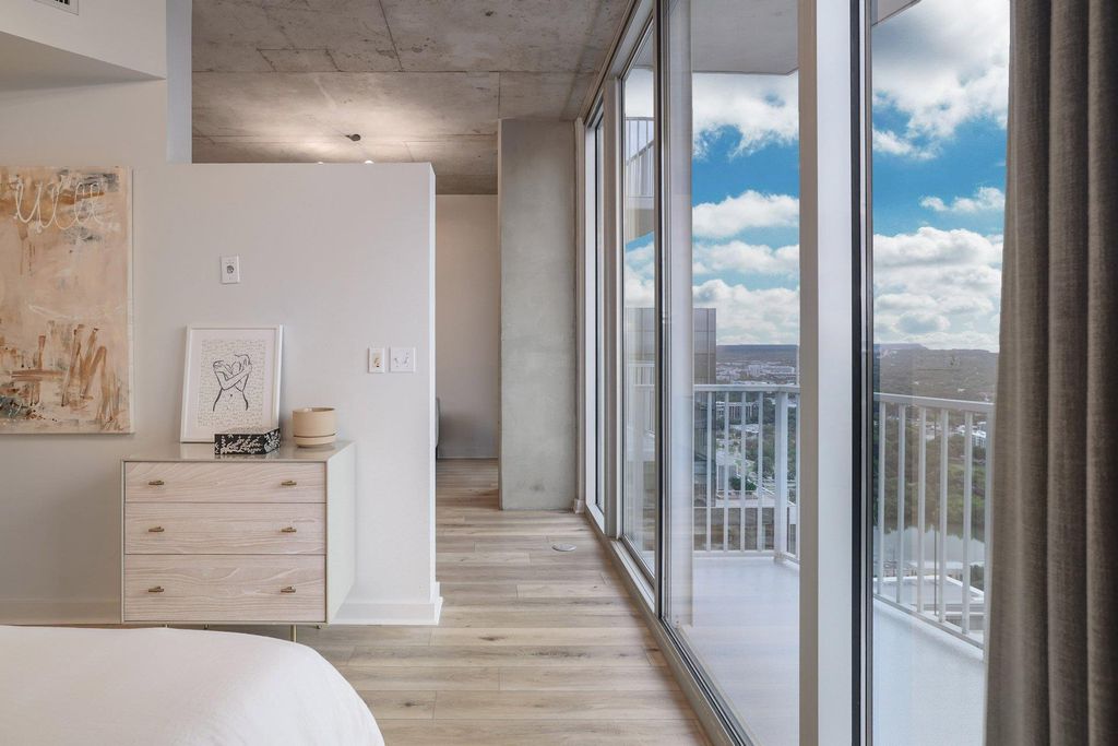 Wonderful opportunity in the 360 Condos, west facing, open floor plan with panoramic views of Lady Bird Lake & the Hill Country. Unit boasts updated flooring and light fixtures throughout, floor to ceiling glass windows, coat closet for additional storage & a private balcony with stunning views! Truly in the heart of downtown and steps to everything you could possibly need - restaurants, coffee shops, hike & bike trails, shopping, Whole Foods and Trader Joe's, nightlife and entertainment. Condo amenities include a resort-style rooftop pool, grills, clubhouse with kitchen, fitness center, media room, and dog relief area. Turnkey unit, perfect for primary residence or second home. Owner open to conveying the unit furnished (everything except dresser, artwork in bedroom and side table in living area). Pride in ownership shows in this unit, must see this gem!