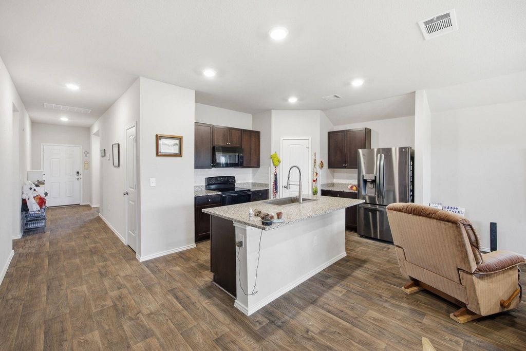 Welcome home to this beautifully maintained single-family residence tucked in a quiet East Austin neighborhood. Designed for comfortable living, this home features an open floor plan with recessed lighting and modern finishes throughout. The large primary suite offers a true retreat with a custom walk-in closet featuring built-in shelving, a brand-new $10K walk-in shower, and a new high-efficiency toilet. The kitchen is both stylish and functional, complete with a large LG refrigerator and a Bosch 46dBA dishwasher. Enjoy the outdoors in your spacious backyard with a covered patio, fruit trees, and relaxing views of the pond and wildlife area just beyond the fence. The partially open back fence allows you to take in the sunsets and natural scenery right from your patio. With its thoughtful upgrades, peaceful setting, and easy access to nearby parks, schools, and amenities, this home offers the perfect blend of comfort, convenience, and quiet suburban charm.