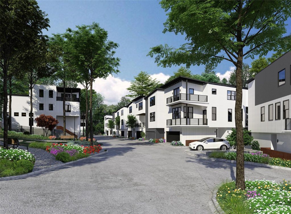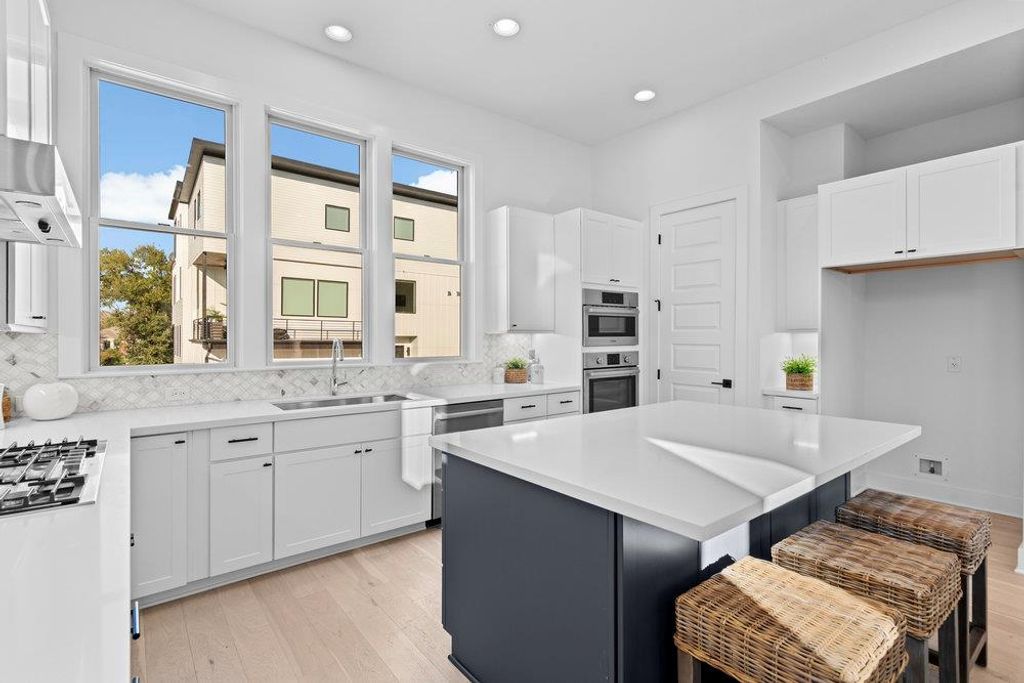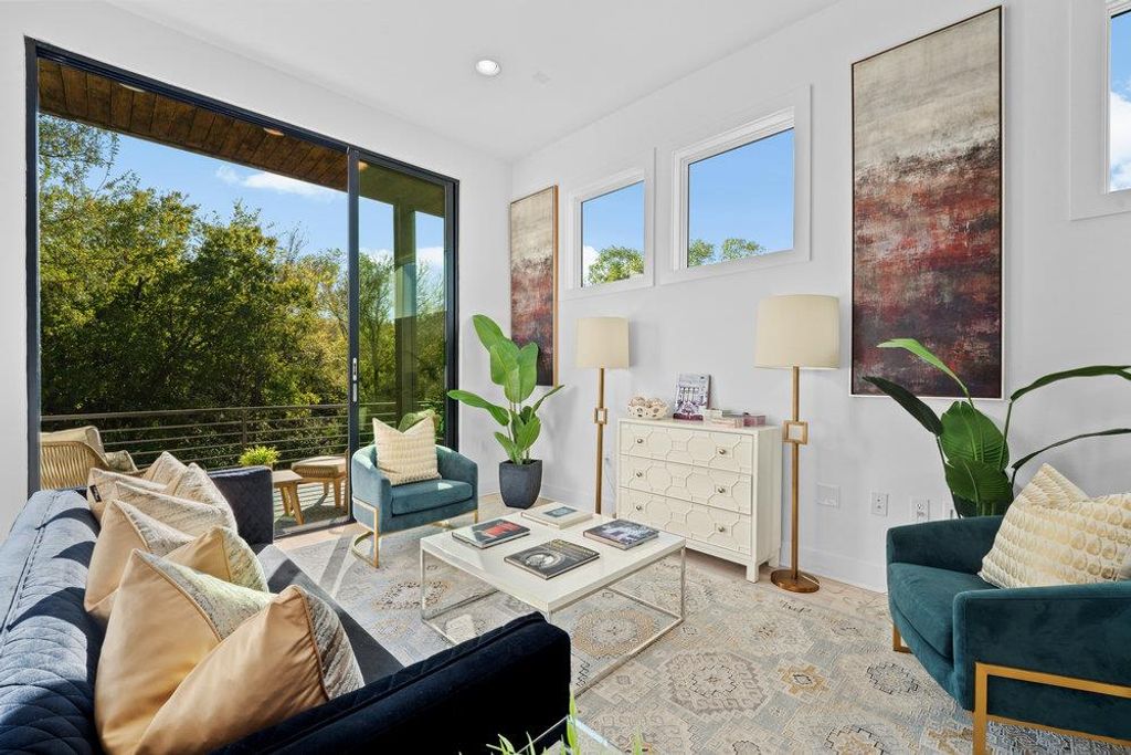 Fantastic new 3 story detached townhome w/modern architecture, sleek finishes, beautiful community, minutes from downtown! Located within The Park at Sunridge by Intown Homes - an enclave of 18 private residences adjacent to a community park. Located on one of the most coveted lots in a culdesac backing to mature trees. Light+bright w/11 ft ceilings, hardwood floors throughout & 8 ft doors. One bedroom on the first floor w/access to a backyard. Ensuite bathroom w/a stand-alone shower & walk in closet. Can also be used as an office. Main living area is on the second floor w/an abundance of windows. 10ft tall stackable sliding doors off the living room lead to a deck backing to peaceful scenery. The chef's kitchen features Bosch appliances, soft close cabinets, quartz counters breakfast bar, large walk-in pantry, marble backsplash & a window at the sink. Primary suite on the 3rd floor w/a beautiful picture window looking out to greenery. Primary bath w/a large shower & separate soaking tub, both w/luxurious marble surround (hand-held sprayer + showerhead), 2 sinks at the vanity w/tall framed mirrors. 3rd floor includes a bedroom w/ensuite bath, closet & laundry. Partial view of DT from 3rd floor. Smart home, wired for surround sound, tankless water heater, security system, floor plug in living rm, Anderson wood windows, garage for 1 car & storage (can be 2 car if needed), also includes one connected assigned parking space. New construction w/warranty. Intown Homes is a trusted Texas builder + a leader in developing design-driven townhome communities in Austin, Houston & Dallas for over 30 yrs. Emerging area w/major development including upcoming River Park (aka East Side Domain) w/retail, light rail, trail system, Live Nation music venue, all within walking distance. Convenient location w/proximity to S. Congress (new HEB), DT, hike/bike trail & airport. Landscaping maintained by HOA. Ask about year end promo w/2% flex cash (interest rate buy down).