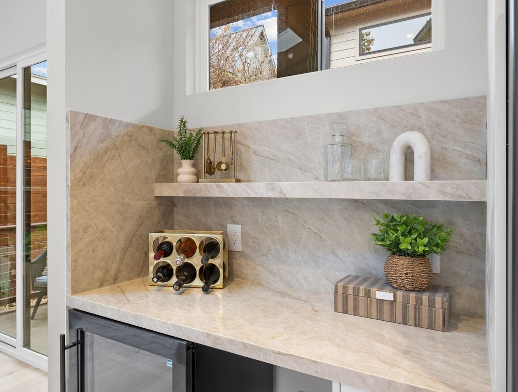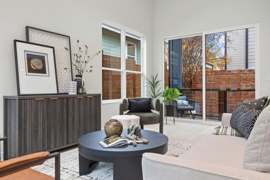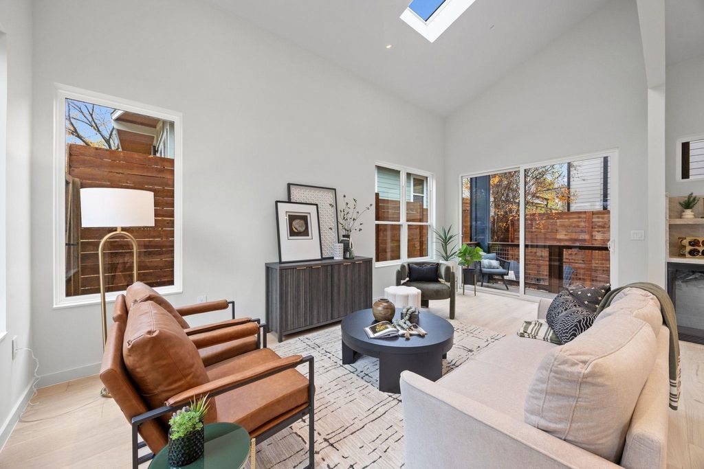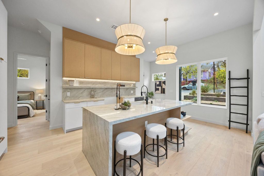 Experience elegant modern living in this stunning new build by J Davis Construction, ideally situated in vibrant East Austin. From the moment you arrive, the home makes a striking impression with beautifully designed xeriscaping that enhances curb appeal while keeping upkeep effortless. Thoughtfully crafted with a perfect balance of style and comfort, the open floor plan features soaring ceilings and expansive windows that flood the space with natural light, accentuating the rich wood floors throughout. The living room, highlighted by a skylight, flows seamlessly into the show-stopping kitchen"”an entertainer's dream with luxurious Taj Mahal quartzite countertops, an oversized island with bar seating, a dedicated mini bar plumbed for an ice maker, abundant cabinetry with warm under-cabinet lighting and pull-out drawers, and a premium GE Cafe appliance package. A bedroom, conveniently located near a chic full bath, completes the main level. A thoughtfully designed staircase leading to the second level features motion-sensored handrail lighting, offering enhanced safety, subtle nighttime illumination, and a sleek architectural detail. The primary suite is a true retreat, offering direct access to a turfed balcony"”perfect for morning coffee, evening wind-downs, or a quiet moment enjoying the views. The primary suite also includes a walk-in closet with custom built-ins and an ensuite with dual vanities and a frameless glass shower. An additional upstairs bedroom with its own ensuite bath provides ideal flexibility for guests, a home office, or creative space. Outdoors, the fully fenced backyard invites relaxation and entertaining with a covered patio, an additional covered area for lounging or grilling, and drought-resistant landscaping that's both beautiful & practical. All of this is set in a prime location just steps from the elementary school & minutes from downtown, the airport, and East Austin's beloved dining, shopping, & culture. (CONDO REGIME W/ NO MONTHLY FEES)