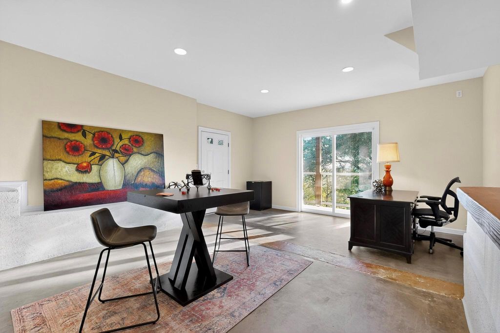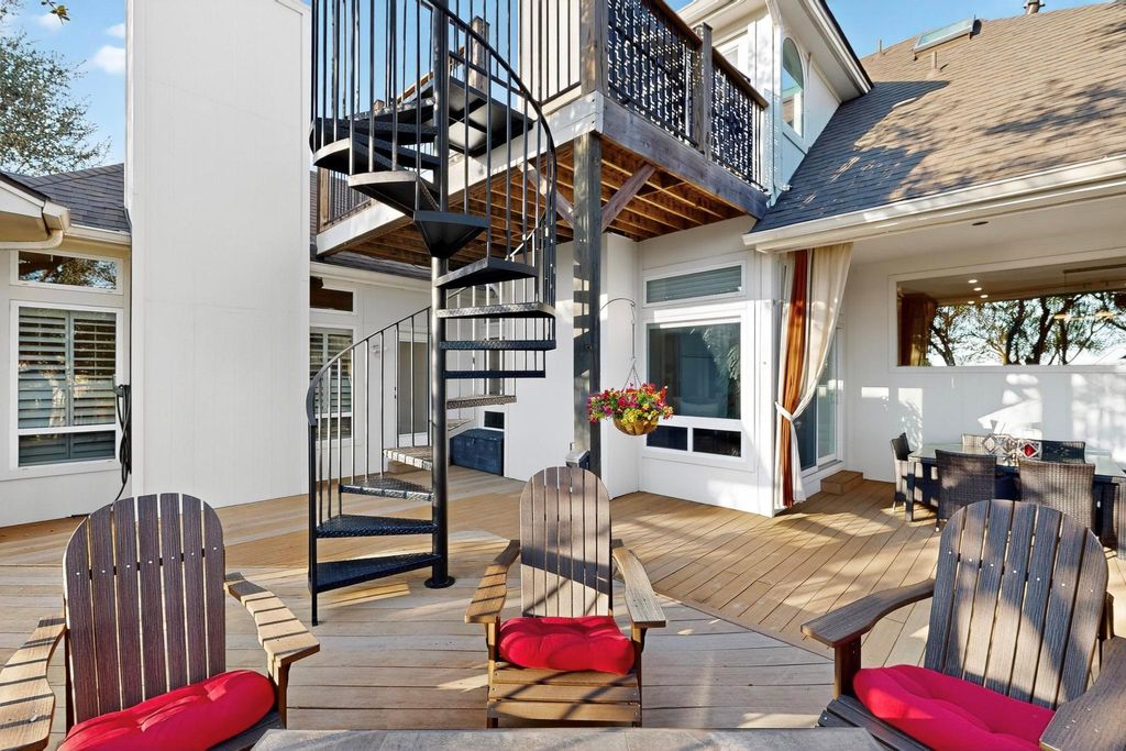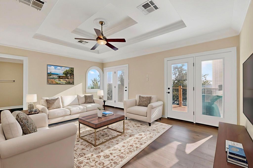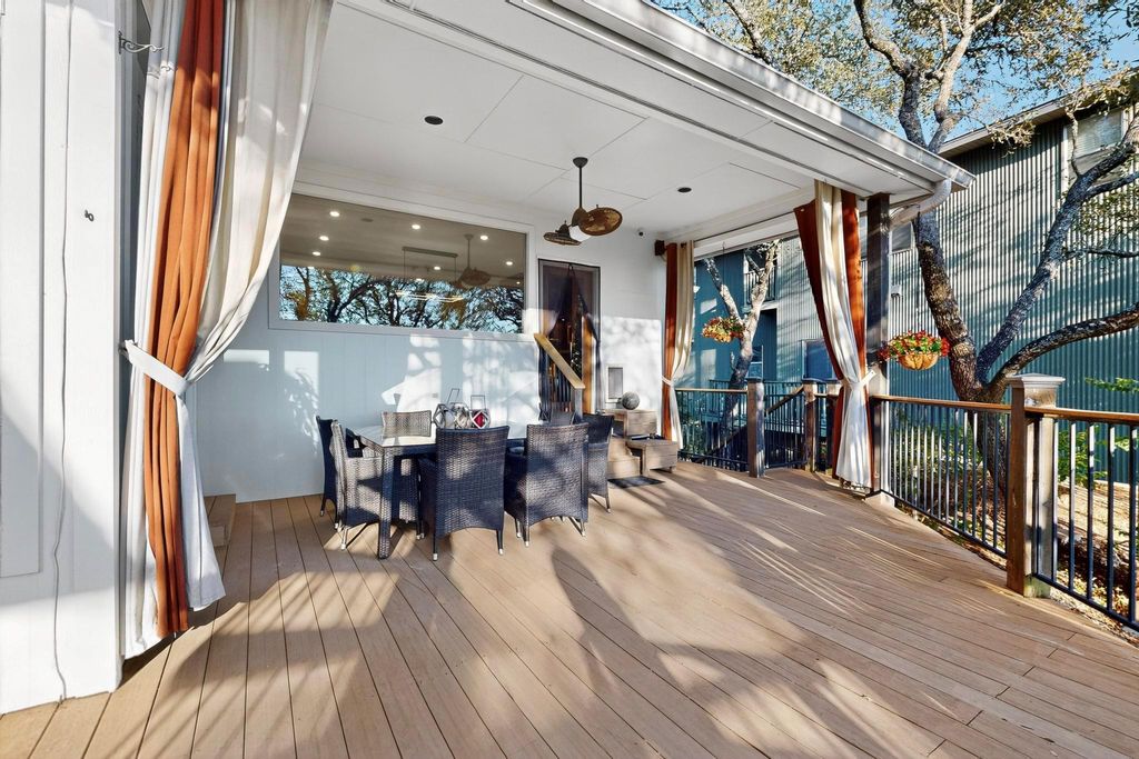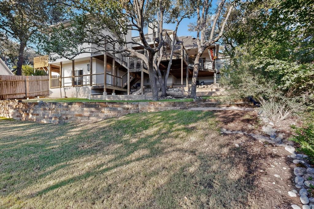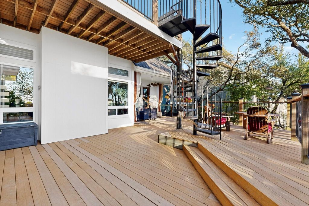 Nestled on nearly half an acre with sweeping hill views, including distant views of downtown and Lake Austin, this custom Ash Creek home blends craftsmanship, comfort, and modern elegance while being surrounded by lush woods and mature trees. Meticulously updated over the years, it offers approximately 2,700 sqft of living space plus a 430 sqft finished flex area that is perfect for a man cave, home office, art studio, home gym, or media room with its own half bath. Step inside to discover architectural character throughout: coffered, vaulted, trayed, and boxed ceilings; 6-inch plank hardwood floors; and Low-E double-pane windows that frame stunning views and bathe the interior in natural light. The versatile upstairs loft with a full bath and its own deck is ideal for guests, a second living area, or a creative escape while gazing at your view. The chef's kitchen is a true centerpiece with custom cherrywood cabinetry, oversized island, dual ovens, warming drawer, and extensive accent lighting. A massive picture window overlooks the trees and beautiful deck. The expansive primary suite features a fireplace, a spa-inspired bath, and an oversized 240 sq ft walk-in closet complete with its own washer/dryer and some hidden surprises. Enjoy over 1,100 sq ft of composite decking that invites outdoor entertaining under the stars while enjoying the wildlife of the surrounding woods and Balcones Canyonland Preserve from an elevated height. A dog door with access to the deck and a fenced dog pen makes it easy for four-legged family members, too. This well-maintained home has a brand-new roof (September) and new paint throughout. It blends high-end finishes with thoughtful design, offering both comfort, sophistication, and unmatched character in one of Austin's most desirable locations.