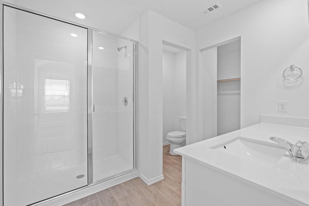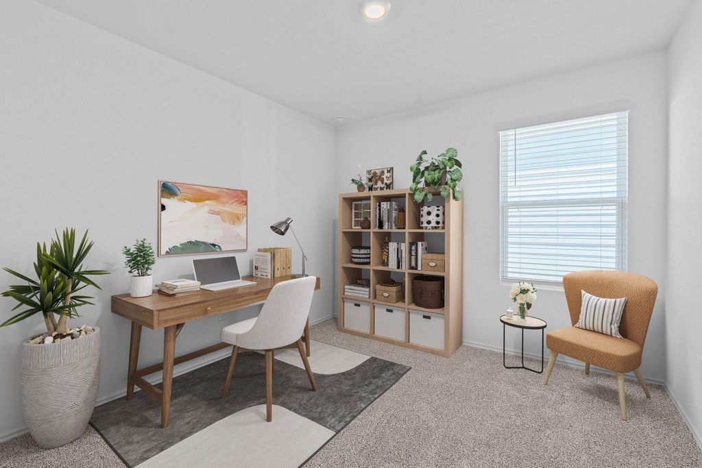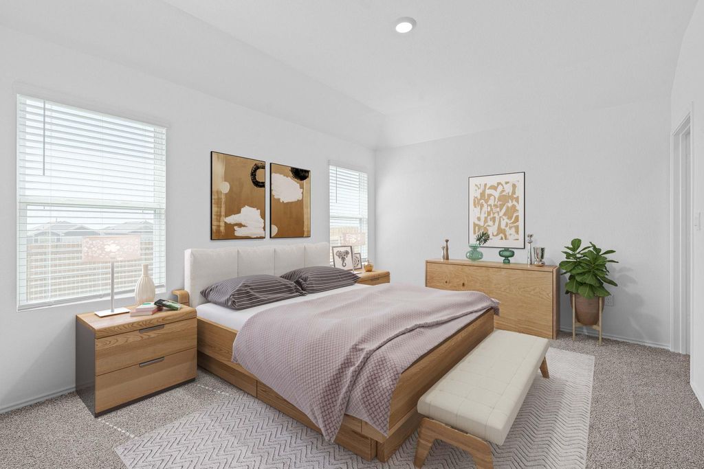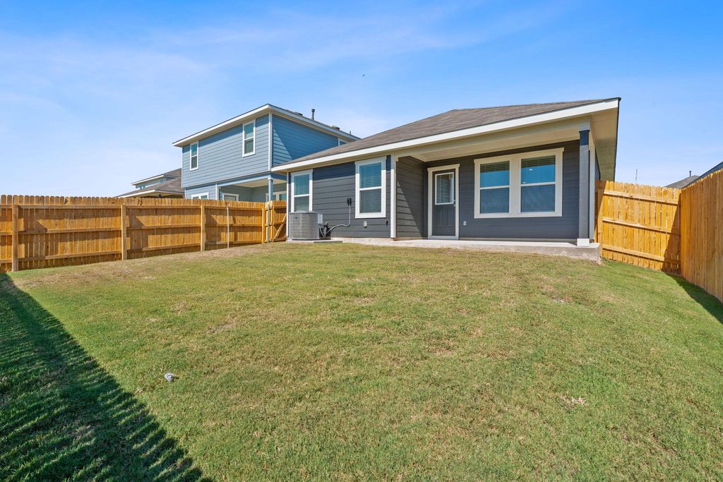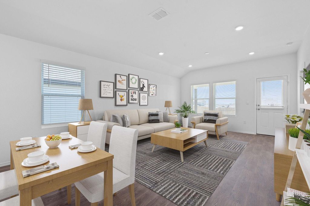 Check out the Amber floor plan featured in our Durango community in Mustang Ridge, TX. The Amber is a 1,276 sq. ft.3 bedroom, 2 bathroom single-story home. Entering the home you step into the open foyer with access to the laundry room. Walking further into the home you are greeted by the spacious kitchen overlooking the dining area and living room. The kitchen features quartz countertops, stainless steel appliances, recessed lighting and a kitchen island. The private main bedroom, bedroom 1, is located off the living room and includes an ensuite with a huge walk-in closet and walk-in shower. You will find the 2 additional bedrooms and full bathroom just off the kitchen. This home comes included with a professionally designed landscape package and a full irrigation system as well as our Home is Connected base package that offers devices such as a Video Doorbell, Deako Smart Light Switch, a Honeywell Thermostat, and more.