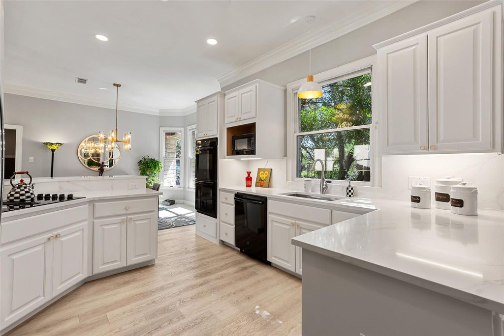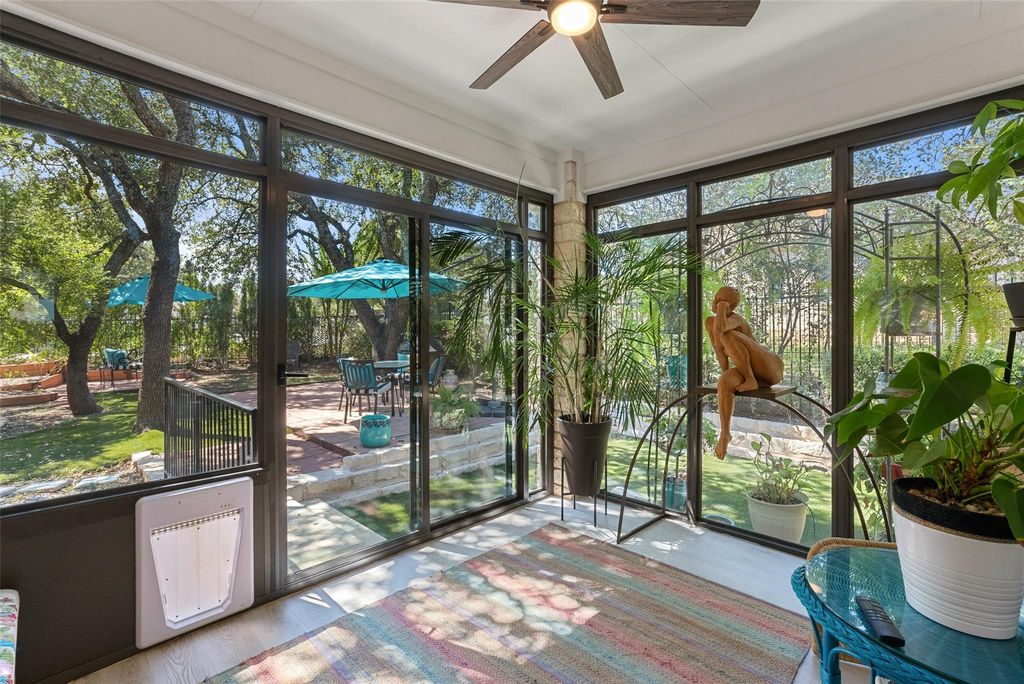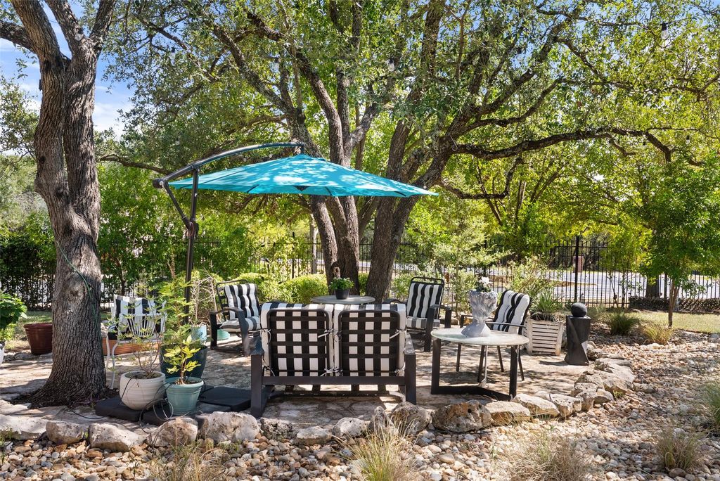 Tucked beneath a canopy of mature oaks on a quiet cul-de-sac within the exclusive guard-gated community of The Hills of Lakeway, this thoughtfully remodeled single-story retreat invites you to slow down and savor every moment. As you arrive, the soft rustle of leaves and dappled light filtering through the trees hint at the sense of calm that awaits inside. Step through the cheerful blue front door and into a world where curated design meets effortless comfort"”where every detail has been considered. Modern wood-look luxury vinyl floors stretch across the home, grounding the space with a warm, organic feel. The heart of the home, a sun-drenched kitchen, gleams with crisp white cabinetry, sleek quartz countertops, matte black appliances, and an airy flow that encourages conversation across the open-concept living and dining rooms. Gather with loved ones around the fireplace, or sip your morning coffee in the breakfast nook overlooking a lush private garden. Every room whispers a designer's touch"”from imported European lighting to stylish wallpapered baths that exude boutique charm. Step into the glass-enclosed meditation patio and feel the world fall away. This versatile flex space, wrapped in greenery, offers a year-round connection to nature. Outside, on your oversized 0.34-acre double lot, meandering paths and native landscaping lead you to multiple outdoor living areas"”ideal for entertaining or quiet reflection. The low-maintenance fenced backyard features artificial turf and vibrant accents. Retreat to your generous primary suite, where peaceful views and a spa-like bath with soaking tub and marble walk-in shower elevate your daily ritual. Living in The Hills means access to 24-hour guarded entry, parks, trails, and optional memberships to The Hills Country Club with golf, tennis, fitness, and dining. Nearby, enjoy Lakeway's lakefront parks, top-rated schools, and Bee Cave's shops and restaurants. Your sanctuary awaits.
