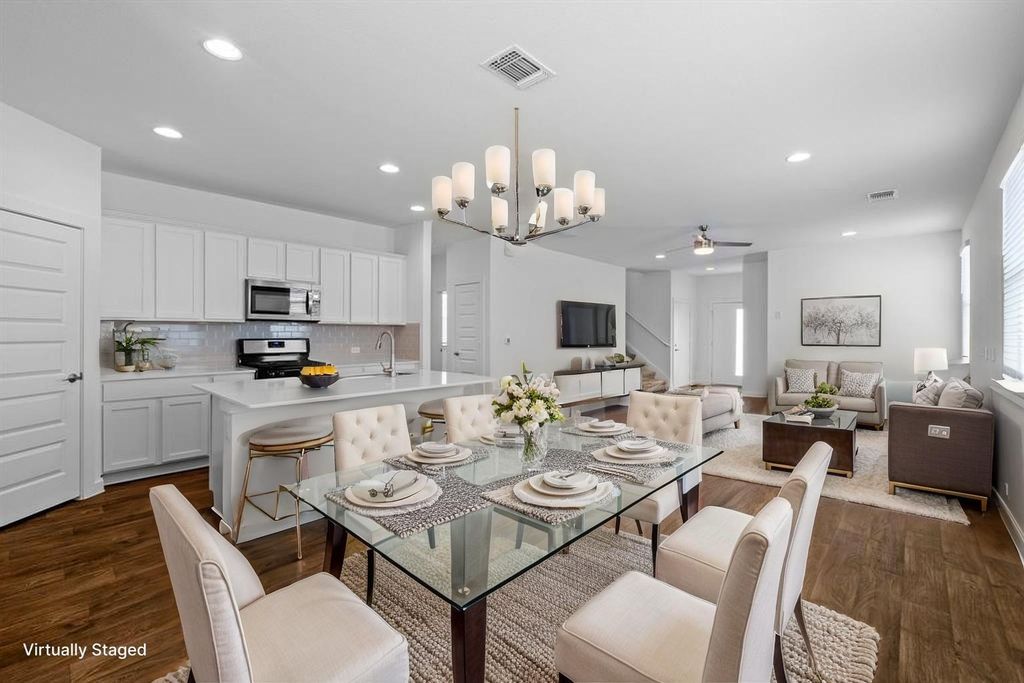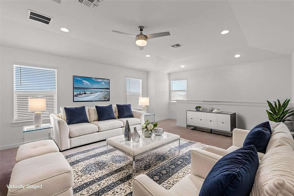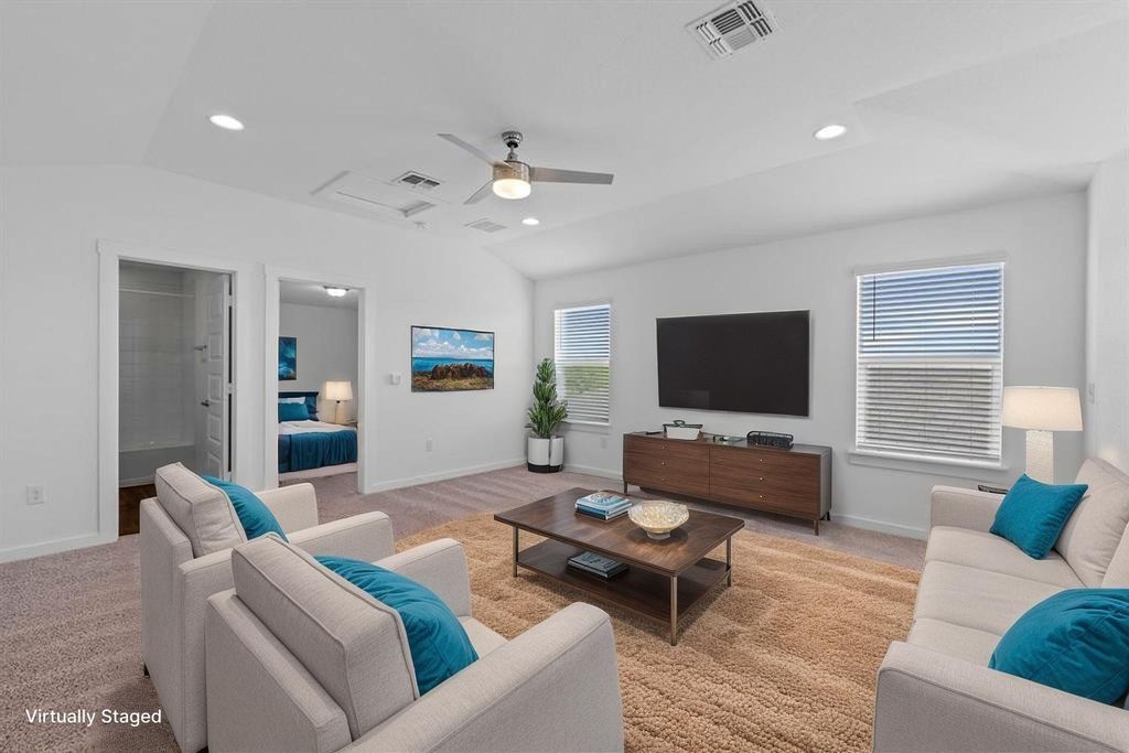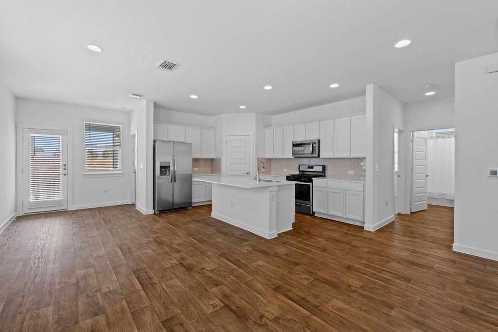Experience modern living in this stunning 4 bedroom, 3 full bathroom home in the desirable Cantarra community. Spanning 2,320 square feet, the home features a bright, open floorplan filled with natural light and stylish vinyl plank flooring throughout the main living areas. The gourmet kitchen is a chef's dream, boasting a large center island, quartz countertops, and stainless steel appliances, perfect for entertaining or everyday cooking. The main floor primary bedroom offers a private ensuite bath, along with two additional bedrooms for family or guests. Upstairs, a spacious living area provides flexibility for a media room or lounge, accompanied by an additional bedroom and full bath. Step outside to a covered patio and enjoy serene views of the pond. Combining modern finishes, functional design, and a sought-after location, this home is the perfect place to call your own.
