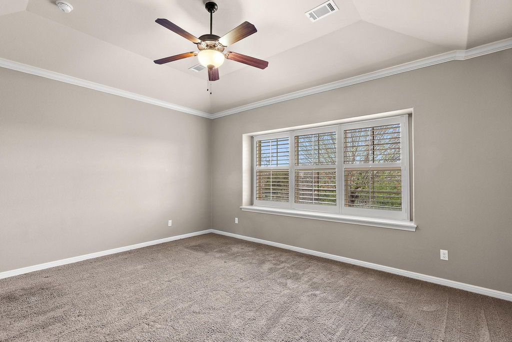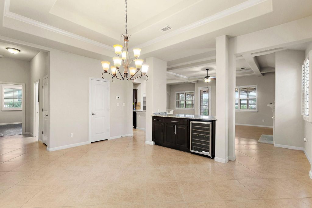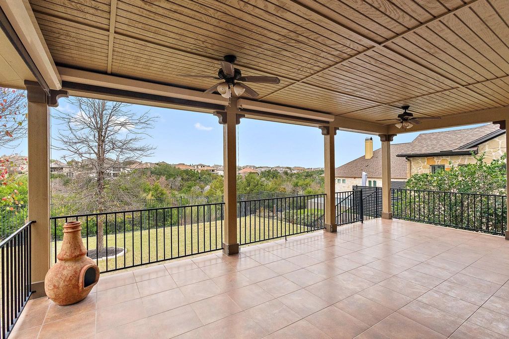 Offering refined Hill Country living in an amenity rich Austin community designed for both comfort and connection. Inside, the open floor plan features low maintenance flooring throughout the main living areas and plush carpeted bedrooms. Architectural details include coffered and tray ceilings, crown molding, and a well appointed dining area with a serving island and built in wine fridge. The kitchen is anchored by a center island, offers seamless flow into the living space, and includes all major stainless steel appliances that convey. The primary suite impresses with dual separate vanities, a spacious shower, and an oversized walk in closet. From the living space, enjoy access to an expansive covered patio overlooking a fenced backyard, ideal for relaxing or entertaining year round. Residents enjoy outstanding community amenities including resort style pools, a fitness center, scenic hiking and biking trails, parks, and nearby Lake Travis access with marina and waterfront features. Conveniently located near shopping, dining, and local attractions, this home blends elevated design with an exceptional lifestyle in one of Austin's most desirable communities. Discounted rate options and no lender fee future refinancing may be available for qualified buyers of this home.