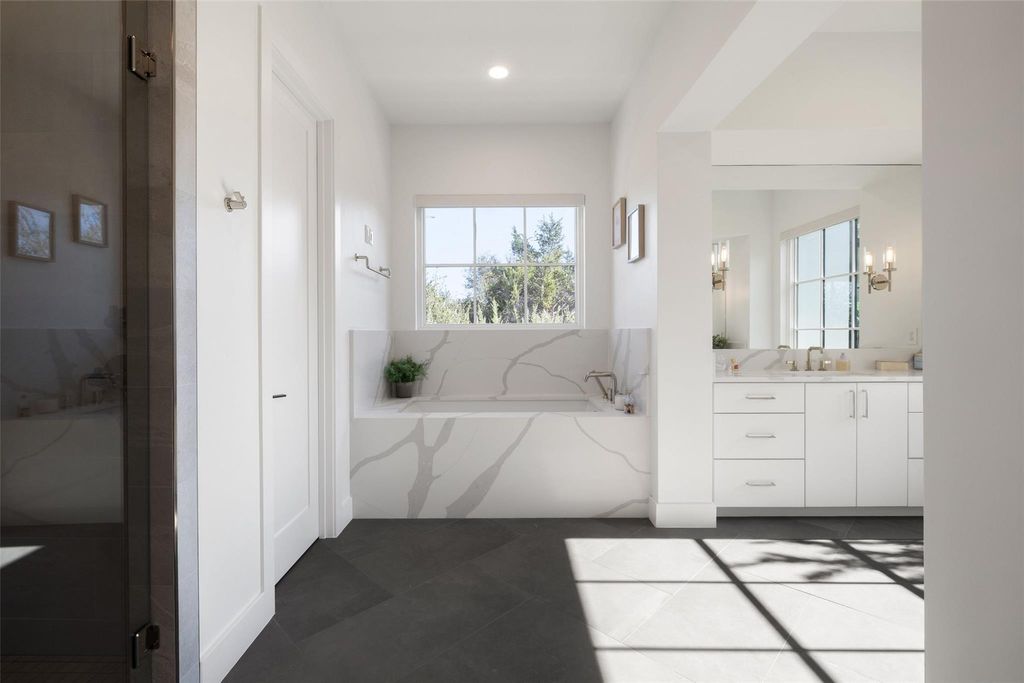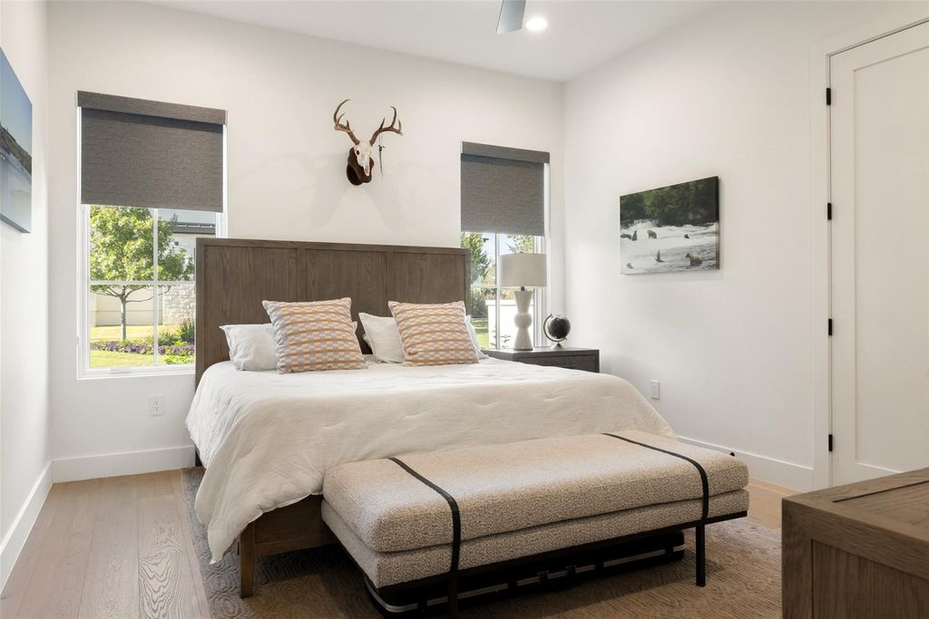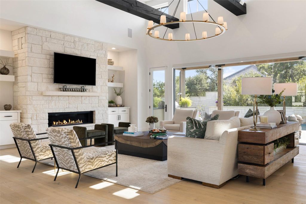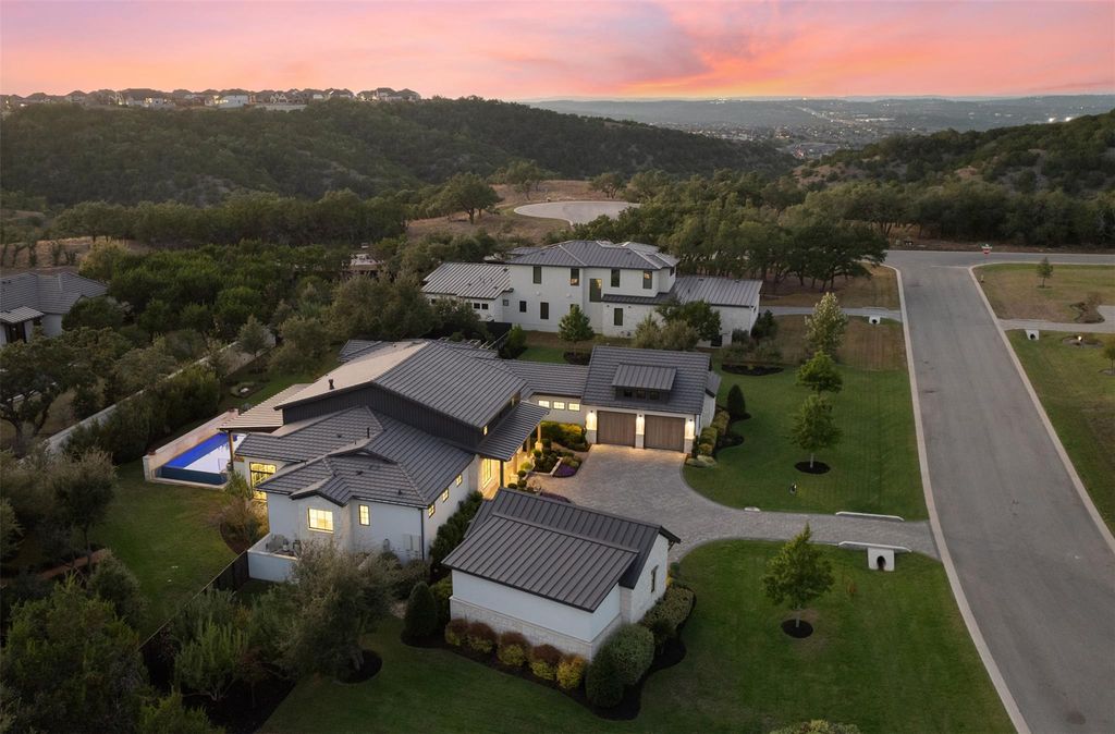 Welcome to 17213 Morning Grove Lane, a beautifully executed single-story custom home built by Eppright Homes in 2023 and situated on a flat, oak-studded lot in the gated community, Madrone Canyon. With thoughtful architecture and timeless Hill Country appeal, this home pairs soft modern finishes with warm natural textures highlighted by wide-plank wood floors, vaulted ceilings with beams, designer lighting, and abundant natural light throughout. An open-concept layout connects the spacious living room, dining area, and gourmet kitchen, where professional-grade appliances and a generous island anchor the heart of the home. Designed for both comfort and flexibility, the home includes four spacious bedrooms each with its own en-suite bath, plus two separate offices, a dedicated pool bath, and a well-appointed four-car garage. The primary suite is a private retreat, featuring serene backyard views, a spa-style bath with a deep soaking tub, oversized walk-in shower, dual vanities, and a beautifully customized closet. Every detail inside has been intentionally selected, from the ambient lighting and wallpaper accents to the automated window shades and bespoke hardware. Out back, a resort-style pool and spa with a negative edge and waterfall feature become the centerpiece of the landscape, surrounded by a large covered patio, raised garden beds, and open lawn shaded by mature oaks. With its calm, elegant style and a layout that blends functionality with ease, 17213 Morning Grove Lane offers refined Hill Country living just minutes from everyday conveniences in both Bee Cave and Lakeway along with top-rated Lake Travis schools.