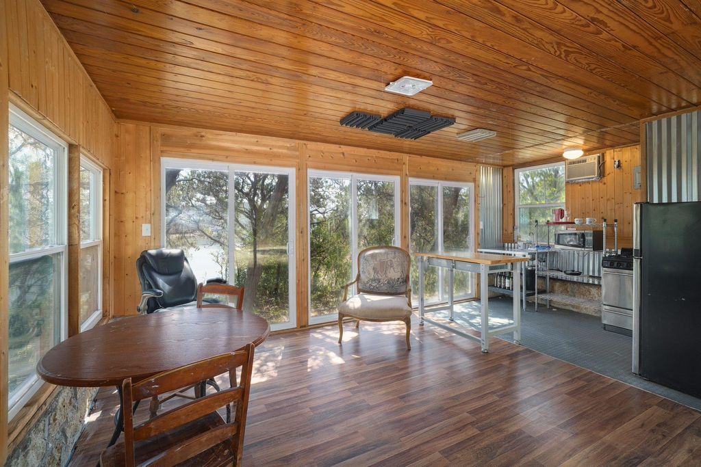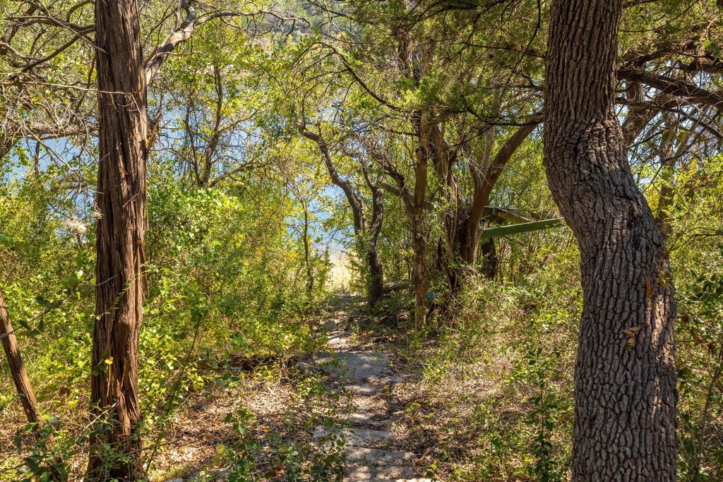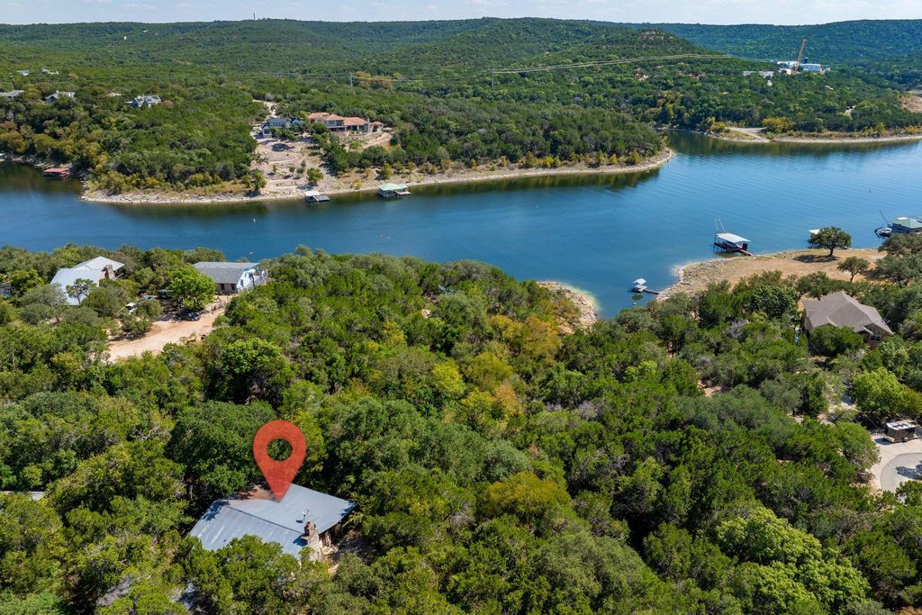 You've arrived. Step through the veil into your own private retreat"”hidden along the tranquil shores of Lake Travis within the enchanting Trails End community. This extraordinary 5.8+ acre sanctuary, spanning four legal lots, feels like something out of a fairytale. Untouched hilly wilderness, shaded by towering oaks and old-growth Ashe juniper, rolls gently down toward the water's edge. Dappled light dances across native undergrowth, and the air hums with the quiet meeting of water and land. The 3-bedroom, 1-bath main house offers a comfortable foothold, surrounded by multiple outbuildings that hint at both utility and untapped potential. Winding woodland paths lead you to a rustic cabin perched at the water's edge, where panoramic lake views stretch across 200+ feet of private waterfront reaching 630 feet in depth, deeded to the center of the Lime Creek arm of Lake Travis. This isn't "just another waterfront lot." It's a canvas of dreams"”a sanctuary cloaked in trees, where water meets stone and architecture meets poetry.