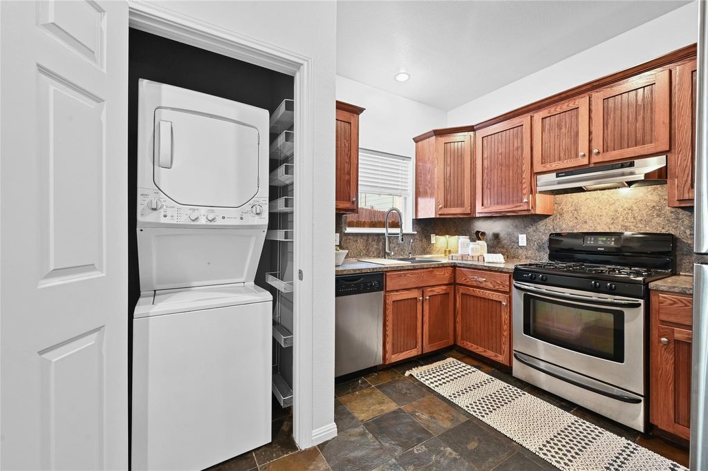 APPLIANCES | Dishwasher, Disposal, Free-Standing Range, Refrigerator, Stainless Steel Appliance(s), Washer/Dryer Stacked, Water Heater |