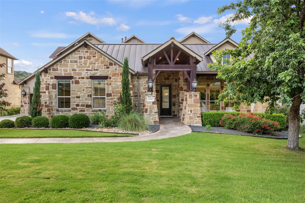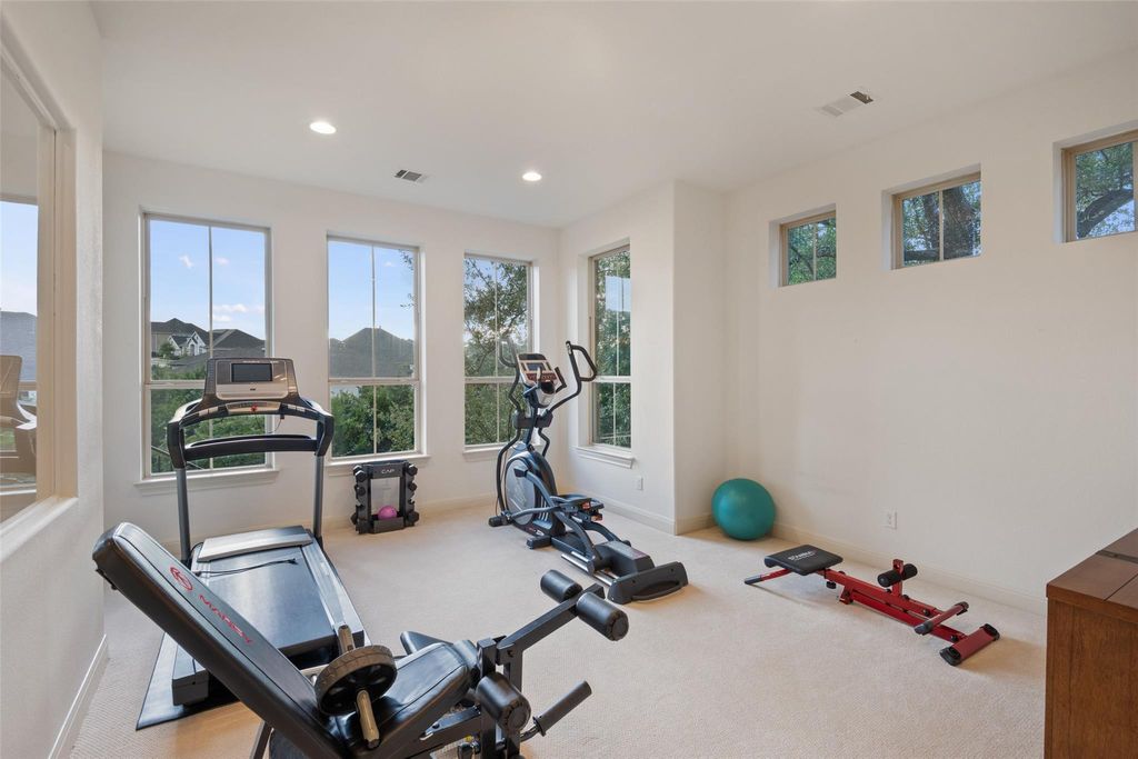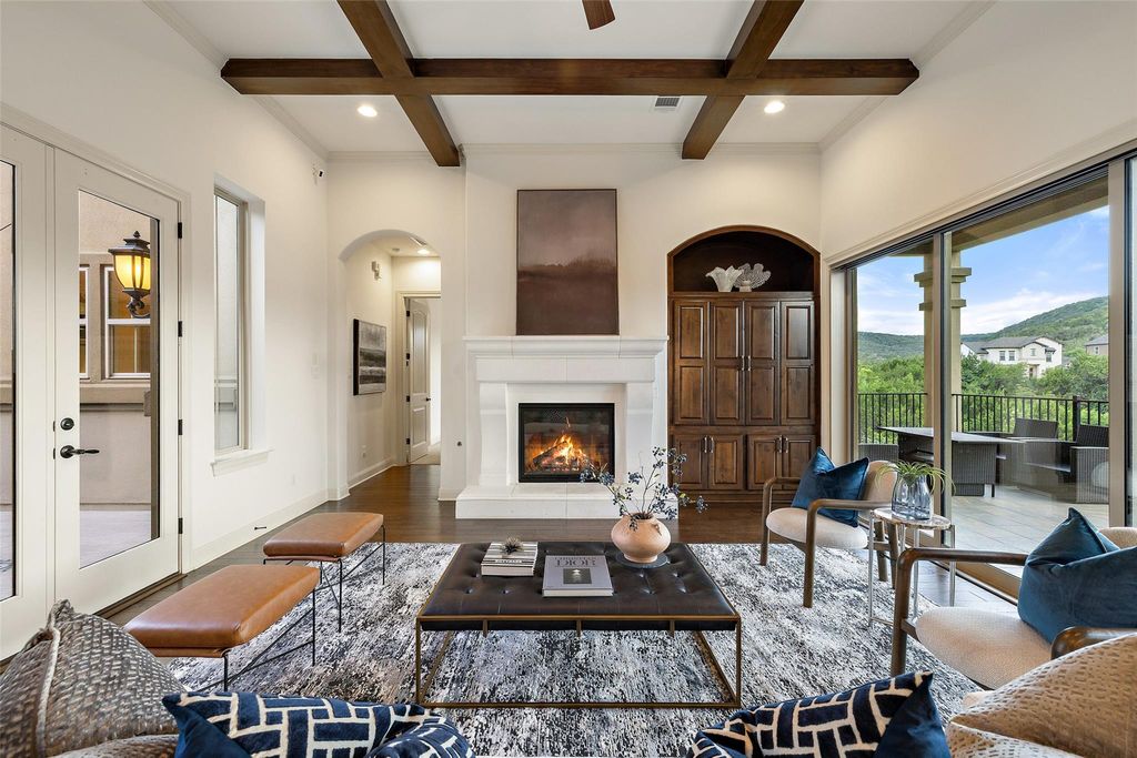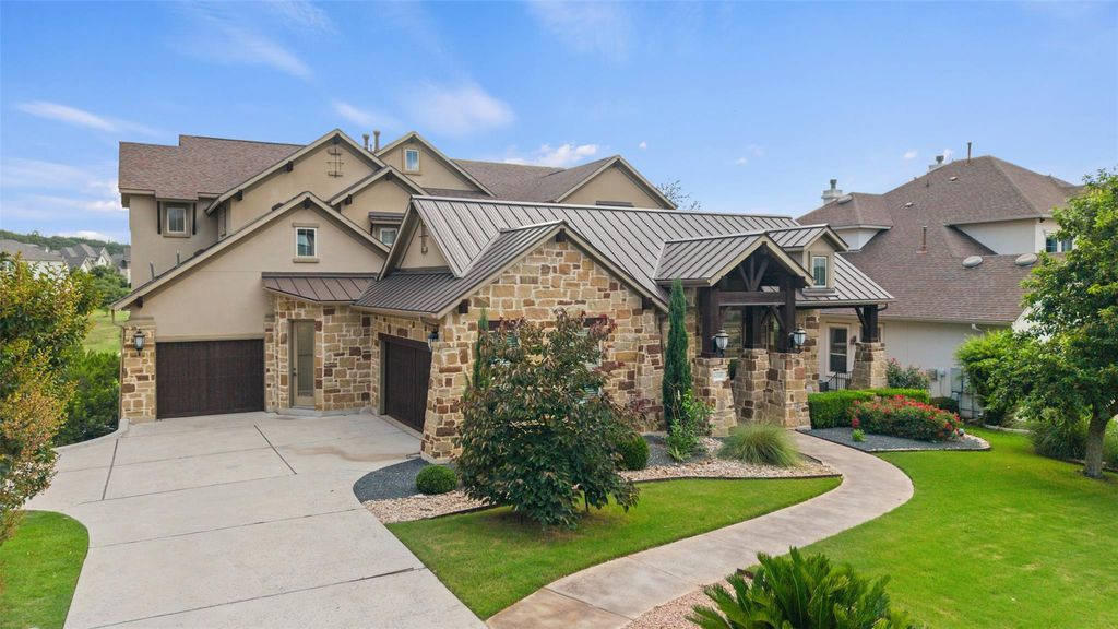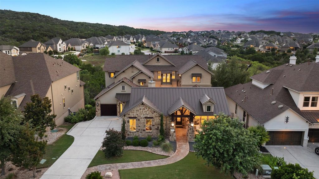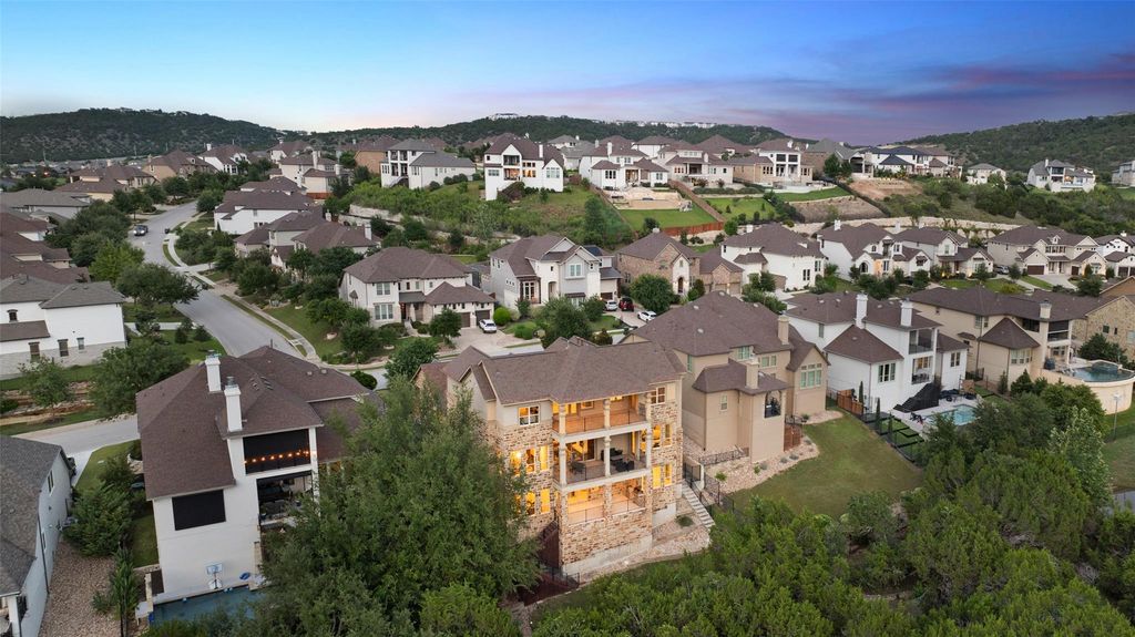Nestled in the exclusive gated community of Davenport Summit, this expansive former model home is a true standout. Situated on a serene greenbelt lot and spanning over 6,000 square feet, the home offers three levels of covered patios that provide stunning views and ample outdoor living space. Step inside and be greeted by rich wood flooring and a charming center courtyard with a wood-burning fireplace"”the perfect setting for enjoying starlit Texas nights. A private, light-filled office, thoughtfully positioned at the front of the home, ensures optimal productivity. Designed for gatherings, the oversized dining room offers spacious areas for both formal dining and relaxed lounging. The gourmet chef's kitchen is a true culinary masterpiece, outfitted with top-tier JennAir appliances, including a commercial-grade 48" range with dual ovens, a 48" built-in refrigerator, and an additional third built-in oven. Natural light floods the family room through a wall of sliders, highlighting a timeless cast stone fireplace. The main level also hosts the expansive primary suite, which offers direct patio access, a luxurious en-suite bathroom, and convenient laundry room access. The unique basement level is an entertainer's dream, featuring a spacious guest suite, a sophisticated pub room with a fireplace and wet bar, a versatile space ideal for a home gym or secondary office, and a distinctive wine room tucked under the staircase. Upstairs, discover another guest en-suite bedroom, two additional bedrooms connected by a Jack and Jill bathroom, a dedicated media room, and a game room with access to the top covered patio, complete with built-in cabinetry and dual refrigerators"”ensuring ample space for family and guests alike. Enjoy year round soffit lighting! The Sweetwater community features 2 resort style pools, a neighborhood only gym, basketball, pickleball and sand volleyball courts, dog park and miles of hiking and biking trails that are easily accessed from the home.