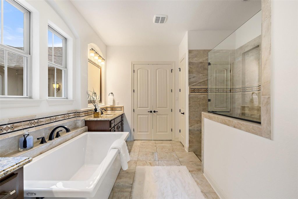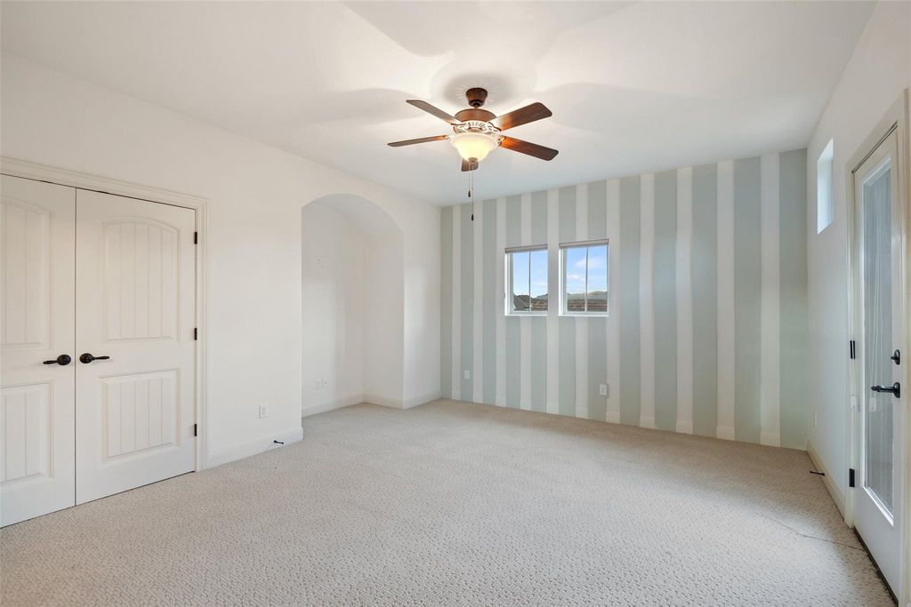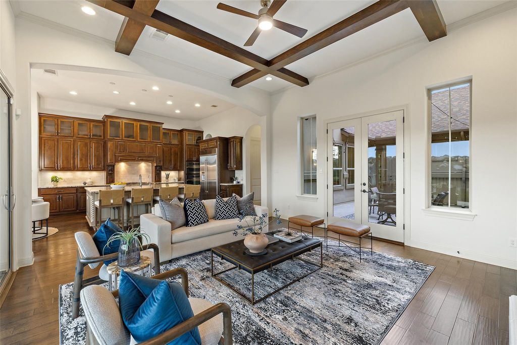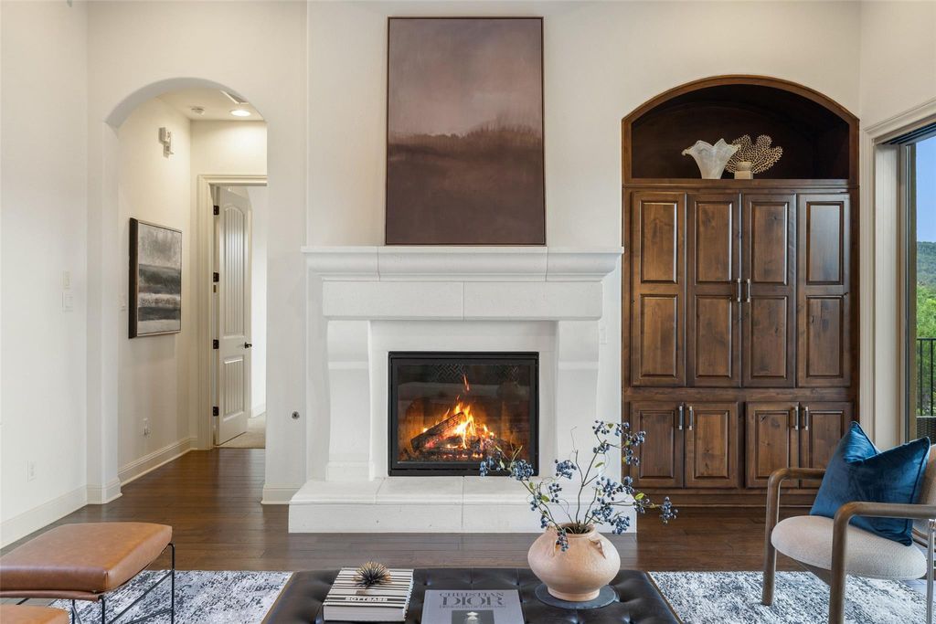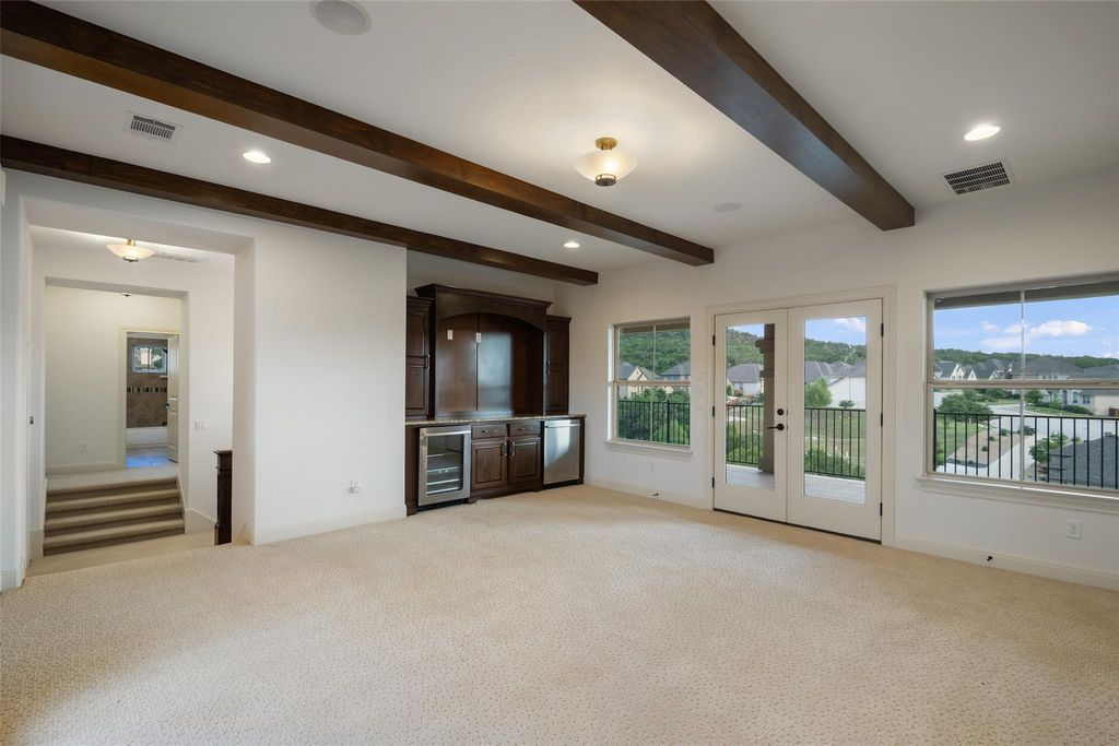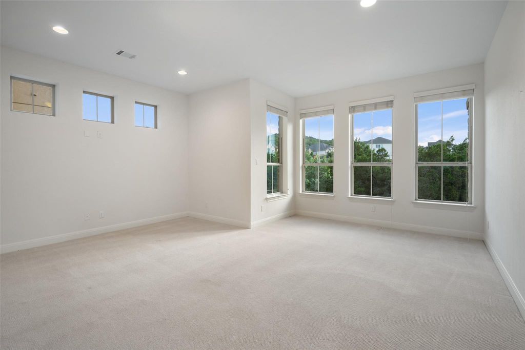 Nestled in the exclusive gated community of Davenport Summit, this expansive former model home is a true standout. Situated on a serene greenbelt lot and spanning over 6,000 square feet, the home offers three levels of covered patios that provide stunning views and ample outdoor living space. Step inside and be greeted by rich wood flooring and a charming center courtyard with a wood-burning fireplace"”the perfect setting for enjoying starlit Texas nights. A private, light-filled office, thoughtfully positioned at the front of the home, ensures optimal productivity. Designed for gatherings, the oversized dining room offers spacious areas for both formal dining and relaxed lounging. The gourmet chef's kitchen is a true culinary masterpiece, outfitted with top-tier JennAir appliances, including a commercial-grade 48" range with dual ovens, a 48" built-in refrigerator, and an additional third built-in oven. Natural light floods the family room through a wall of sliders, highlighting a timeless cast stone fireplace. The main level also hosts the expansive primary suite, which offers direct patio access, a luxurious en-suite bathroom, and convenient laundry room access. The unique basement level is an entertainer's dream, featuring a spacious guest suite, a sophisticated pub room with a fireplace and wet bar, a versatile space ideal for a home gym or secondary office, and a distinctive wine room tucked under the staircase. Upstairs, discover another guest en-suite bedroom, two additional bedrooms connected by a Jack and Jill bathroom, a dedicated media room, and a game room with access to the top covered patio, complete with built-in cabinetry and dual refrigerators"”ensuring ample space for family and guests alike. Enjoy year round soffit lighting! The Sweetwater community features 2 resort style pools, a neighborhood only gym, basketball, pickleball and sand volleyball courts, dog park and miles of hiking and biking trails that are easily accessed from the home.