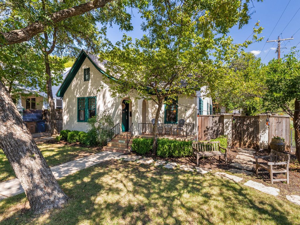 Beautifully restored 1932 Tudor in Shoal Crest, just east of Pemberton with fabulous walkability. Carefully maintained by its interior designer owner, this home blends privacy with an unbeatable central location. The fully fenced corner lot is minutes from downtown, the University of Texas, Shoal Creek Trail, Pease Park, and neighborhood favorites like Tiny Boxwoods, Musashino Sushi, Counter Cafe, and Central Market. Inside, arched entries, custom built-ins, and refined finishes create a timeless yet fresh feel. Every space balances comfort and function, wrapped in a warm, inviting style. The primary suite offers a true retreat with its own fireplace, a library with built-ins and desk space, a walk-in closet, and a screened porch"”perfect for quiet mornings or unwinding at day's end. The en-suite bath is elevated with French hand-painted tiles. A second en-suite bedroom at the front of the home provides comfort and privacy for guests. Outdoor living includes a welcoming front patio, a vine-covered pergola for dining, and a shaded lawn under mature trees. An automatic gate, garage, and additional parking complete this rare opportunity to own a restored Tudor in one of Austin's most desirable pockets.