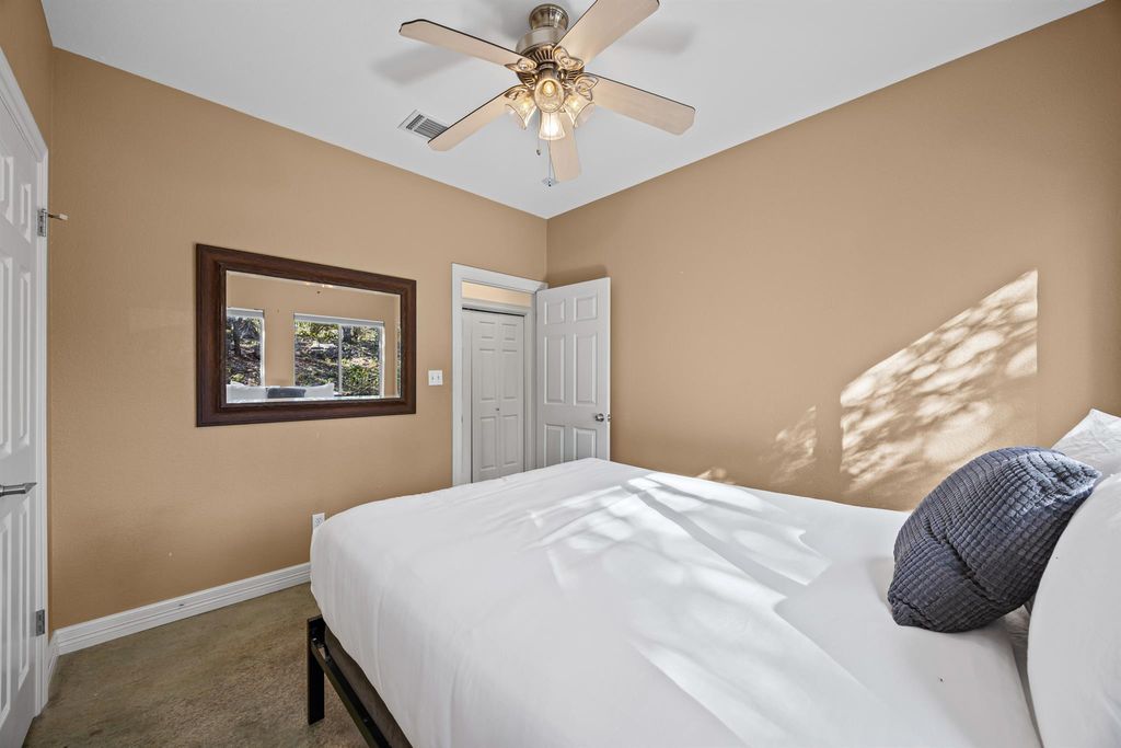Discover peaceful living in this secluded woodland getaway near the lake, perfectly situated on a quiet one-acre homesite. This roomy 3-bedroom, 2-bath residence blends privacy, comfort, and natural surroundings, making it an ideal escape from everyday noise. Nestled among mature trees and accessed by a long, private drive, the home offers a true sense of retreat. Step onto the welcoming front porch"”perfect for morning coffee or unwinding in the evenings. Inside, the open-concept layout and vaulted ceilings fill the home with natural light, creating an airy and inviting feel. The eat-in kitchen provides generous cabinetry and opens effortlessly into the main living space, ideal for gatherings or cozy nights at home. New carpet in the upstairs bonus room, while the spacious primary suite features a private en-suite bath complete with dual sinks and a tiled shower. Out back, enjoy the serenity of a covered deck overlooking the serene, wooded backdrop, with a private walking trail leading down to a tranquil creek"”your own slice of nature. Additional highlights include a built-in sauna located in the garage for relaxation year-round. Bring your chickens, animals, or enjoy a more self-sufficient lifestyle"”this property offers the freedom to do so. HOA participation is optional and provides access to the community pool, lake, and additional amenities. Located just minutes from the lake, outdoor enthusiasts will love the nearby boating, kayaking, fishing, paddleboarding, swimming, and lakeside picnicking. Whether you're seeking quiet seclusion or easy access to recreation, this unique property delivers the best of both worlds for a relaxed, nature-focused lifestyle.