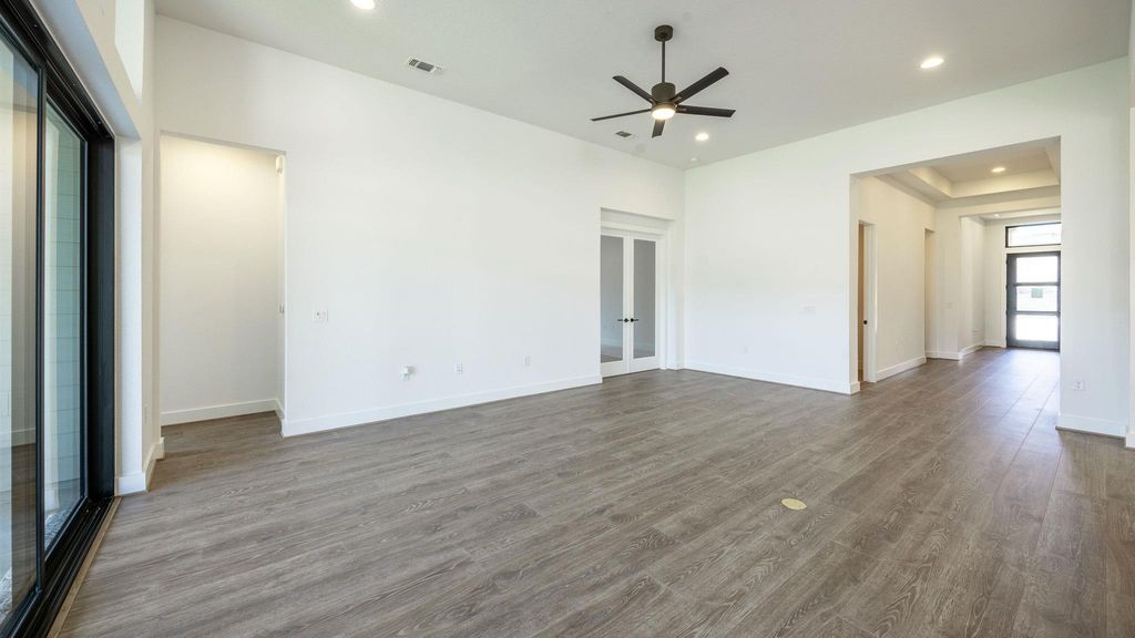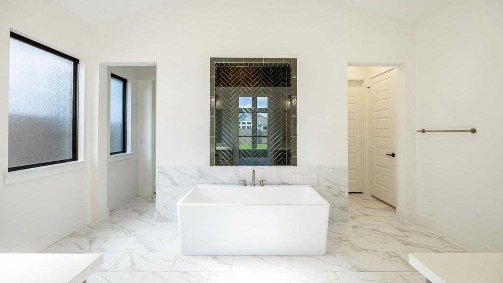 READY FOR MOVE-IN! Generous front porch leads to a 12-foot entry. Entry extends past secondary bedrooms with walk-in closets and a Hollywood bathroom. Family room with a 12-foot ceiling and a sliding glass door. Island kitchen with built-in seating space, 5-burner gas cooktop and a corner pantry opens to the dining area. Secluded primary suite with soaring 14-foot ceiling and a wall of windows. Primary bath hosts dual vanities, freestanding tub, separate glass enclosed shower, two walk-in closets and a linen closet. A large game room with French door entry just off the family room. Extended covered backyard patio. Utility room and mud room just off the three-car garage.