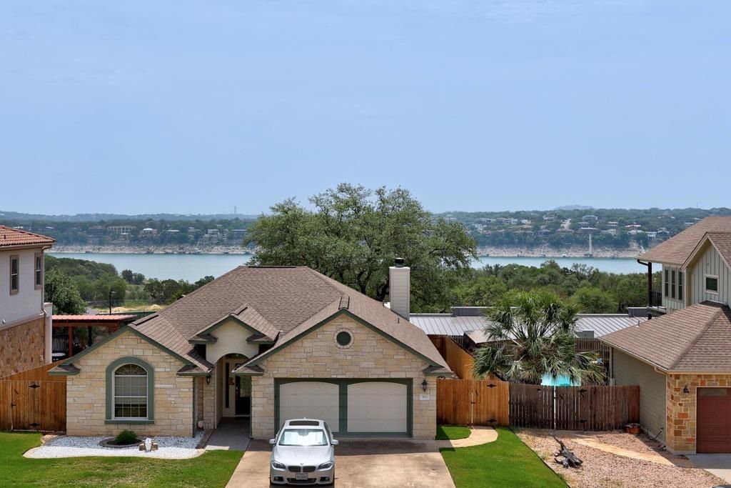 Exceptional value! This spacious 3-bedroom, 2.5-bath home is your gateway to the coveted Lake Travis lifestyle in Lago Vista/Point Venture. Built in 2009 and offering 2,223 sq ft, this two-story home blends comfortable everyday living with access to resort-style amenities. Step inside to an inviting open-concept main level with tile and laminate flooring, recessed lighting, and high ceilings that create a bright, open feel. The kitchen is the heart of the home, featuring a center island, breakfast bar, granite/marble counters, and great storage. It opens seamlessly to the dining and living areas, making it ideal for entertaining or easy weeknight living. Upstairs, the generous primary suite is a true retreat with a large walk-in closet, double vanity, relaxing garden tub, and separate shower. Two additional bedrooms and secondary baths provide flexible space for family, guests, or a home office. The thoughtful layout with both interior and exterior steps offers versatility for a variety of living situations. Set on a 7,122 sq ft lot, the home enjoys peaceful Hill Country surroundings with park-like views and a glimpse of the water. Outside, there's plenty of room to relax, grill, or create your own outdoor hangout. Living here means enjoying some of the best amenities in the area: community pool, fitness center, clubhouse, tennis courts, private golf course, park and common areas, plus Lake Travis access with public ramps and lake privileges for boating, fishing, and weekend fun. Additional highlights include: Durable 3-side masonry / HardiPlank construction on slab Composition shingle roof Lago Vista ISD schools If you've been searching for an affordable way into lake living with big-community amenities and an easy drive back to Austin, 302 Southwind Rd delivers space, lifestyle, and price all in one.