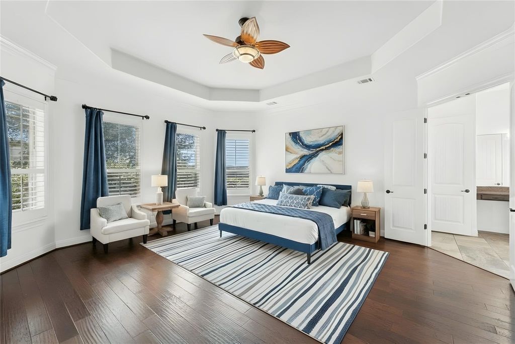 OPEN HOUSE 11/09/25. The best deal to own a Meritage custom-built home with thoughtful designs and upgrades! Step into luxury with this 5,434 sq ft stunning home located within the exemplary Lake Travis ISD. Featuring 5 bedrooms, 4 bathrooms and a 3 car garage. This home offers a gourmet chef's kitchen with a 6 burner cooktop, 4 ovens, stainless steel appliances, a California closet-designed walk-in pantry, a massive center island complemented by a butler's pantry. The main level offers a large primary suite with 2 California closet designed walk-in closets, a jetted tub, a separate shower, double vanities and a full exercise room with a mounted TV. An in-law suite/secondary bedroom with a private bathroom on the main floor. Formal dining room and a custom built study/office perfect for remote work, hardwood floors, custom plantation shutters throughout and a brand new roof with a 20-year warranty. Upstairs, discover 3 additional bedrooms, 2 full bathrooms, a game room, and a custom home theater equipped with Dolby Atmos surround sound and a Sony 4K projector. Oversized 3-car garage features an epoxy floor and custom cabinetry. Outside, entertain effortlessly on the 2-level covered patio with an outdoor fireplace, new gas grill, all set within a beautifully updated landscaped yard. The home is fully wired for Control4 smart home automation, enabling seamless control of lighting, security, doors, and audio/TV from mobile devices or integrated touchscreens throughout the house. Located in the desirable Bella Colinas community, enjoy access to a pool, park, and top-rated schools, all just minutes from the Hill Country Galleria. This exquisite home is waiting for you to make it your own!